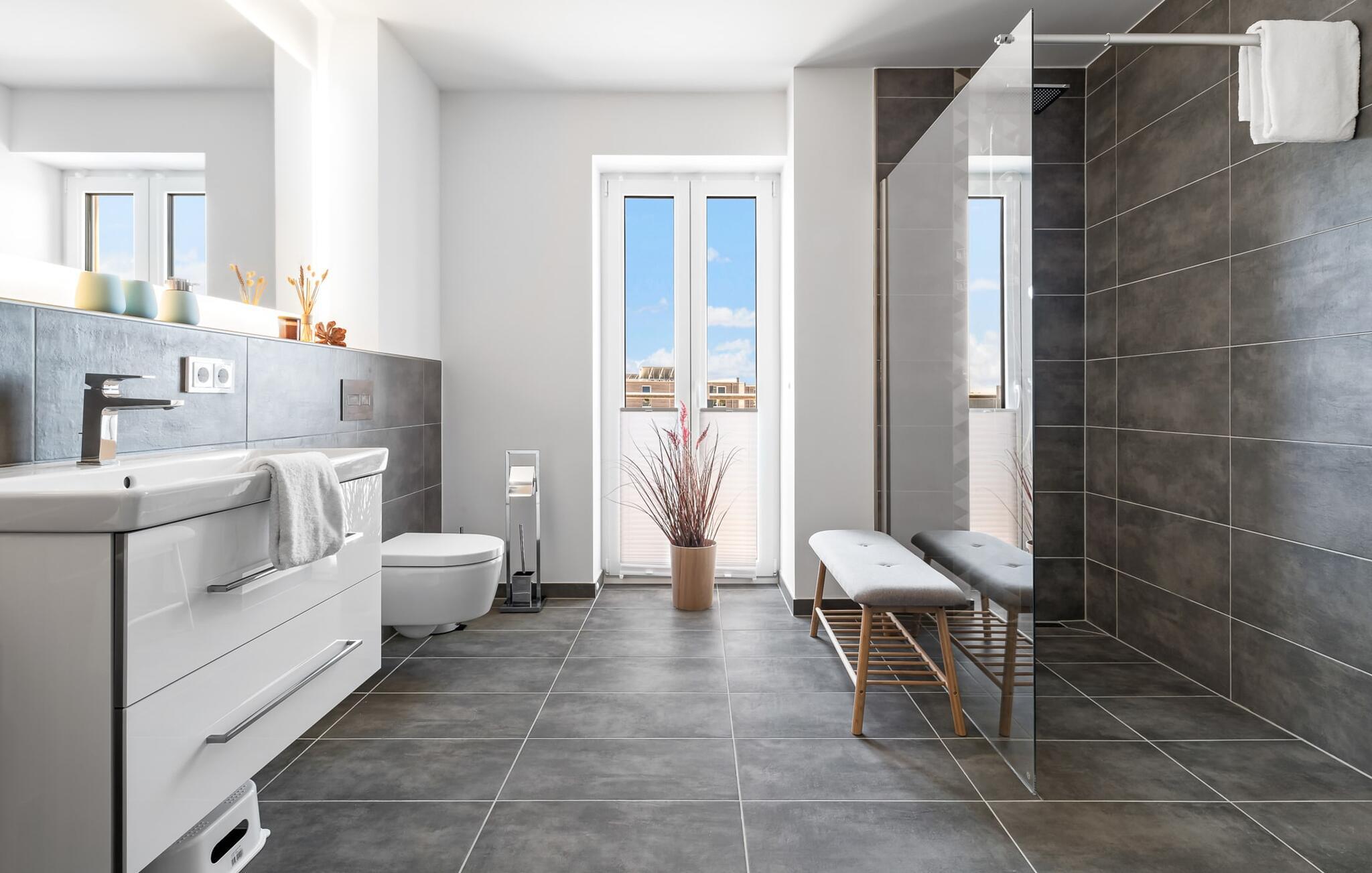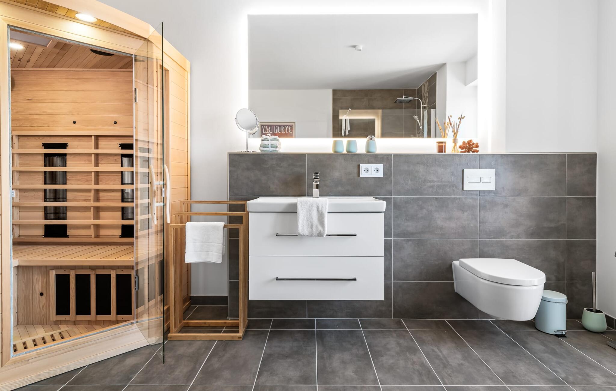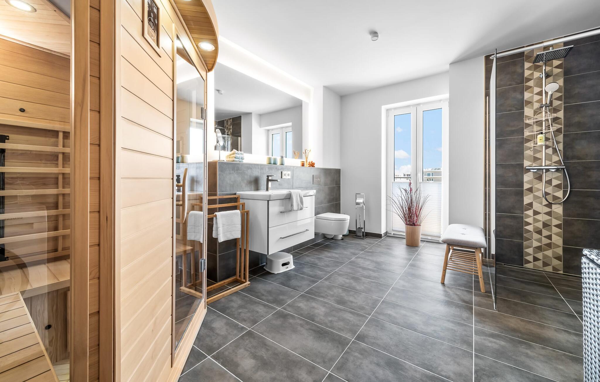 Angrenzend an die Schlafzimmer findet ihr das Duschbad. Neben allem Nützlichen sorgen die bodengleiche Regendusche und eure eigene Infrarot-Wärmekabine für maximalen Urlaubskomfort.