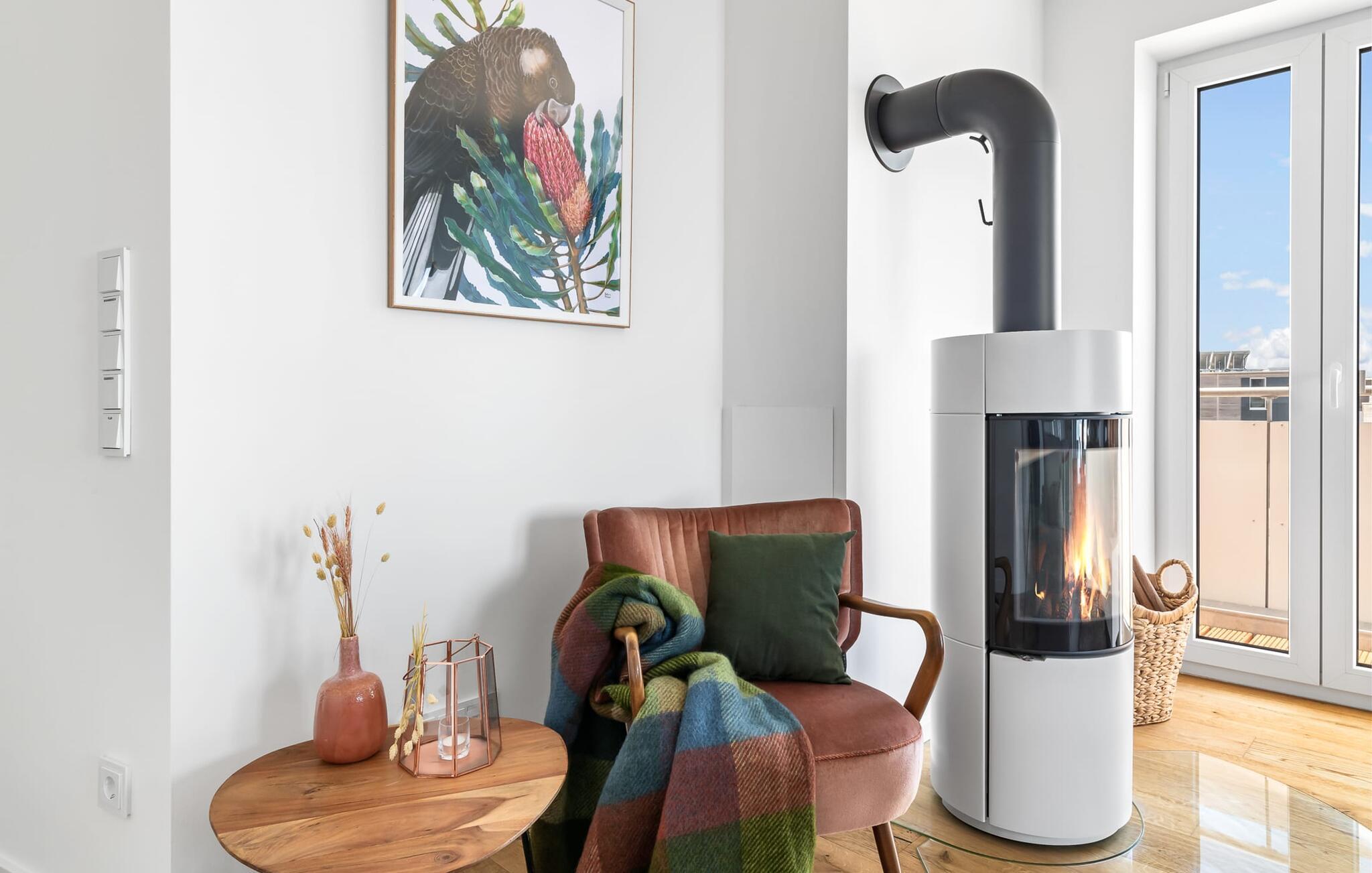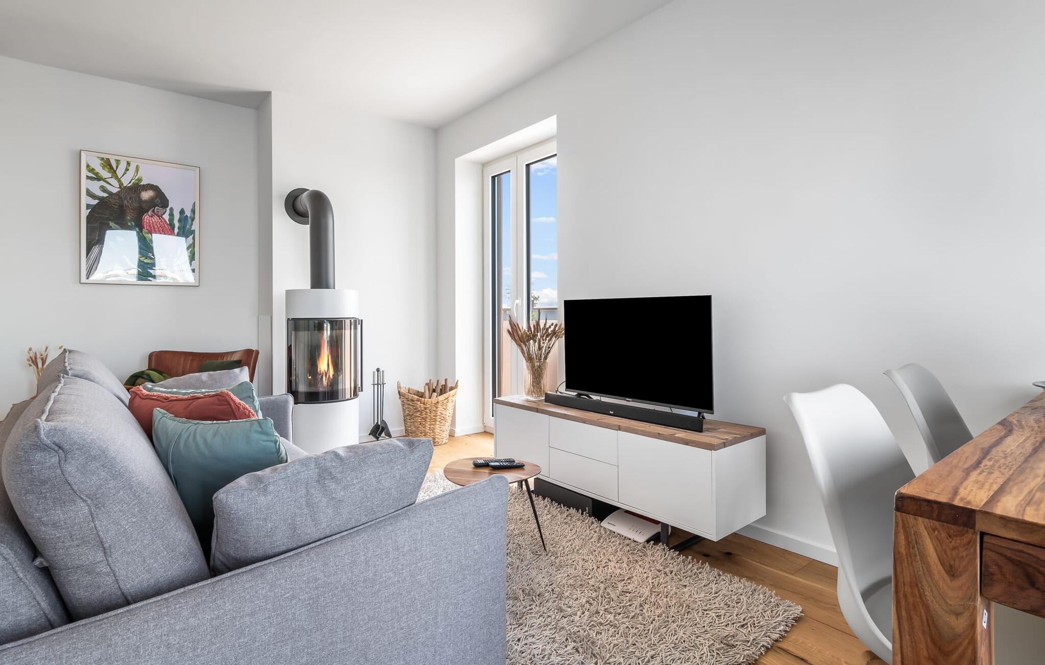Ebenfalls im Wohnbereich findet man ein weiteres Highlight: Wenn die Sonne untergeht und die Temperaturen abkühlen, sorgt der Kaminofen dafür, dass es weiterhin warm und vor allem gemütlich bleibt. Entscheidet euch zwischen prasselndem Kaminfeuer oder Unterhaltung durch den Smart TV mit Möglichkeit zur Nutzung diverser Streaminganbieter. Für Indoor-Entertainment ist in jedem Fall gesorgt.