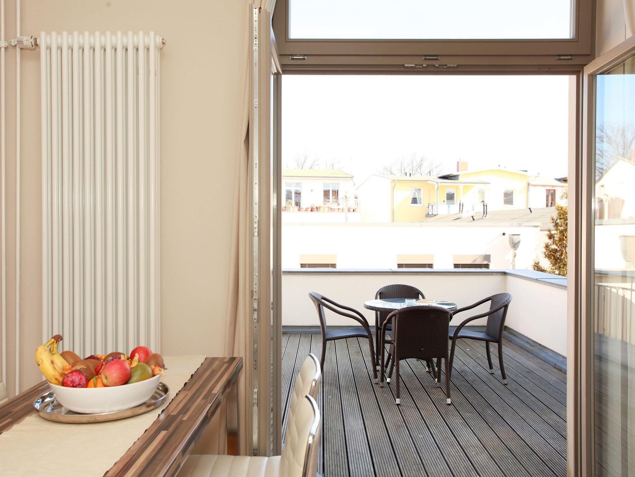 Die 3-Zimmer-Ferienwohnung in Warnemünde im 1. Obergeschoss bietet auf 78 qm Platz für bis zu 6 Personen. Sie ist ausgestattet mit einem Wohnzimmer, zwei separaten Schlafzimmern, Einbauküche und Badezimmer mit Dusche. Das Wohnzimmer verfügt über einen Flachbildschirm, Radio und CD-Anlage. Die Wohnung verfügt über zwei große Terrassen, die mit stilvollen Terrassenmöbeln ausgestattet sind. Hier können Sie wahlweise die Sonne genießen, frühstücken oder den Abend romantisch ausklingen lassen.