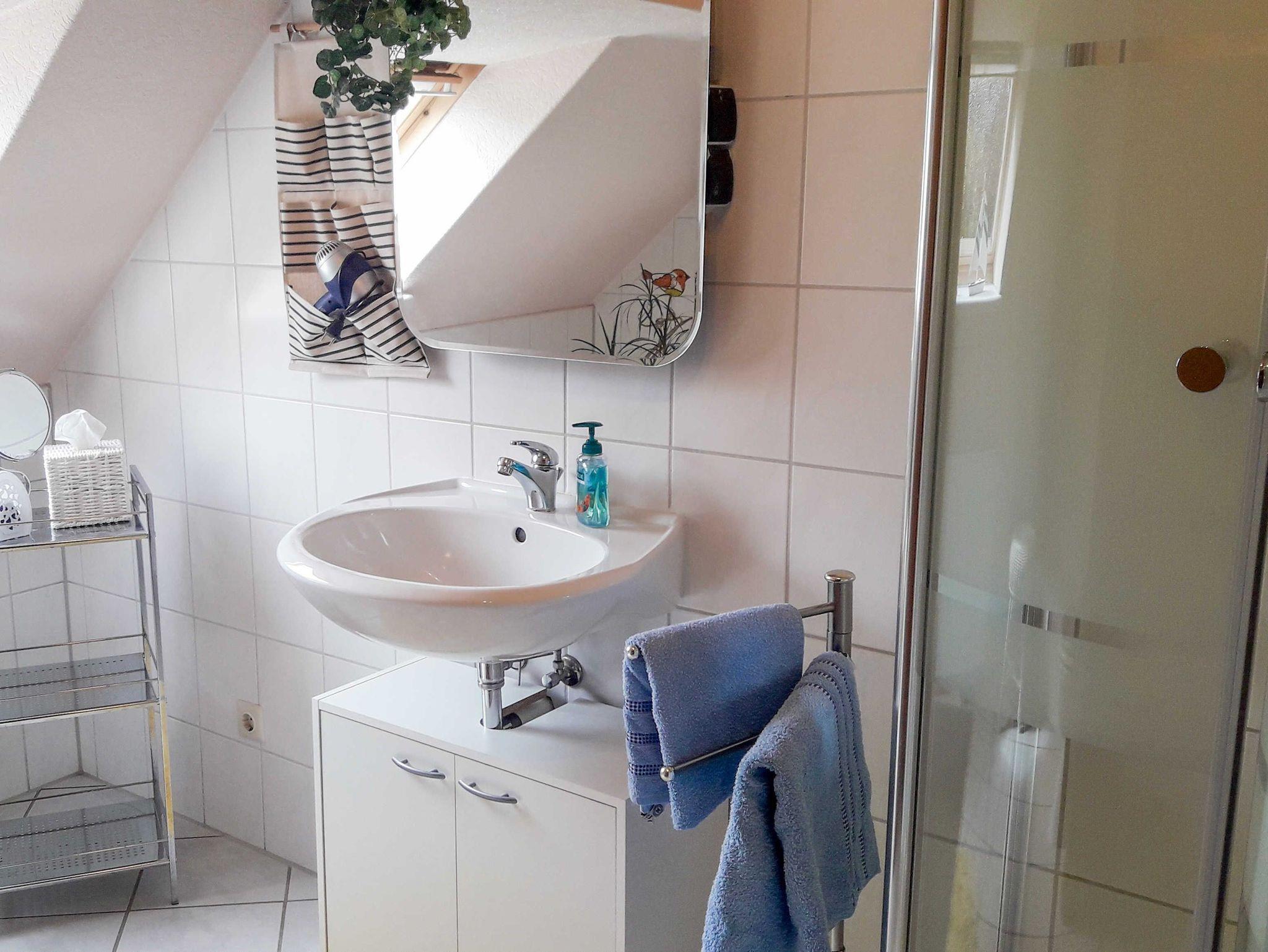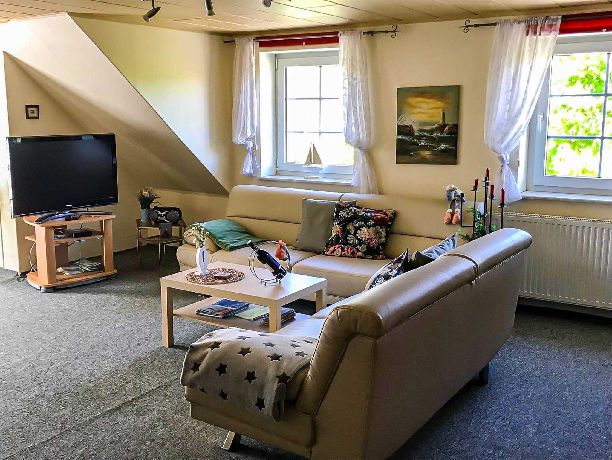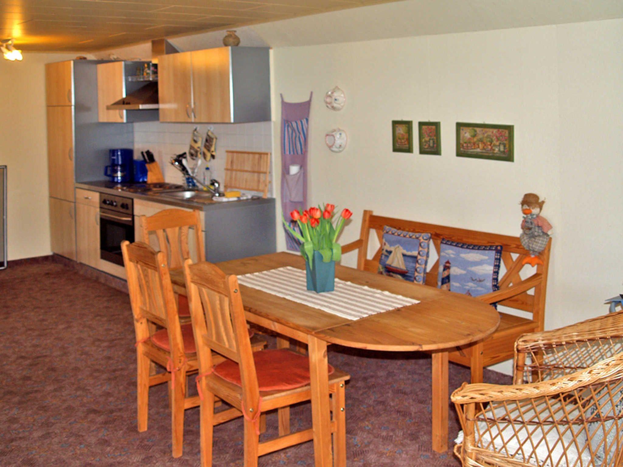 Die Ferienwohnung mit separatem Eingang befindet sich in der 1. Etage unseres Hauses und besteht aus 3 Zimmern mit dazugehörigem großen Balkon. Das Wohnzimmer mit integrierter Küche hat eine große Kuscheleckchouch zum Ausziehen, Sat-TV und Radio. Die Einbauküche ist ausgestattet mit E-Herd und Backofen, Kühl- und Gefrierschrank, Mikrowelle, Kaffeemaschine, Toaster etc. Eine Kiefernholzsitzgruppe (vier Stühle mit gemütlicher Bank) rundet den Essbereich ab. Das Bad verfügt über Dusche und WC.