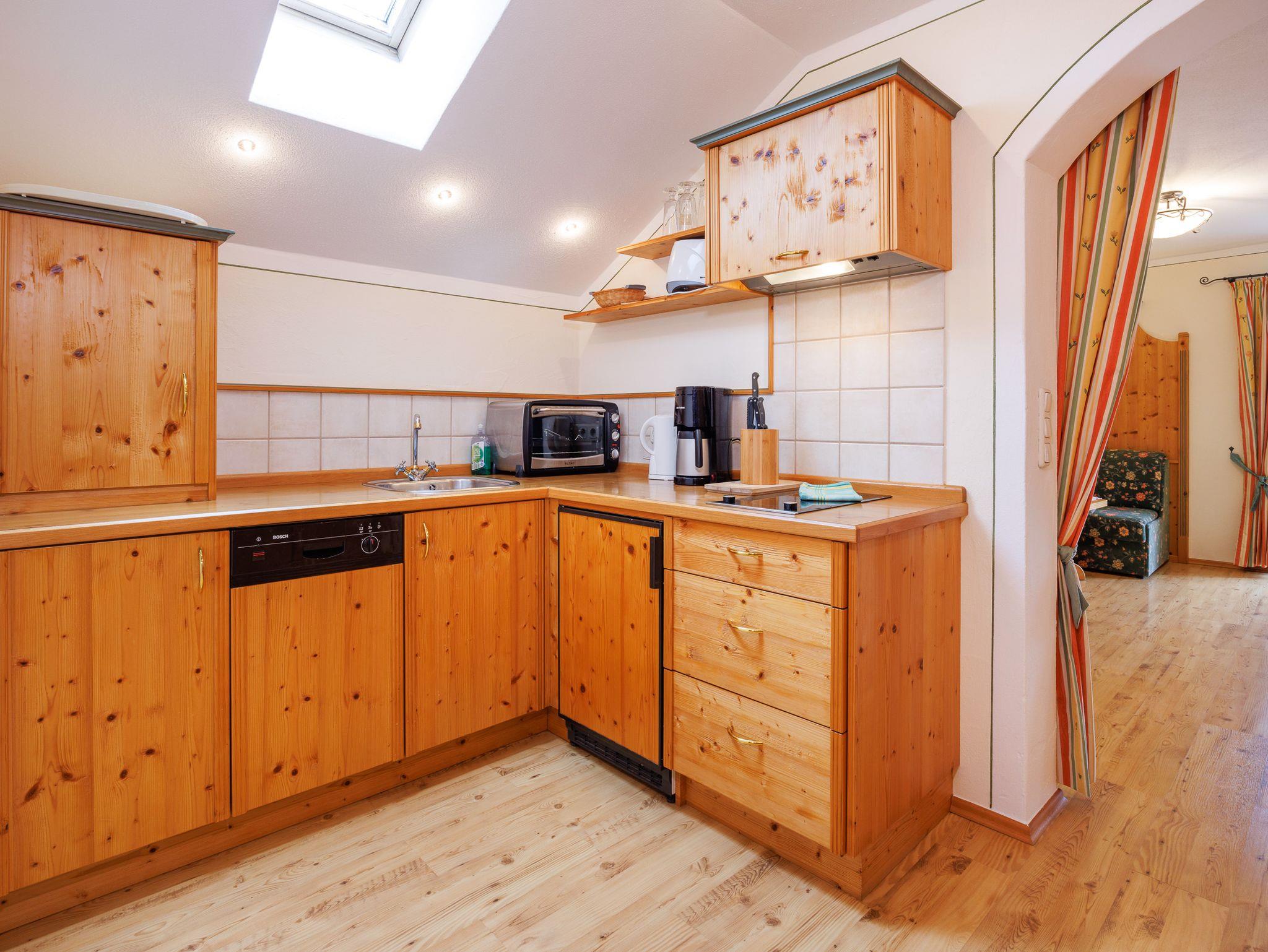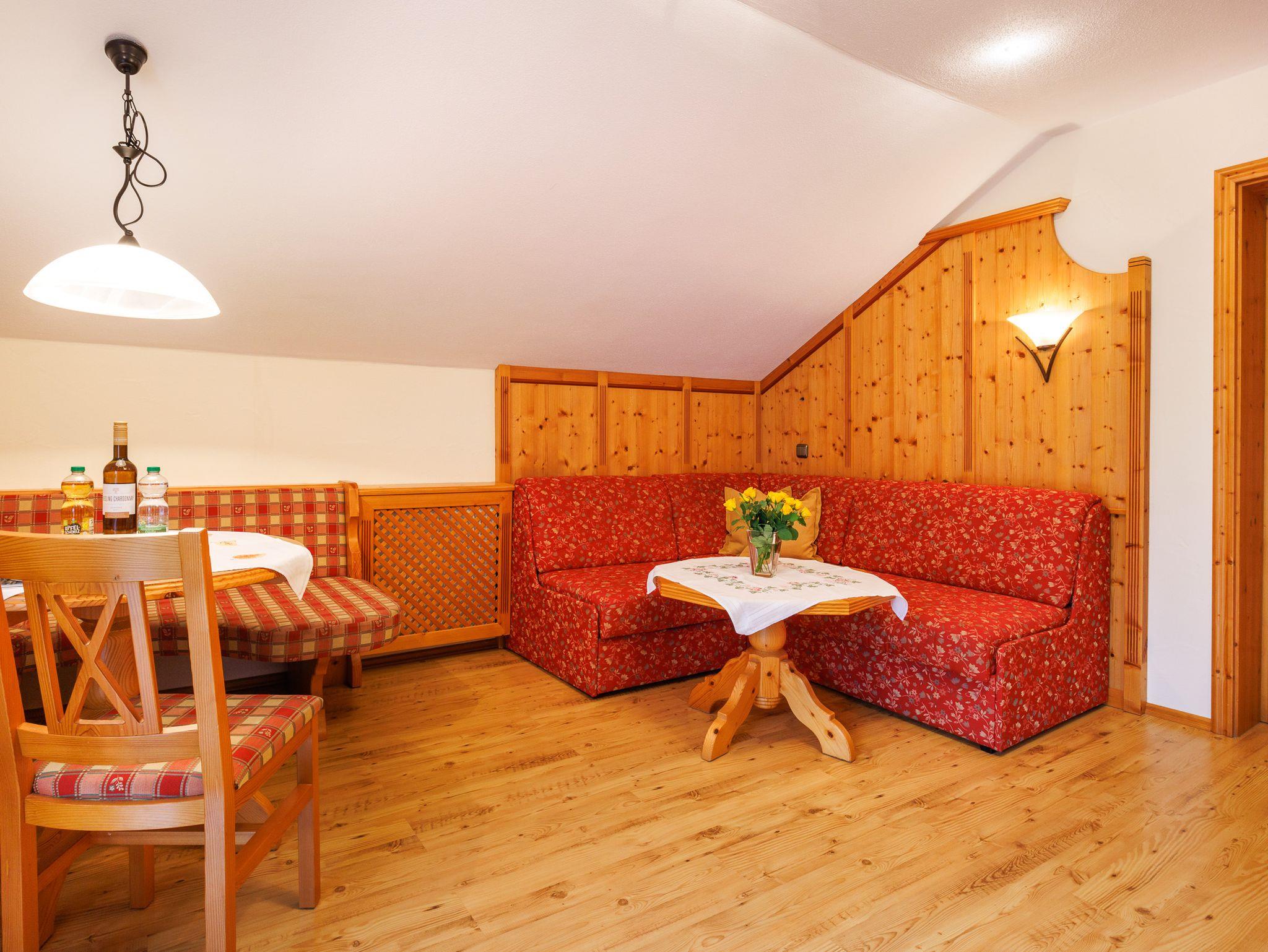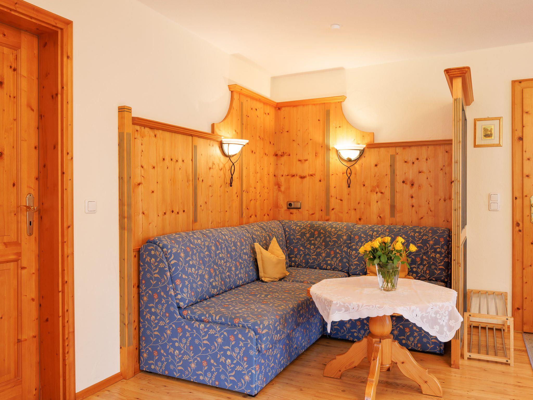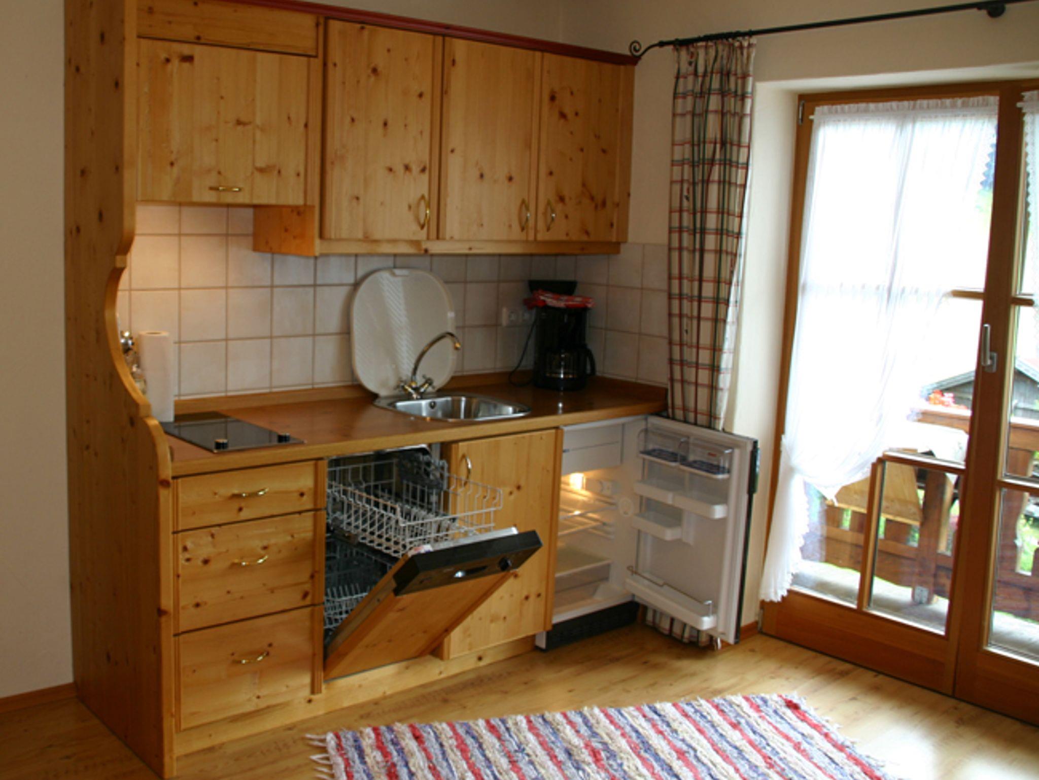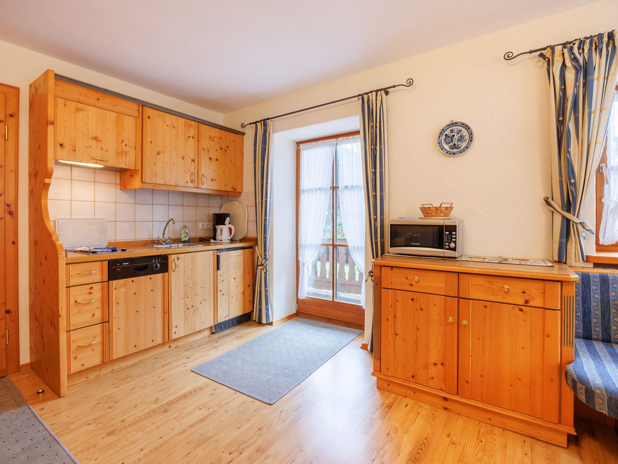 Unsere Ferienwohnungen bietet auf 48 m² ausreichend Platz für 2 Personen. Mit der leichten Dachschräge und den teilweise abgerundeten Türrahmen besticht die Ferienwohnung durch ein außergewöhnlich gemütliches Ambiente. Der Wohn-Essbereich ist im bayerischen Landhausstil eingerichtet und verfügt über eine Essecke sowie eine gemütliche Couch und einen Fernseher. Vom Wohnzimmer aus gelangen Sie auch auf den großen Balkon mit Sitzgelegenheit und Sonnenschirm. Im Wohn-Essbereich befindet sich die offene und komplett ausgestattete Küche. Im Badezimmer finden Sie eine Dusche und ein WC.