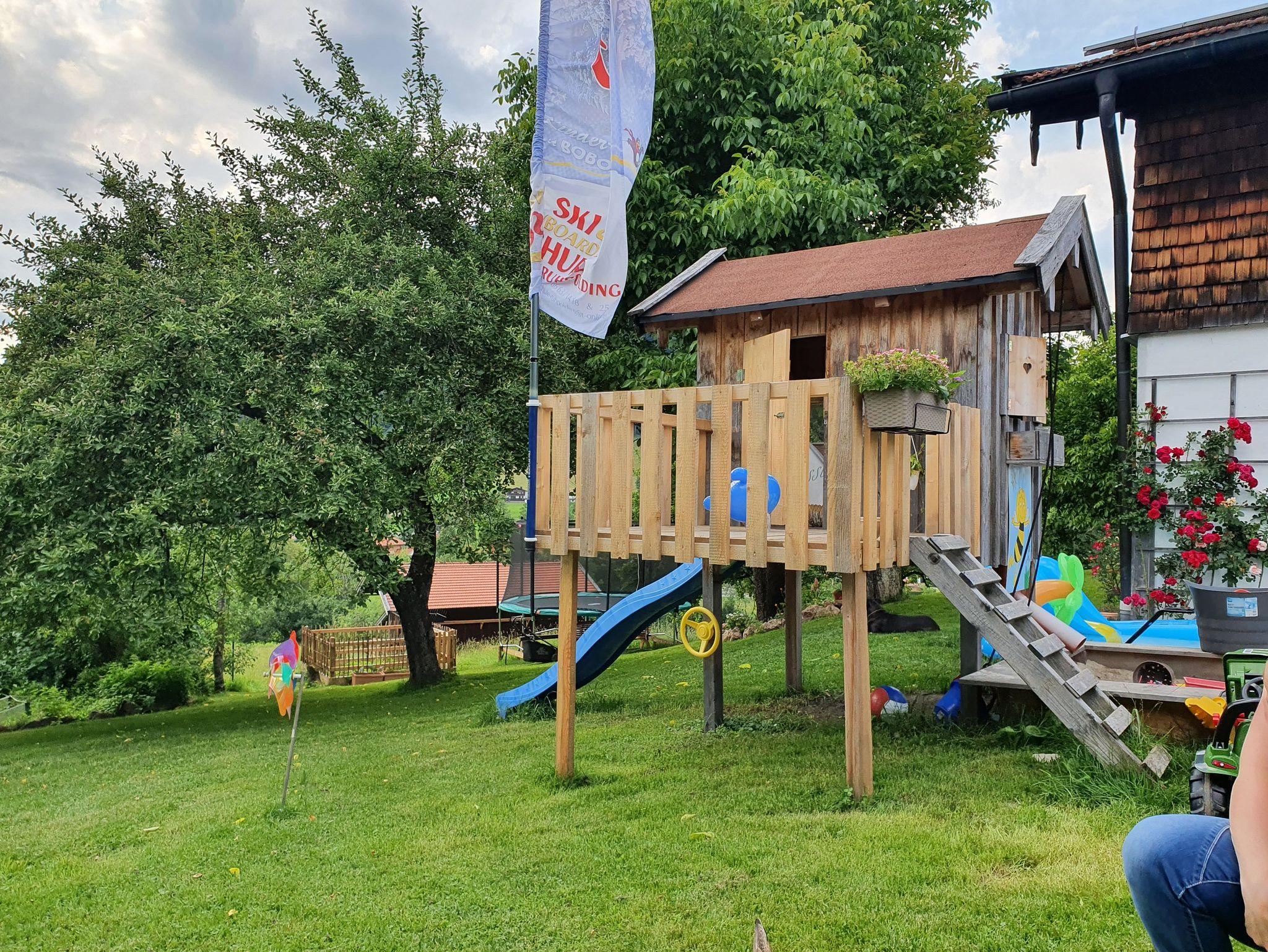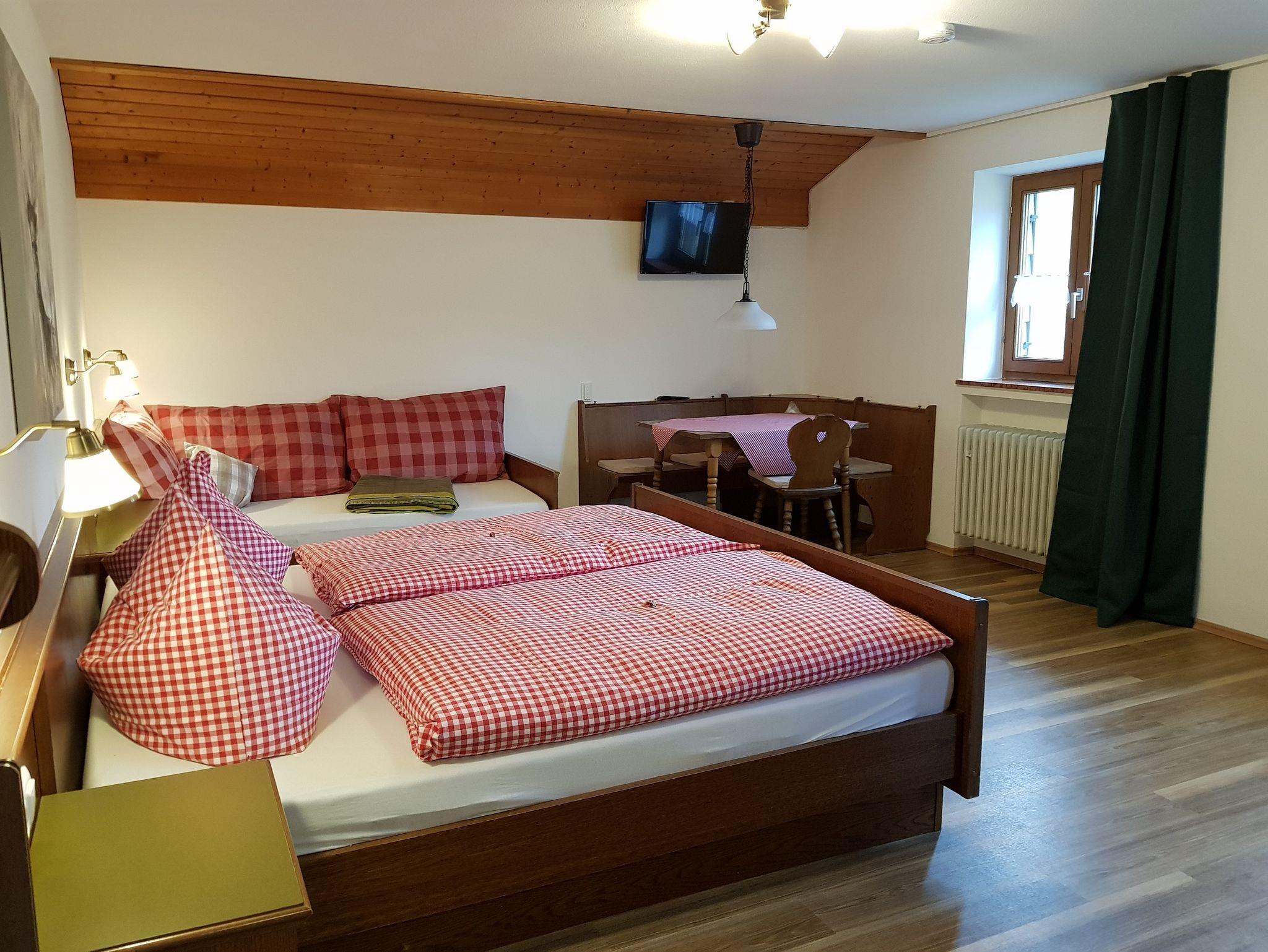 Hier bieten wir Ihnen unser größtes Zimmer, welches perfekt für einen Aufenthalt mit einer dritten Person, z. B. einem älteren Kind, ausgestattet ist. Es handelt sich um ein gemütliches Dreibettzimmer im modern-rustikalen Stil. Das Zimmer verfügt über ein Doppelbett, ein separates drittes Bad, Dusche/WC mit Fenster, Eckbank mit Esstisch, TV, WLan und einen Zimmersafe. Über eine Balkon erhalten Sie direkten Zugang zu einem unserer zwei großen Holzbalkone. Dieser ist mit einer Sitzgarnitur ausgestattet, so dass Sie den wundervollen Blick auf die umliegenden Berge und die reichhaltige Natur entspannt genießen können . Von dort aus können Sie auch einen Blick auf unsere Hühner und Schafe werfen. Ein Babybett können wir Ihnen auf Anfrage gerne zusätzlich zur Verfügung stellen. Um Ihnen einen optimalen Start in den Tag zu ermöglichen servieren wir Ihnen morgens ein reichhaltiges Frühstück in unserem Frühstücksraum. Hierbei legen wir besonderen Wert auf regionale Produkte aus der unmittelbaren Umgebung. Der Frühstücksraum/Aufenthaltsraum mit integrierter kleiner Teeküche steht Ihnen den ganzen Tag zur Verfügung. Sie können die zwei Kochplatten sowie den Kühlschrank zur Selbstverpflegung nutzen.
