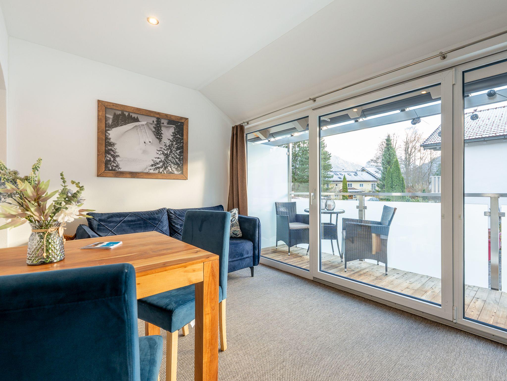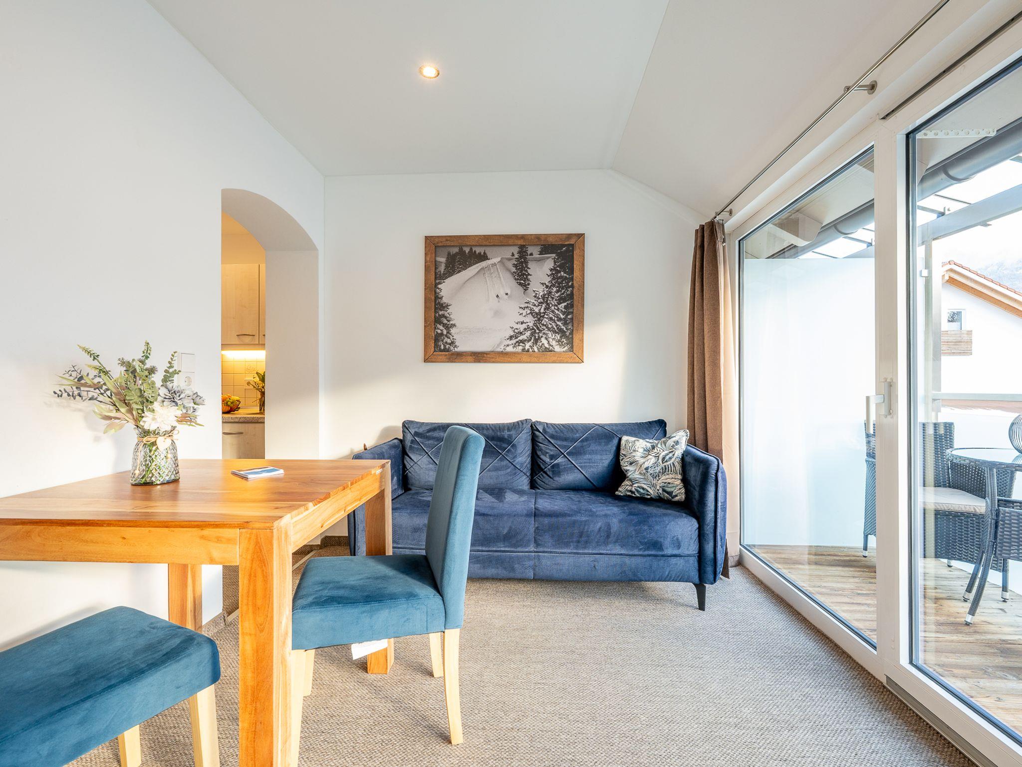 Die große Glasfront öffnet sich zum Balkon und lässt viel Tageslicht herein – genießen Sie dort Ihren Morgenkaffee mit Blick auf die Berge oder den Abend in stiller Atmosphäre.