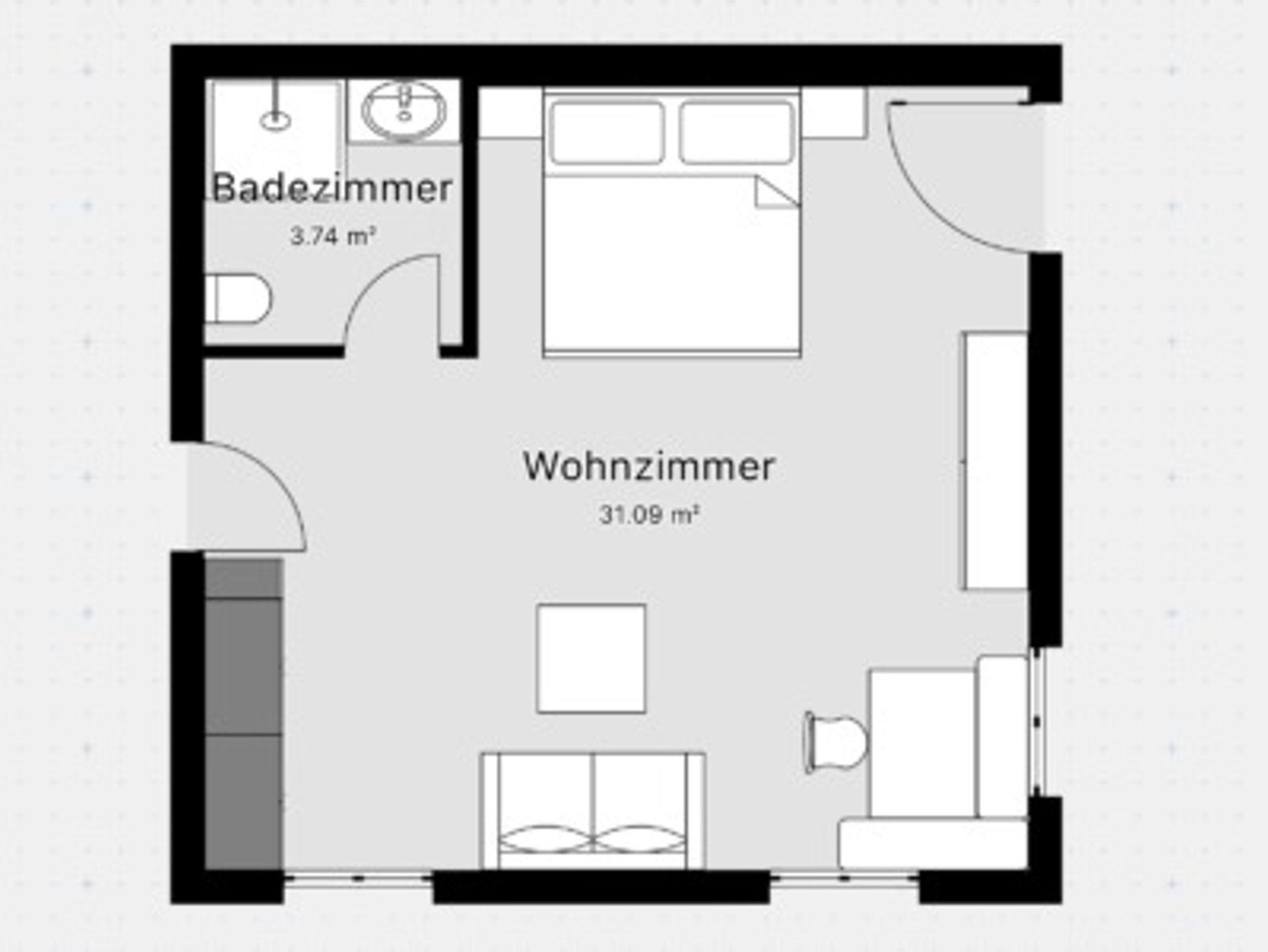 Gemütlich und liebevoll vom Schreiner eingerichtetes Einzimmerappartement mit Doppelbett. Weitere Personen auf Anfrage möglich. Küchenzeile inkl. Geschirrspüler und Backofen, Bad mit Dusche und WC.