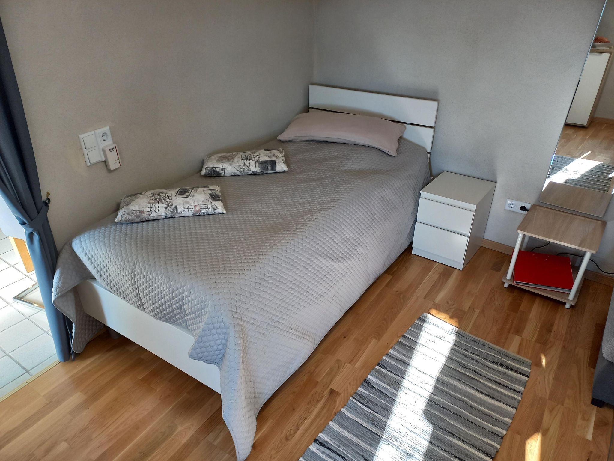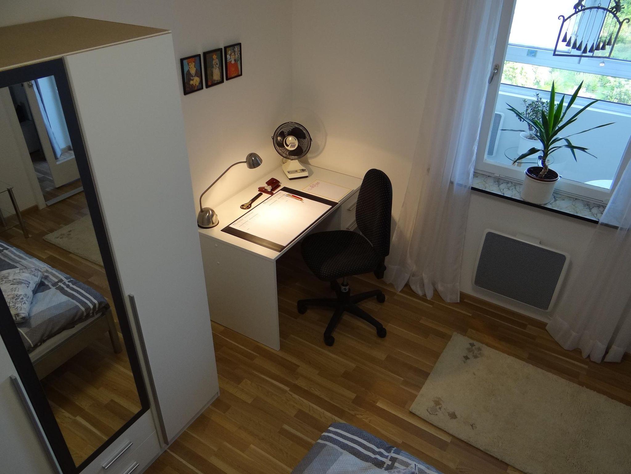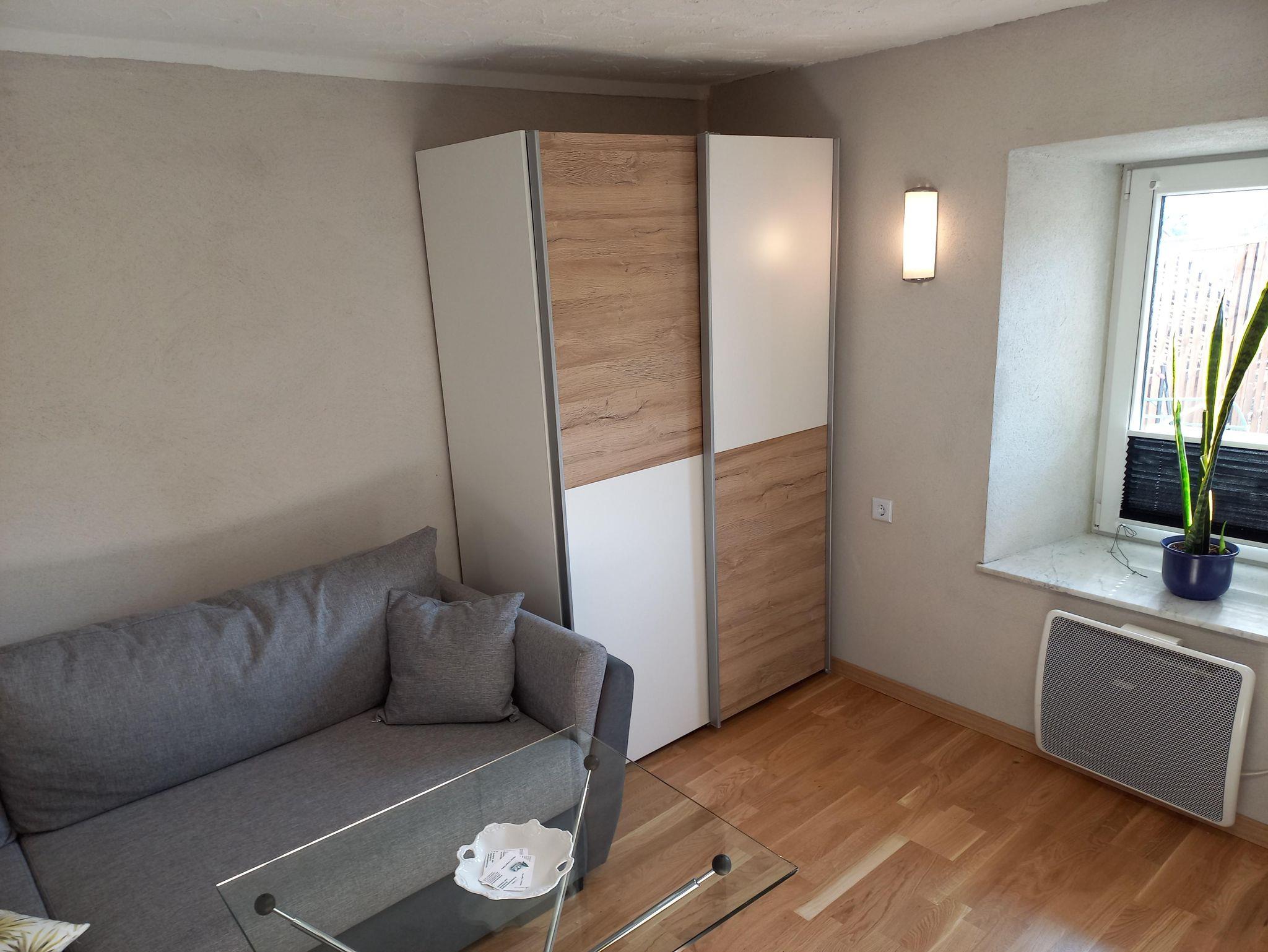 Wohn-Schlafzimmer: Kleiderschrank, Kommode, Bett 100 x 200 cm, Beistellbett 90 x 200 cm, bequeme Couch, WLAN kostenlos.