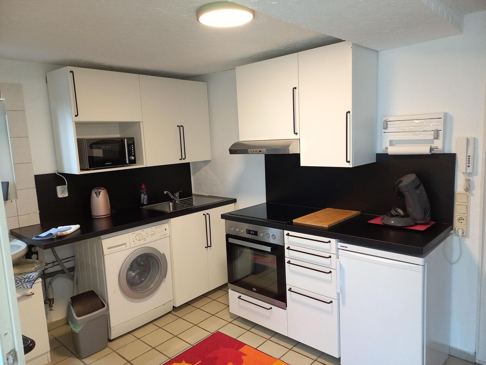 Wohn-Kochküche, mit Waschmaschine, Mikrowelle, Elektroherd mit Ofen, Kühlschrank, Kaffeemaschine, Toaster und Wasserkocher.