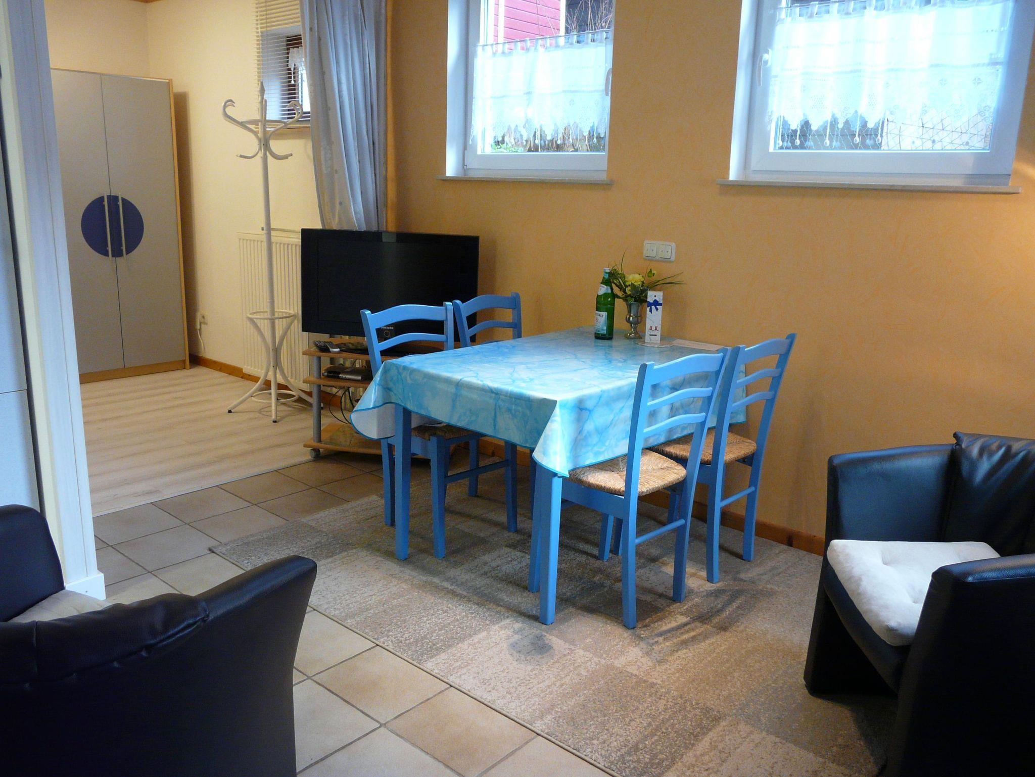 Ein-Zimmer-Appartement 36 qm - Einliegerwohnung im Souterrain - mit Doppelbett, Wohnbereich, Essbereich mit Küchenzeile, SAT-TV, Bad mit Dusche und WC, eigene Terrasse, abschliessbarer, wintergartenähnlicher Vorbau (8 qm), eigener Eingang