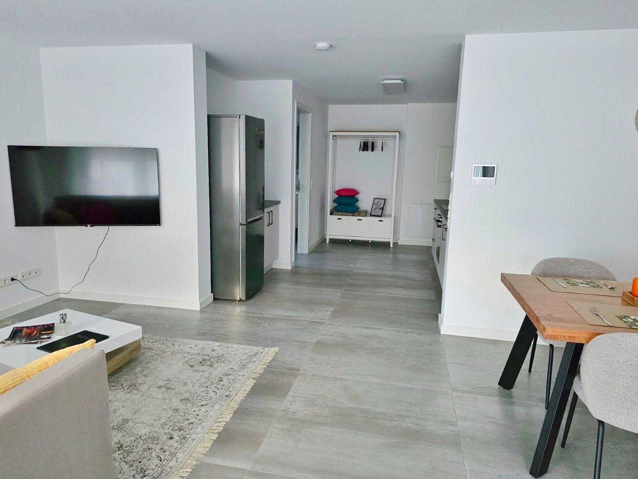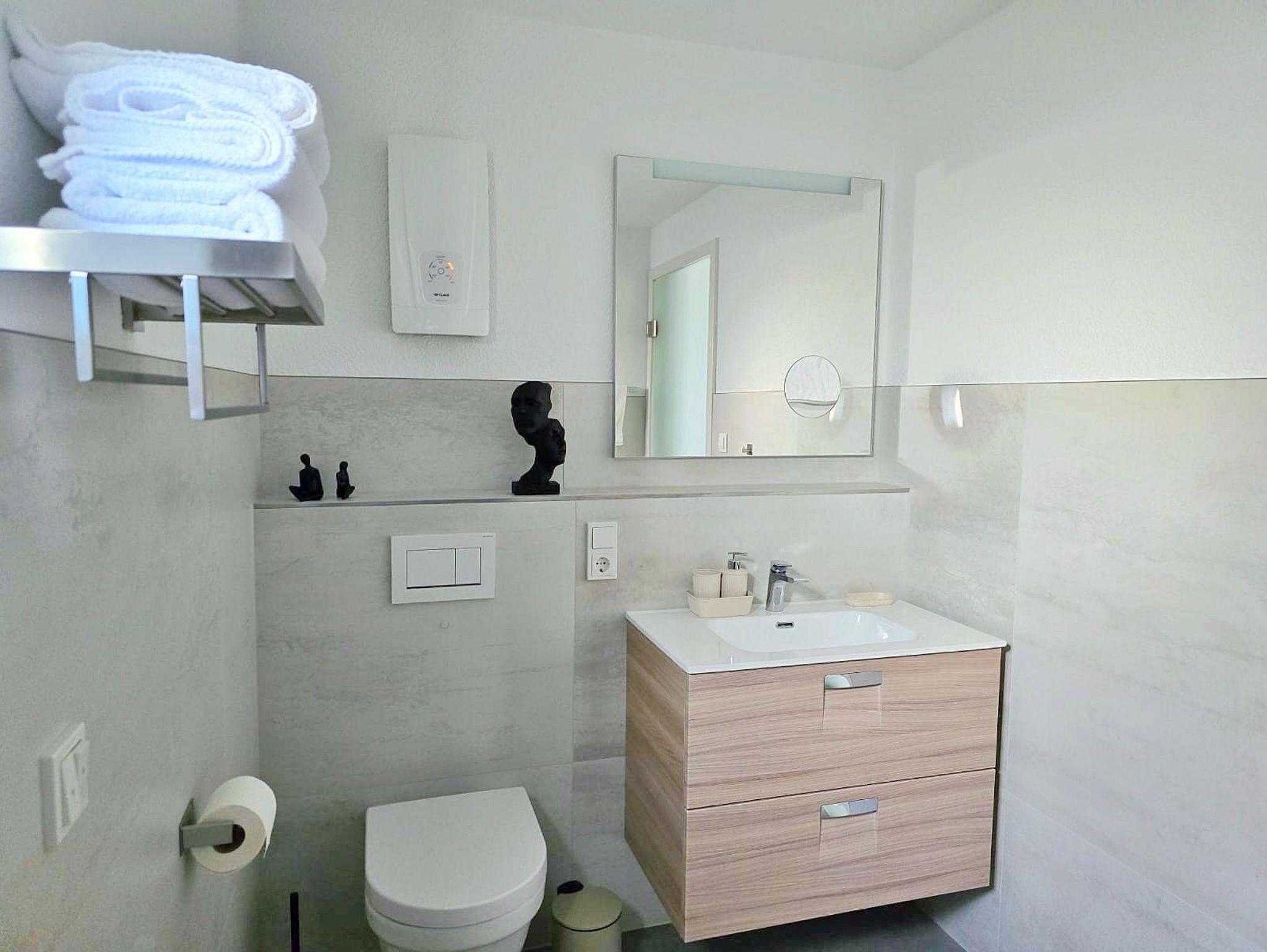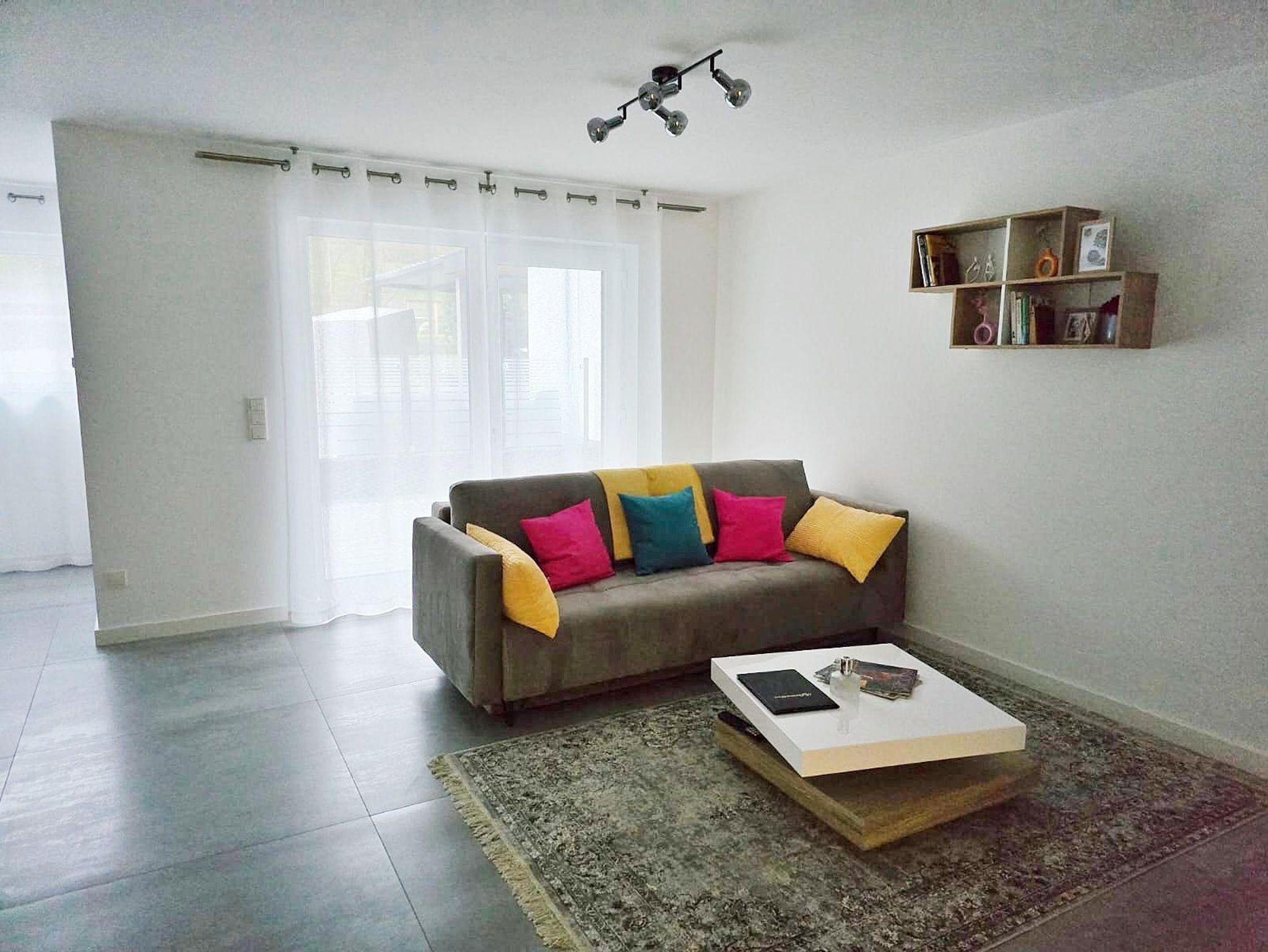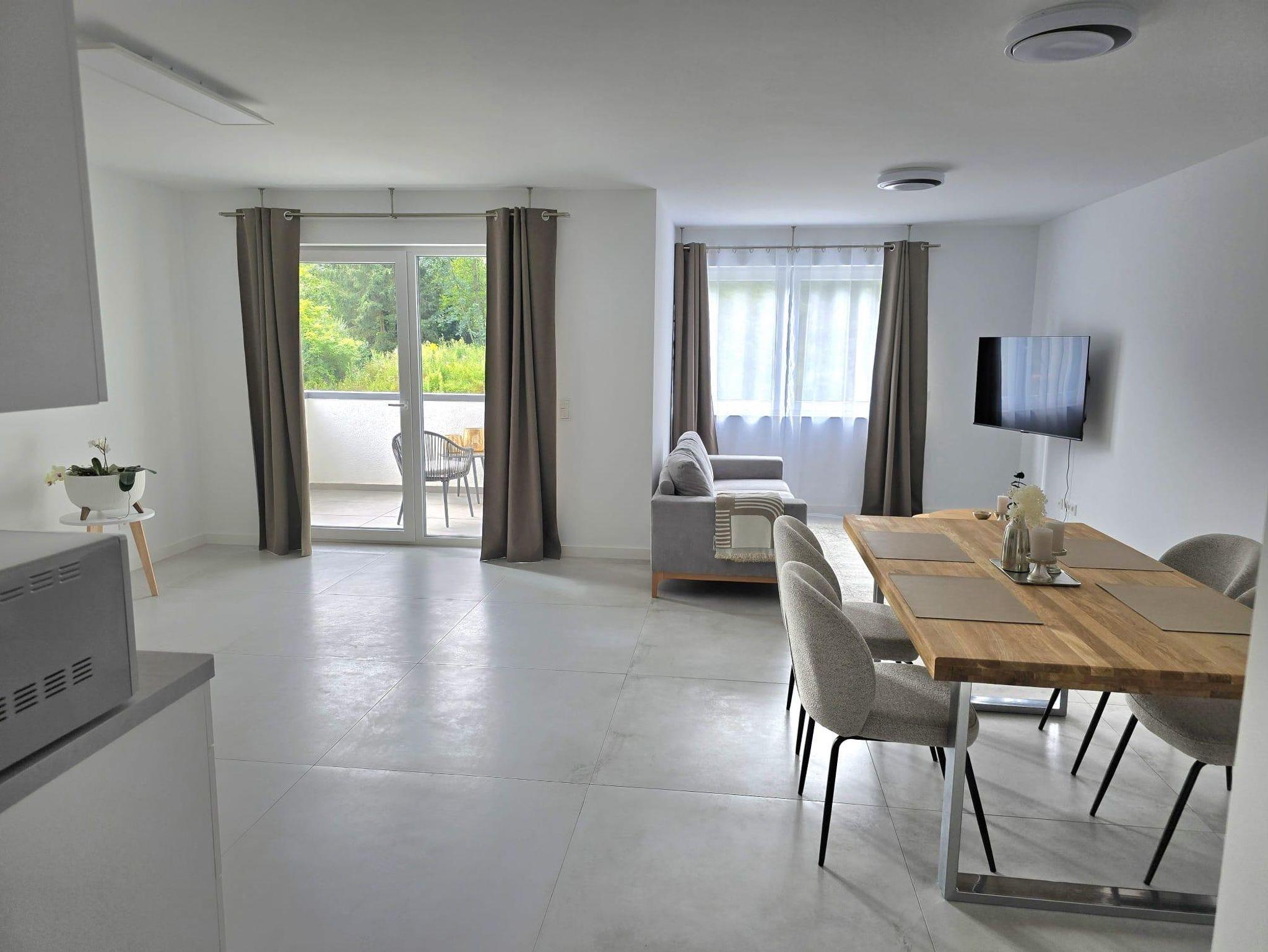 Mit einer Wohnfläche von ca. 65 qm laden wir Sie herzlich in unsere neu gebaute und moderne Ferienwohnung ein. Der offene Wohnraum umfasst einen großzügigen Wohn-, Schlaf- und Essbereich und eine offene, gut ausgestattete Küche. Vom Wohn-, Schlaf- und Essbereich haben Sie direkten Zugang zur überdachten Terrasse mit Sitzgarnitur, auf der Sie den Abend bei einem Glas Wein ausklingen lassen können. Darüber hinaus gibt es ein geräumiges Badezimmer mit ebenerdiger Dusche und WC.