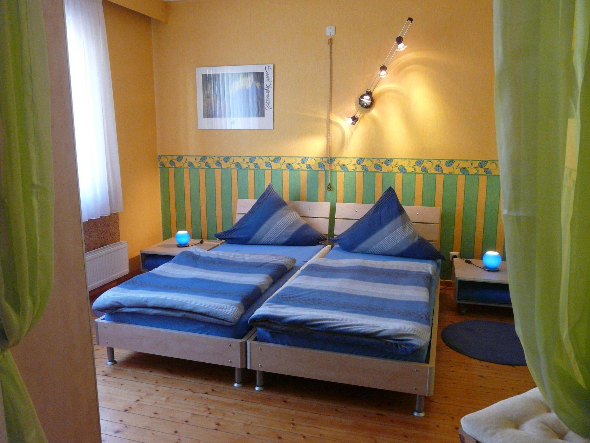 Ferienwohnung mit 56 qm im Erdgeschoss mit Wohnzimmer mit SAT-TV, sep. Schlafzimmer, komplett eingerichtete Küche mit Esstisch und Frühstückstheke, Südbalkon, Bad mit Dusche und WC, eigener Eingang