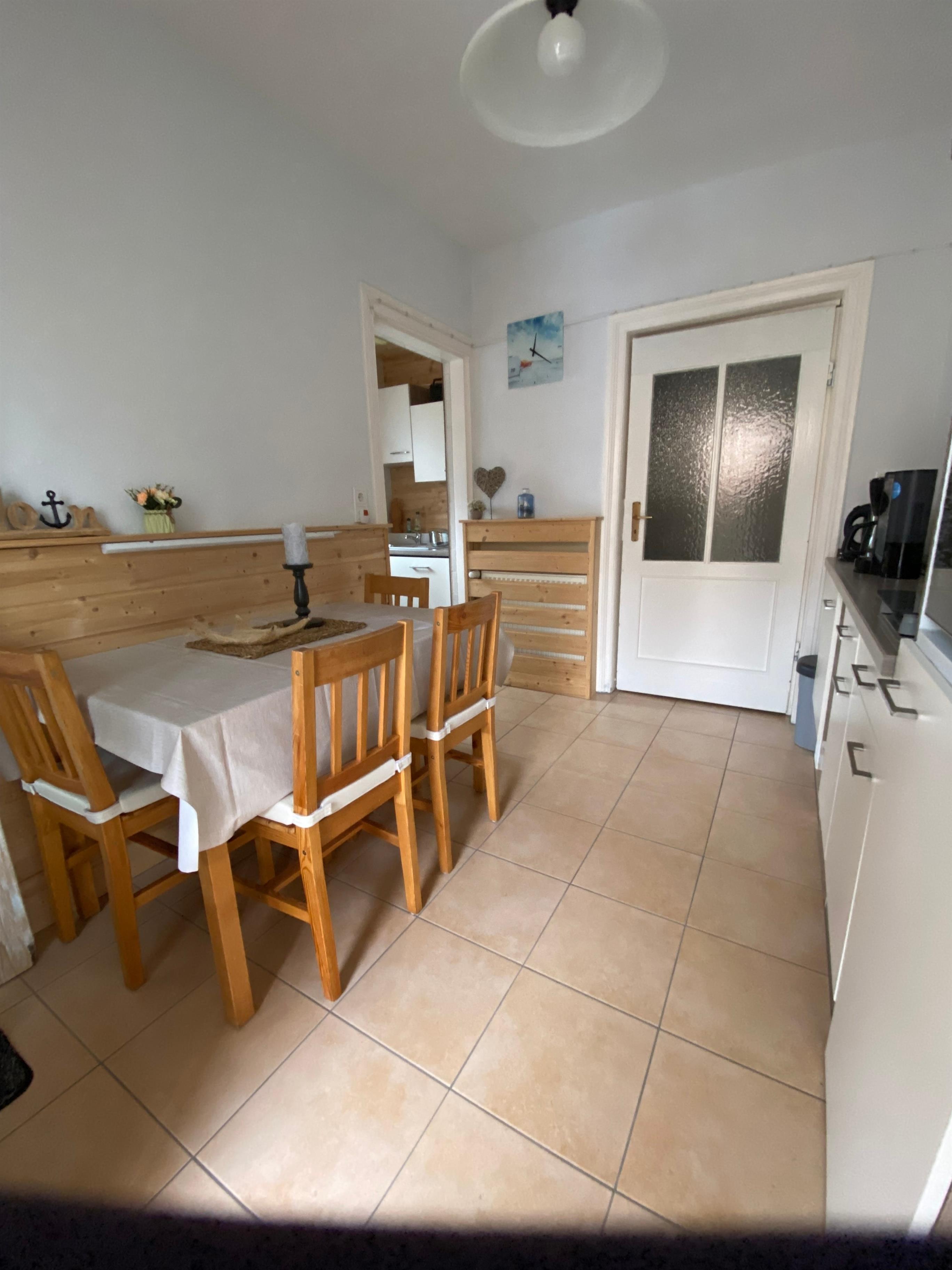 Unsere 2,5 Raum-Wohnung (EG) bietet Ihnen Platz für Ihr wohnen auf Zeit bei uns. Im Gewölbezimmer im Souterrain verbirgt sich ein gemütliches Wohnzimmer. Es verfügt über ausreichend Sitzmöglichkeiten mit Fachbild-SAT-TV, Radio und WLAN. Für die Gemütlichkeit sorgt hier ein elektrischer Kamin. Im Schlafzimmer steht für Ihren geruhsamen Schlaf ein Doppelbett mit hochwertigen elektrischen Lattenrosten (160x 200 Meter) bereit. Hier ist ebenfalls eine bequeme Couch die als Schlafgelegenheit umfunktioniert werden kann. Die Couch hat eine Liegefläche von 90 x 200Meter. Der Fußboden ist mit Holzdielen ausgestattet. Die voll ausgestattete Wohnküche hält alles bereit (Kühlschrank mit Gefrierfach, Herd mit 2 Platten Ceranfeld, Kombigerät mit Backofen, Mikrowelle und Dampfgarer, einen Geschirrspüler und natürlich eine Kaffeemaschine, Toaster und Wasserkocher. Sie ist somit hervorragend ausgestattet. Zum Essen setzen Sie sich an den Esstisch oder einfach auf die eigene Terrasse vor der Wohnung. Das Dusch-/Badezimmer ist modern eingerichtet.