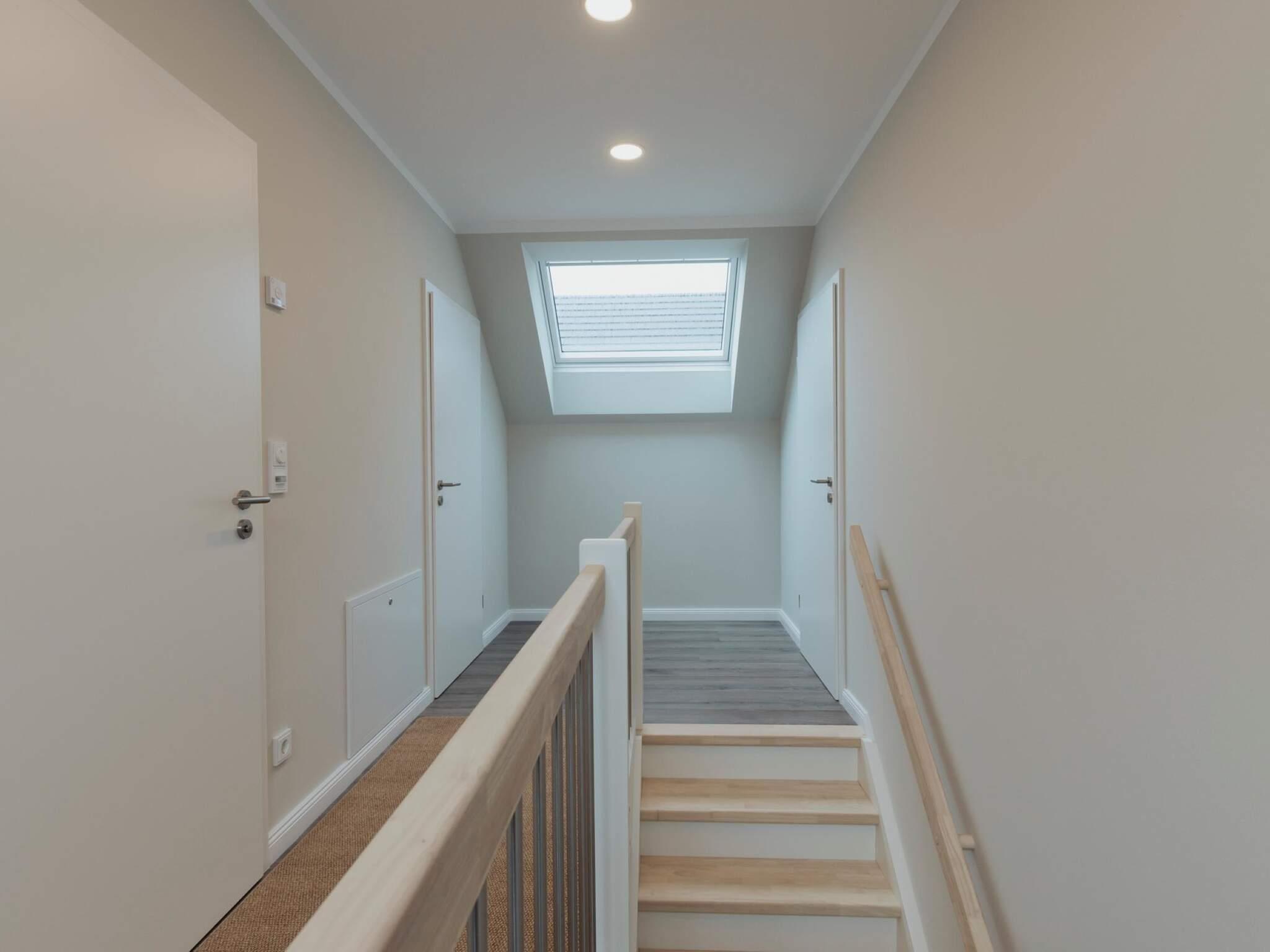 Ausschlafen, kochen, faulenzen: Im geräumigen Familienhaus kommt jeder zu seinem Recht. Die ca. 120 m2 Wohnfläche verteilen sich optimal auf die beiden Etagen. Im Obergeschoss gibt es vier Zimmer, sowie ein Vollbad, das über ein Dachfenster Tageslichtbeleuchtung hat. Die Schlafzimmer mit hochwertigen Boxspringbetten (in den Größen 1,60 x 2,10 Meter, sowie 1,80 x 2,10 Meter) von bester Qualität, laden zum Ausschlafen ein. In den maßgefertigten Einbauschränken finden Sie genügend Stauraum für alle.