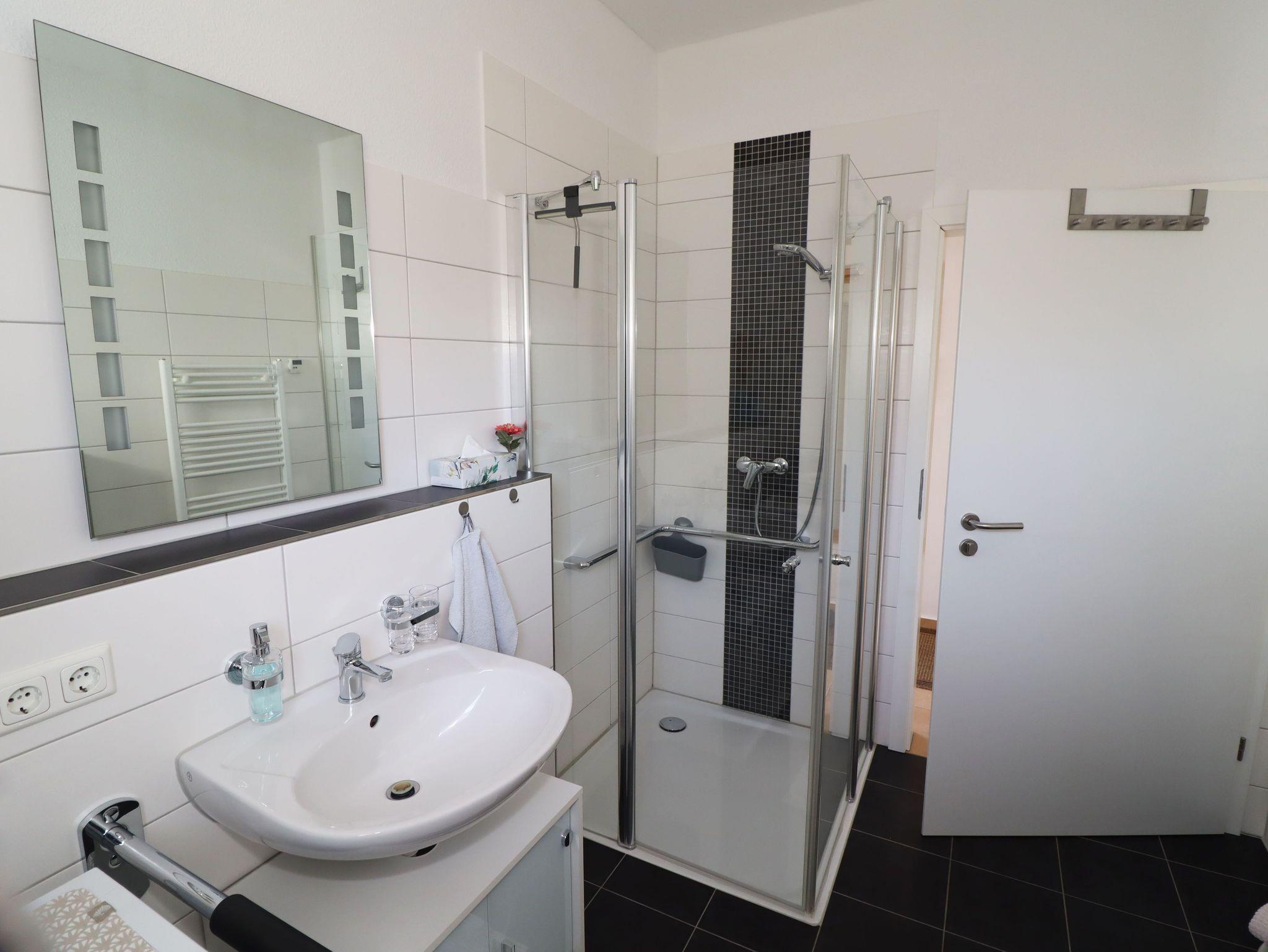 Das im Jahr 2013 neu erbaute altersgerechte Ferienhaus hat eine Größe von 53 m² und ist ausgestattet mit Fußbodenheizung, kontrollierter Be- und Entlüftungsanlage, es ist umweltbewusst durch Photovoltaik und Geothermie. An den Fenstern sind Außenjalousien. Die Einbauküche enthält neben dem Herd mit Backofen einen Geschirrspüler und eine Mikrowelle, eine Kaffeemaschine sowie einen Wasserkocher. Eine Tiefkühlmöglichkeit ist im Haus des Vermieters vorhanden. Im Ferienhaus befindet sich außer dem kombinierten Küchen-/Wohnbereich ein Schlafzimmer mit zwei Betten, die als Doppelbett oder auf Wunsch als zwei Einzelbetten genutzt werden können. Die Betten haben eine komfortable Höhe. Das zweite Schlafzimmer verfügt über ein Bett, welches bei Bedarf ausgezogen und als weitere Schlafgelegenheit verwendet werden kann( 0,80 x 1,70m). Falls erforderlich, wird für Babys und Kleinkinder ein Kinderreisebett zur Verfügung gestellt. Ein Kinderhochstuhl ist ebenfalls vorhanden. Der Wohnbereich umfasst eine Couch mit Tisch, einen Fernseher und DVD-Player, weiterhin befindet sich hier der Esstisch mit vier Stühlen. Das Bad ist ausgestattet mit Dusche, Waschmaschine, Fön und verfügt über ein Fenster. Bettwäsche und Handtücher sind inklusive. Auf Wunsch kann die Mehrwertsteuer ausgewiesen werden.