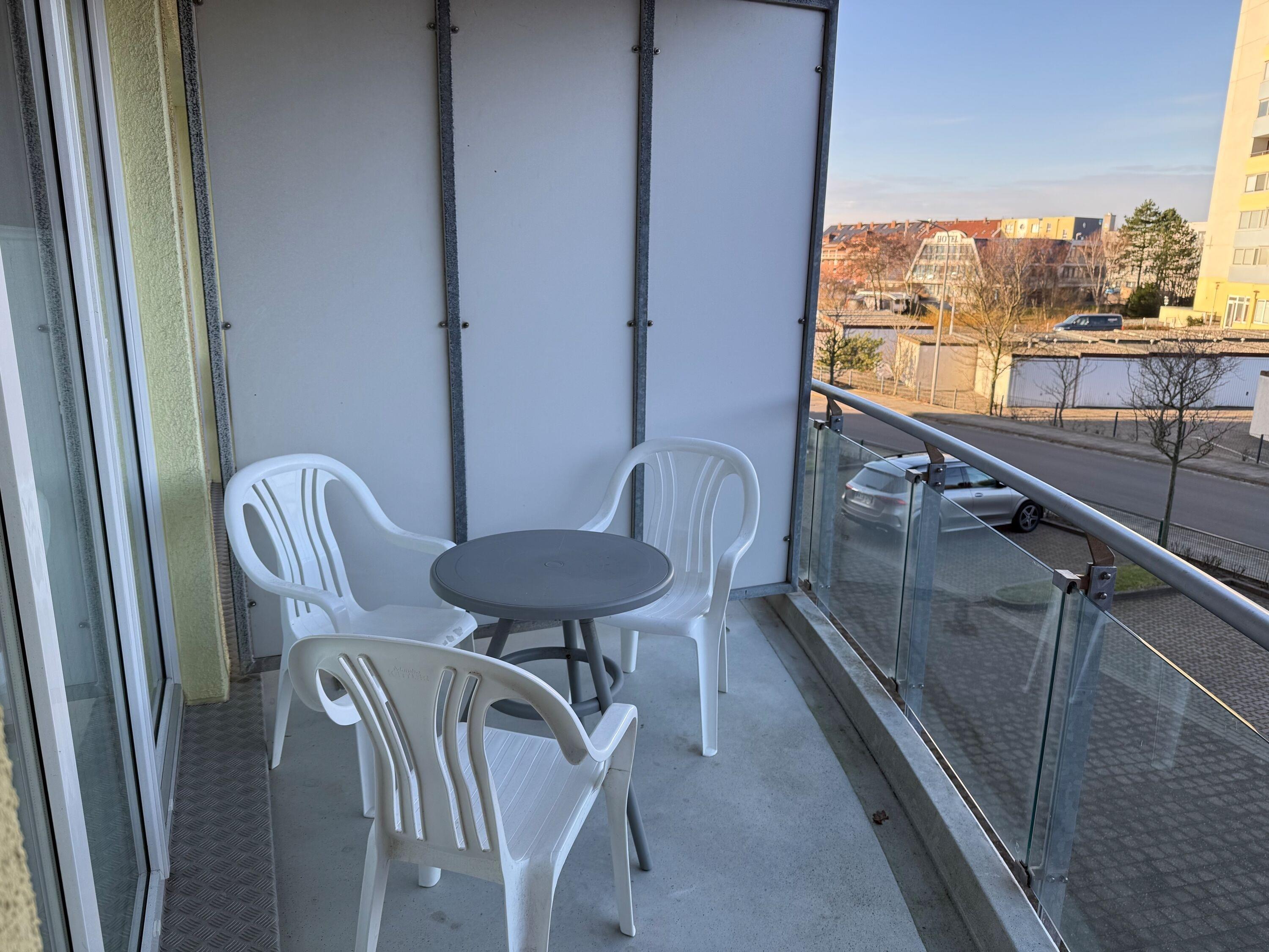 3 Zimmer Wohnung im 1. Obergeschoss für bis zu 3 Personen, 1 Schlafzimmer mit Doppelbett und Kleiderschrank und Zugang zum Balkon, 1 innenliegendes Schlafzimmer mit Einzelbett, Wohnzimmer mit Einbauküche (Backofen, Cerankochfeld, Mikrowelle, Kaffeemaschine, Wasserkocher, Toaster), gemütlicher Sitzecke mit Ecksofa, Essplatz, TV und Zugang zum Balkon, Bad mit Waschbecken, Badewannendusche, WC, Fahrstuhl im Haus, reservierter PKW Stellplatz, Nichtraucherwohnung.