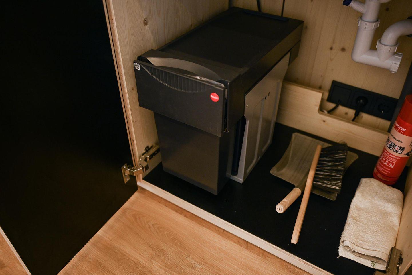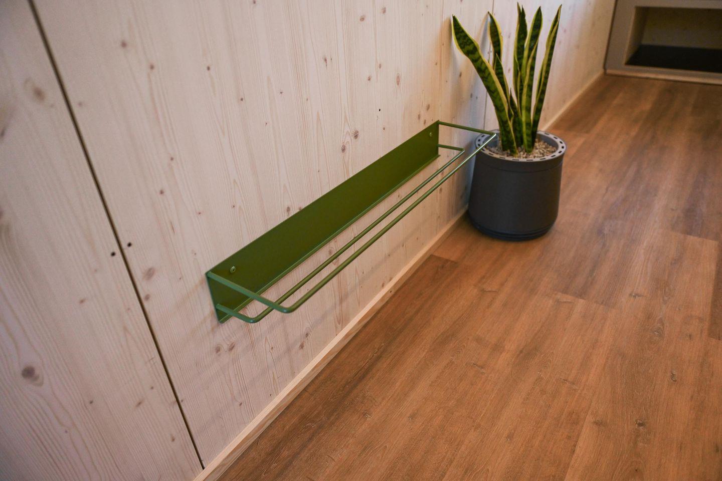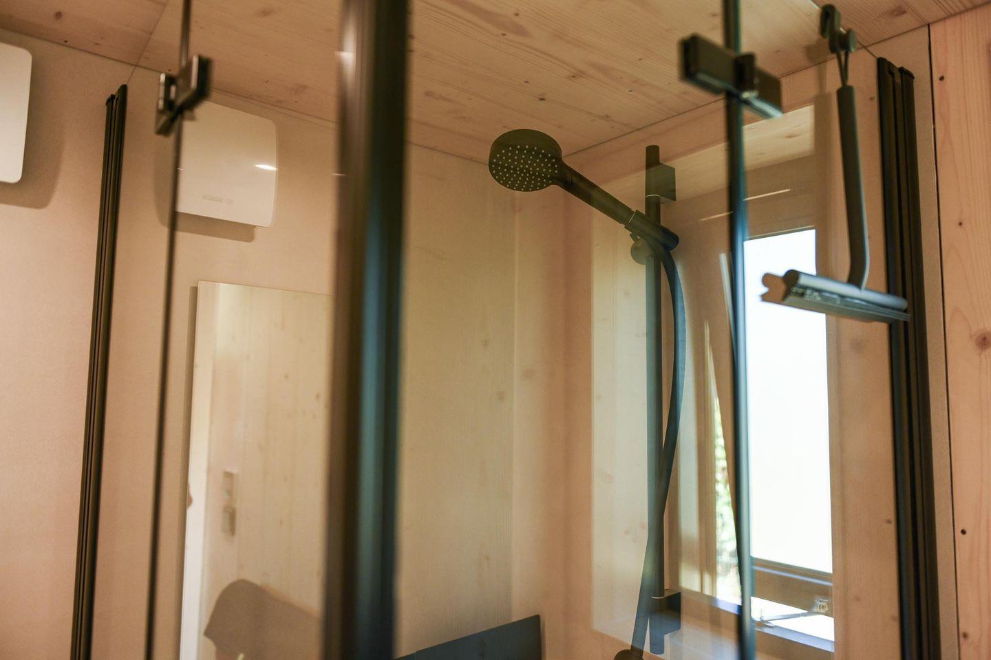 Das Badezimmer ist platzsparend, aber gut ausgestattet mit Dusche, WC, Waschbecken mit Unterschrank, Spiegel, Fenster und einer wohlig warmen Fußbodenheizung, die du bequem per Fernbedienung steuerst. Auch im Wohnraum sorgt eine moderne Klimaanlage für angenehme Temperaturen zu jeder Jahreszeit – zum Kühlen oder Heizen je nach Bedarf. Zusätzlich gibt es Fliegengitter an der Tür, Steckdosen im gesamten Haus und warmes Wasser. Nachhaltigkeit und Regionalität stehen beim Tiny House Nook im Fokus: Es wurde in Schleswig-Holstein gefertigt, ist wohngesund ausgebaut und die Wände sind mit natürlicher Schafwolle gedämmt – ein kleines Fenster im Inneren gibt dir sogar Einblick in den Aufbau.
