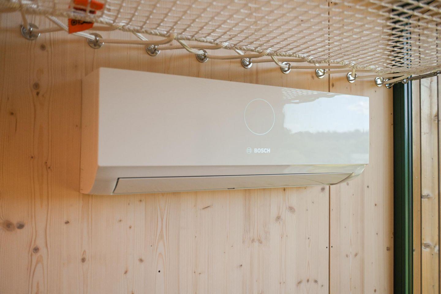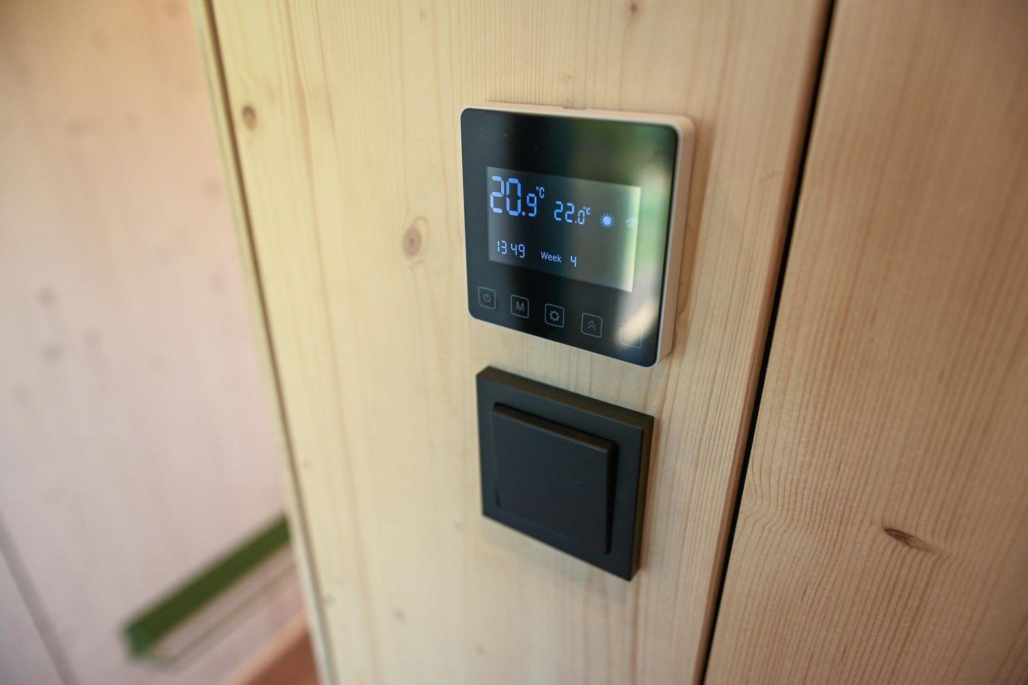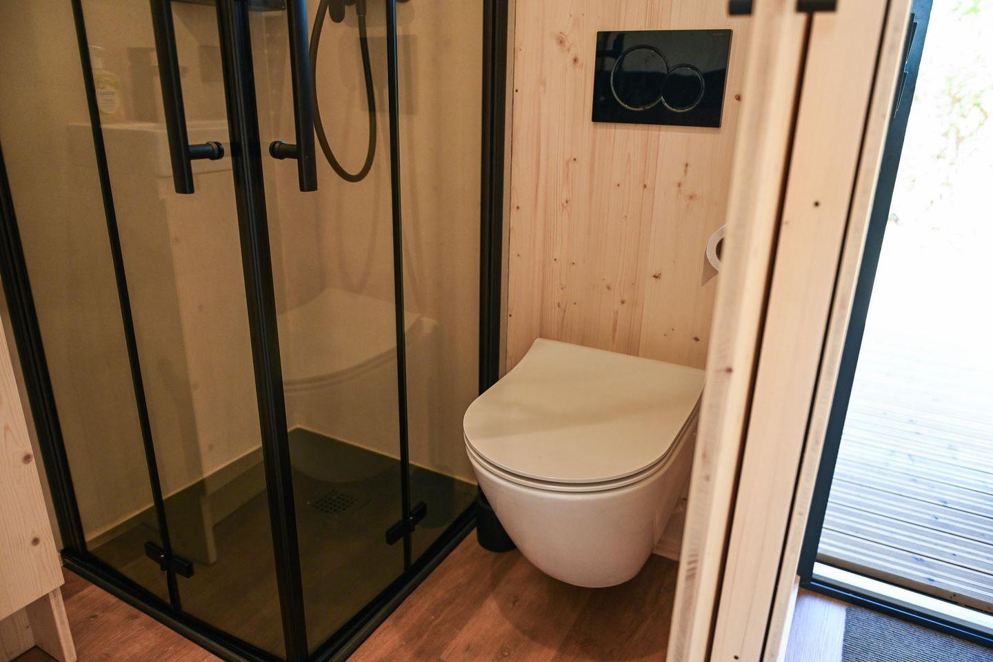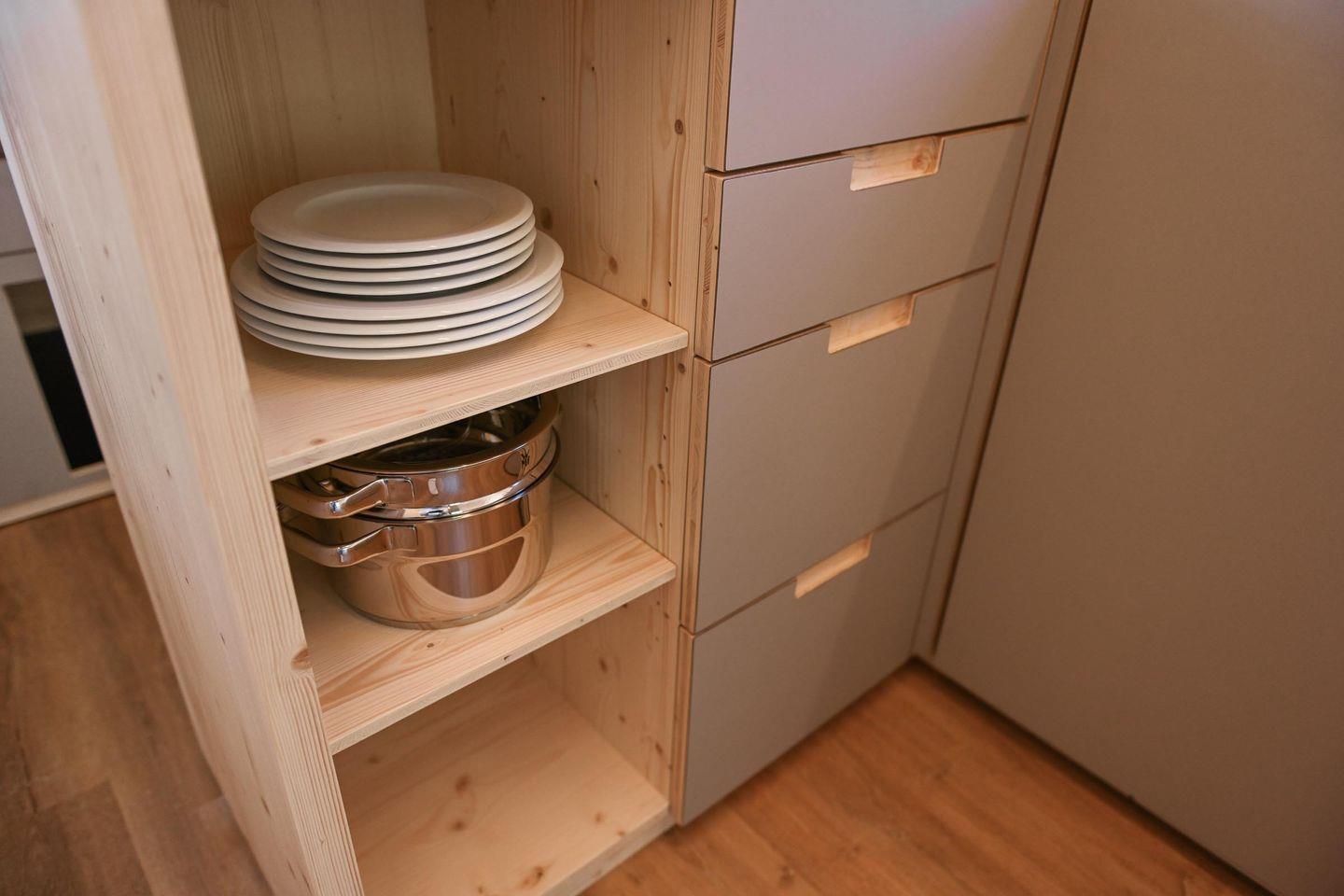 Das Badezimmer ist platzsparend, aber gut ausgestattet mit Dusche, WC, Waschbecken mit Unterschrank, Spiegel, Fenster und einer wohlig warmen Fußbodenheizung, die du bequem per Fernbedienung steuerst. Auch im Wohnraum sorgt eine moderne Klimaanlage für angenehme Temperaturen zu jeder Jahreszeit – zum Kühlen oder Heizen je nach Bedarf. Zusätzlich gibt es Fliegengitter an der Tür, Steckdosen im gesamten Haus und warmes Wasser. Nachhaltigkeit und Regionalität stehen beim Tiny House Nook im Fokus: Es wurde in Schleswig-Holstein gefertigt, ist wohngesund ausgebaut und die Wände sind mit natürlicher Schafwolle gedämmt – ein kleines Fenster im Inneren gibt dir sogar Einblick in den Aufbau.