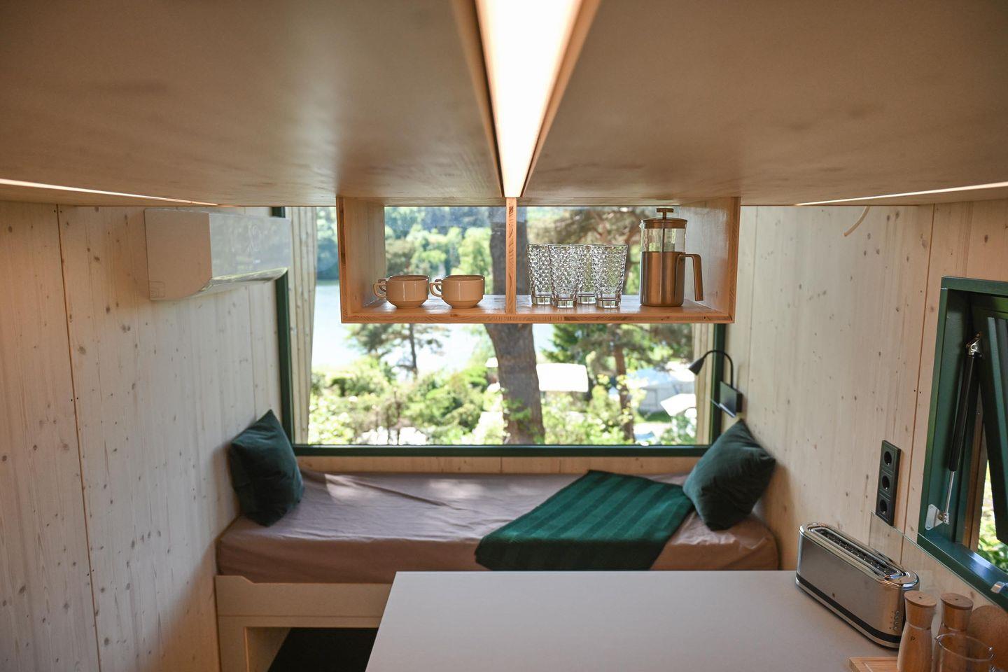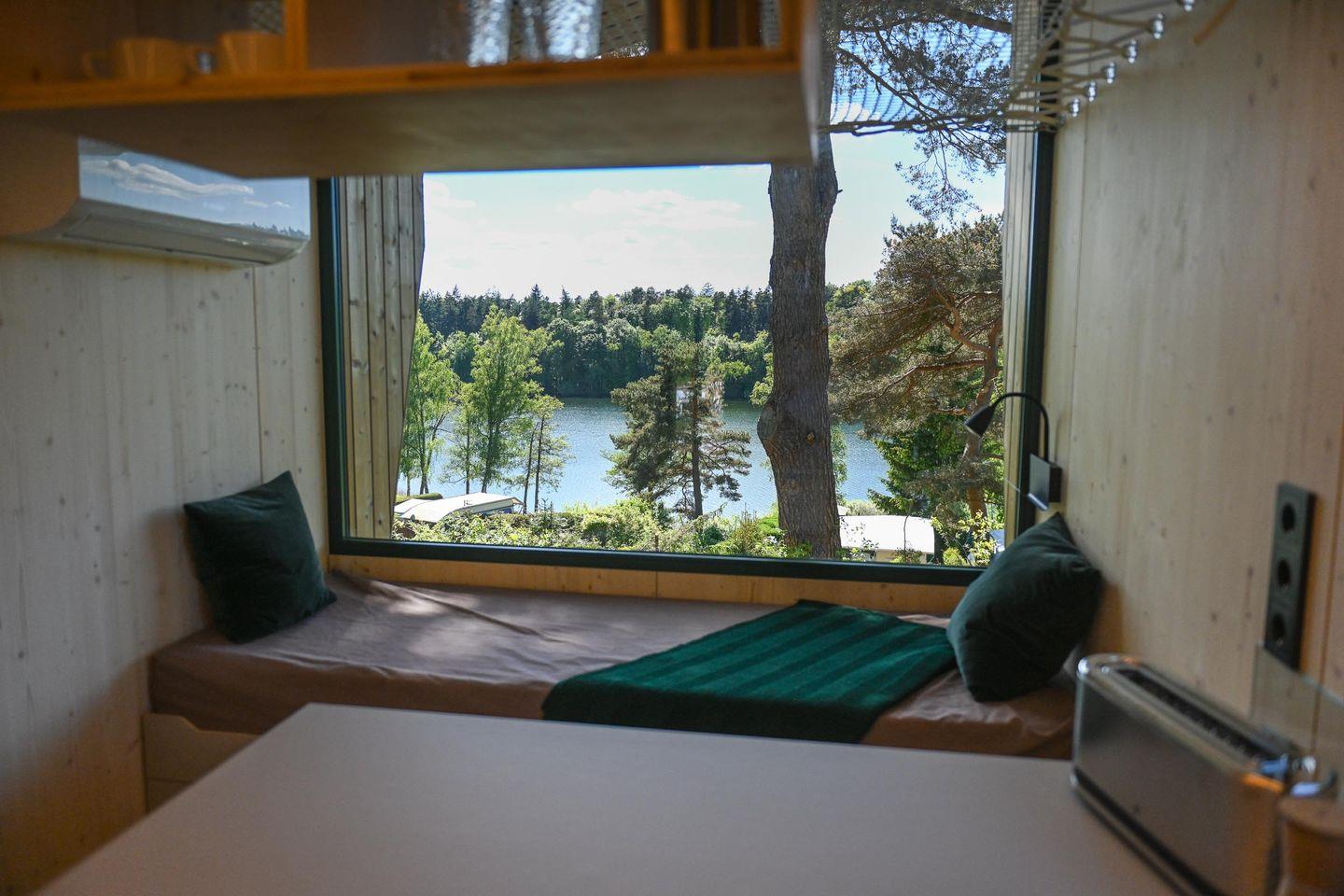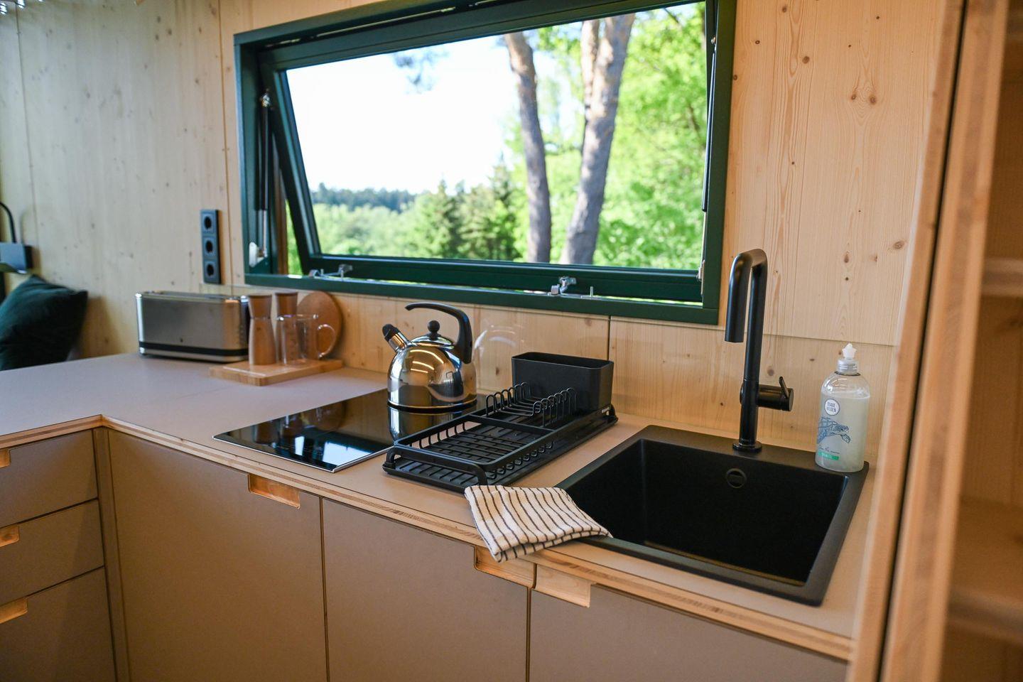 Direkt daneben liegt die kompakte, gut ausgestattete Küche in L-Form mit zwei Induktionsfeldern, einem klappbaren Fenster zur Terrasse und einem kleinen Tresen für entspannte Kochsessions. French Press, Toaster, Flötenkessel, Geschirr, Besteck, Töpfe, Pfanne und viele kleine Details wie Salz, Pfeffer, Spülmittel oder Schneidebrett machen das Kochen unkompliziert und angenehm. Über eine kleine Treppe erreichst du die Schlafebene mit einem 1,40?m breiten Bett, Dachfenster, Verdunklungsmöglichkeiten und einem Ausblick, der auch hier den See in Szene setzt. Das absolute Highlight: Vom Bett aus gelangst du direkt auf ein luftiges Relax-Netz, das über dem Wohnbereich schwebt – ein besonderes Erlebnis für bis zu zwei Personen.