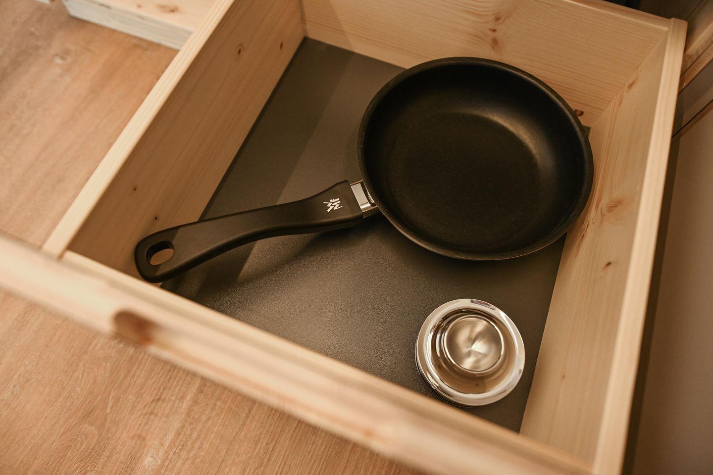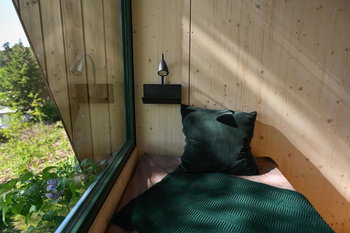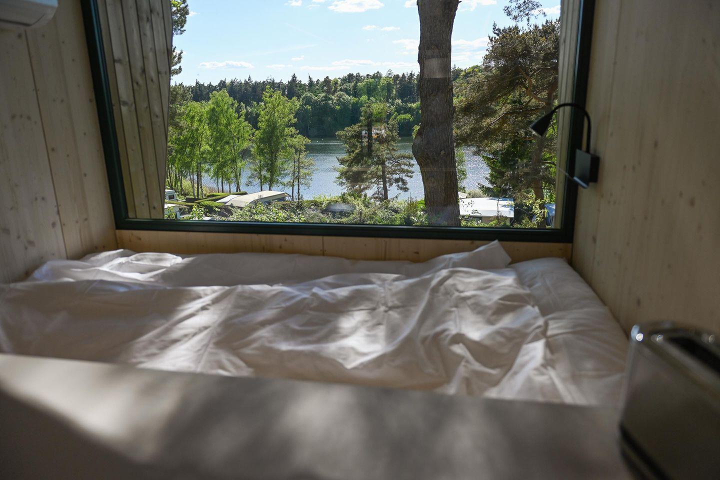 Direkt daneben liegt die kompakte, gut ausgestattete Küche in L-Form mit zwei Induktionsfeldern, einem klappbaren Fenster zur Terrasse und einem kleinen Tresen für entspannte Kochsessions. French Press, Toaster, Flötenkessel, Geschirr, Besteck, Töpfe, Pfanne und viele kleine Details wie Salz, Pfeffer, Spülmittel oder Schneidebrett machen das Kochen unkompliziert und angenehm. Über eine kleine Treppe erreichst du die Schlafebene mit einem 1,40?m breiten Bett, Dachfenster, Verdunklungsmöglichkeiten und einem Ausblick, der auch hier den See in Szene setzt. Das absolute Highlight: Vom Bett aus gelangst du direkt auf ein luftiges Relax-Netz, das über dem Wohnbereich schwebt – ein besonderes Erlebnis für bis zu zwei Personen.