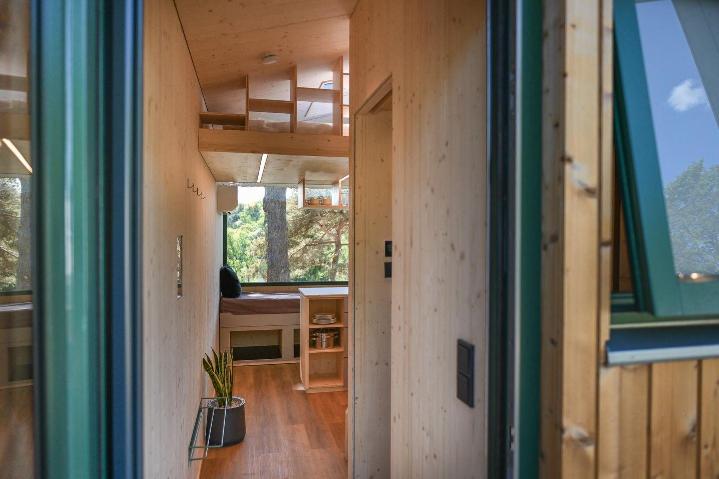 Mit einer Grundfläche von 20 Quadratmetern innen und zusätzlichen 20 Quadratmetern Terrasse in L-Form bietet das Tiny House überraschend viel Platz – ideal für Paare, kleine Familien, Freund*innen oder Alleinreisende. Die Terrasse ist möbliert mit einem Tisch und vier Stühlen, perfekt für ein gemeinsames Frühstück in der Morgensonne oder einen langen Sommerabend mit Blick auf den See. Innen findest du ein durchdachtes Wohnkonzept mit vielen cleveren Staufächern, einem hochwertigen Holzfußboden und einer hochwertigen Ausstattung. Im Zentrum des offenen Wohnraums steht ein großes Panoramafenster, das nicht nur den Blick freigibt, sondern auch Licht und Natur ins Haus holt. Das gemütliche Sofa davor lässt sich zum 1,40?m breiten Day Bed ausziehen und dient so als Schlafplatz für zwei zusätzliche Gäste.