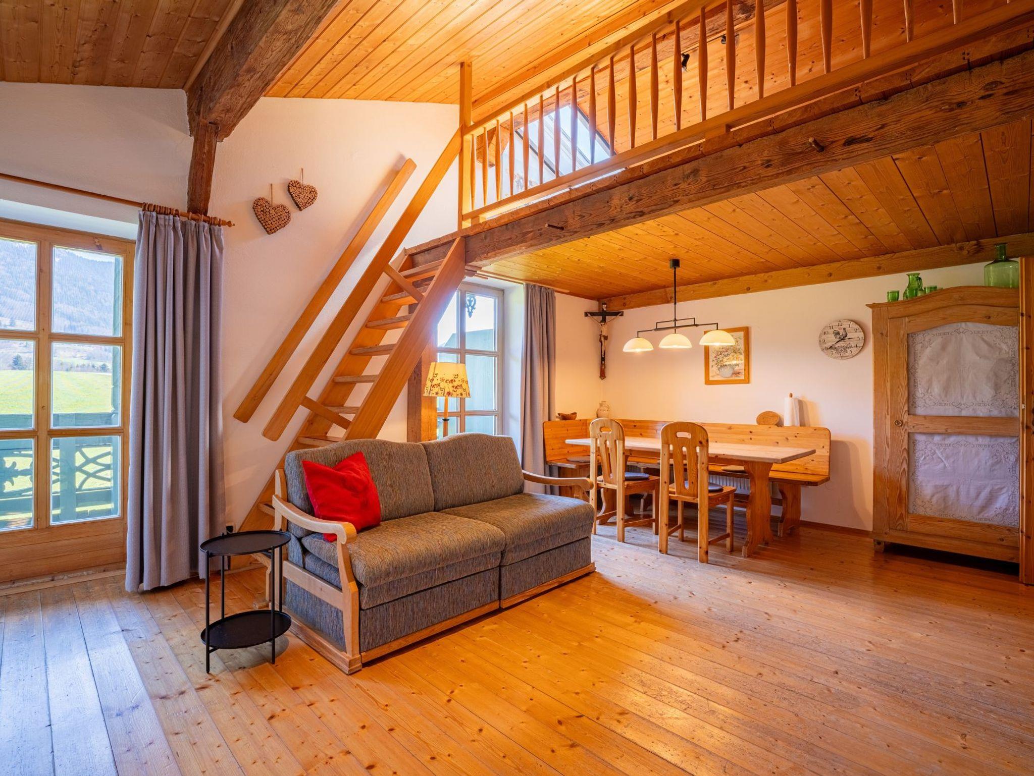 Die Galeriewohnung im 2. OG unseres Hofes erreichen Sie über einen eigenen Eingang. Sie besteht aus einem geräumigen Wohnraum mit Küchenzeile, großen Esstisch und Sofa. Die Wohnung beinhaltet außerdem ein modernes Bad und 2 separate Schlafzimmer. Ein offener Schlafraum mit Doppelbett oben in der Galerie und ein separates Schlafzimmer mit Doppelbett. Eine Besonderheit unserer Galeriewohnung ist der gemütliche Südbalkon mit herrlichen Ausblick auf unser heimisches Bergpanorama.