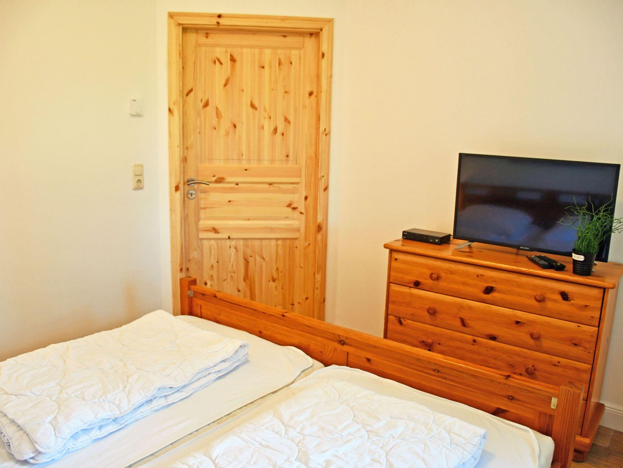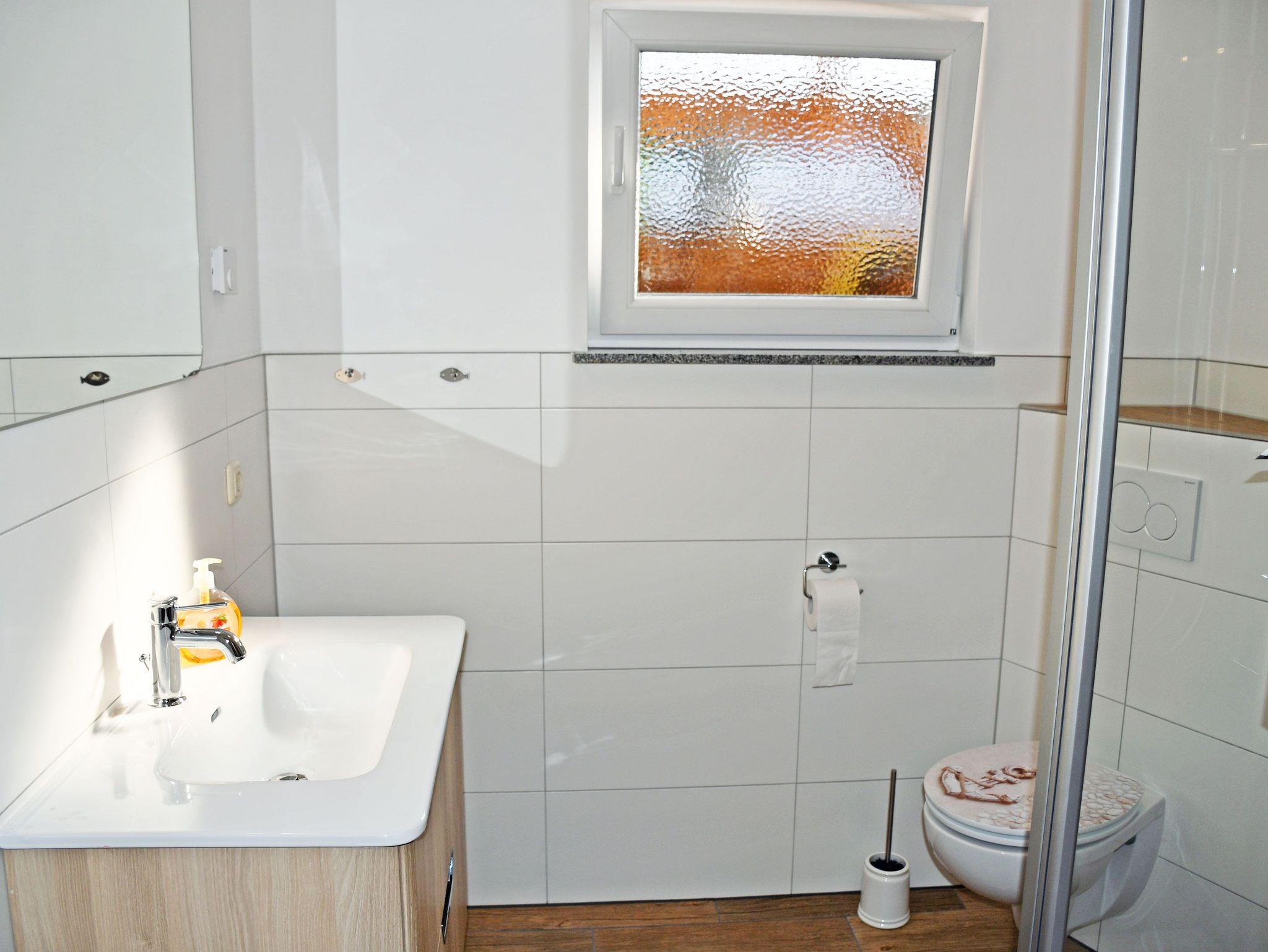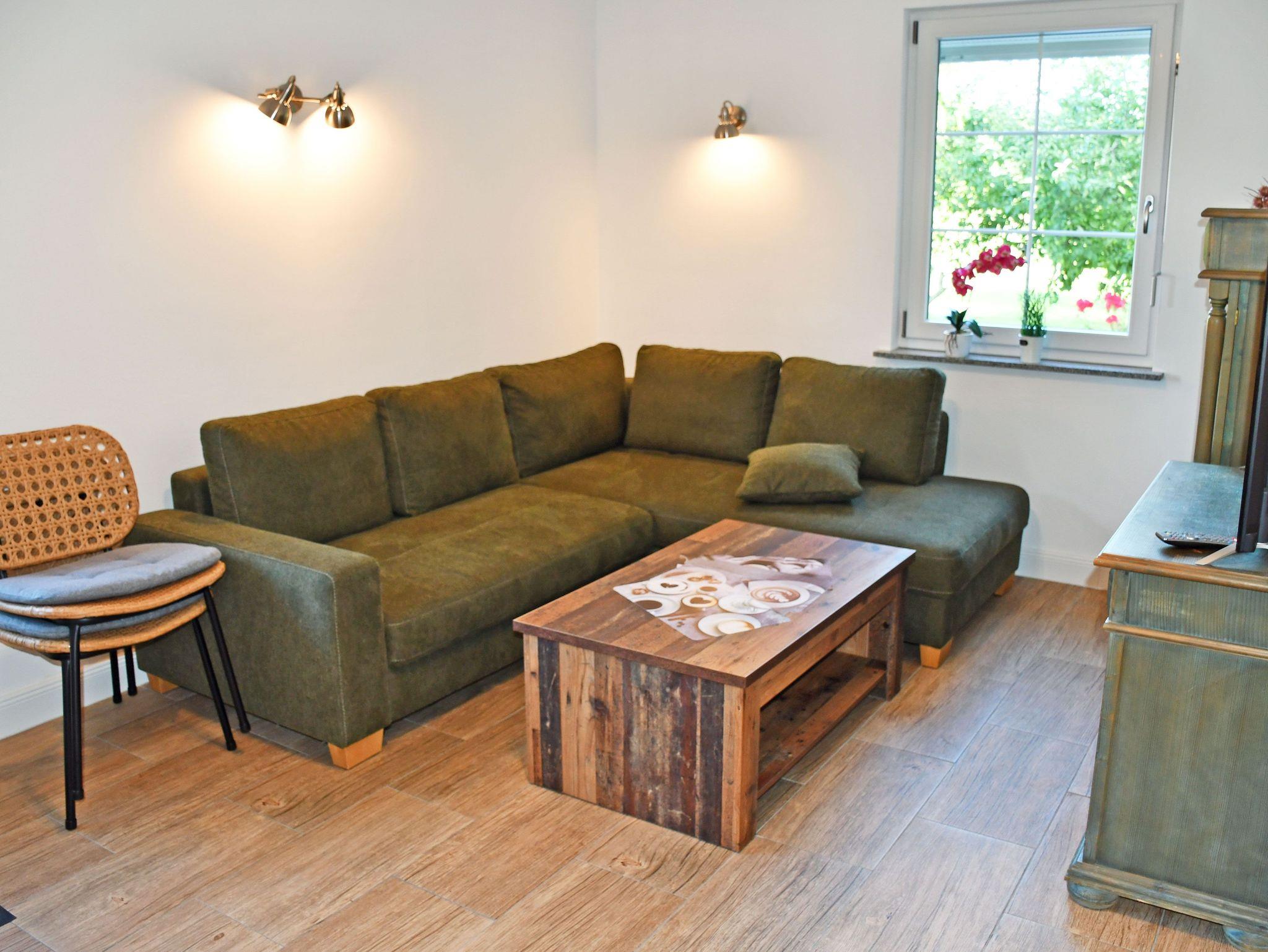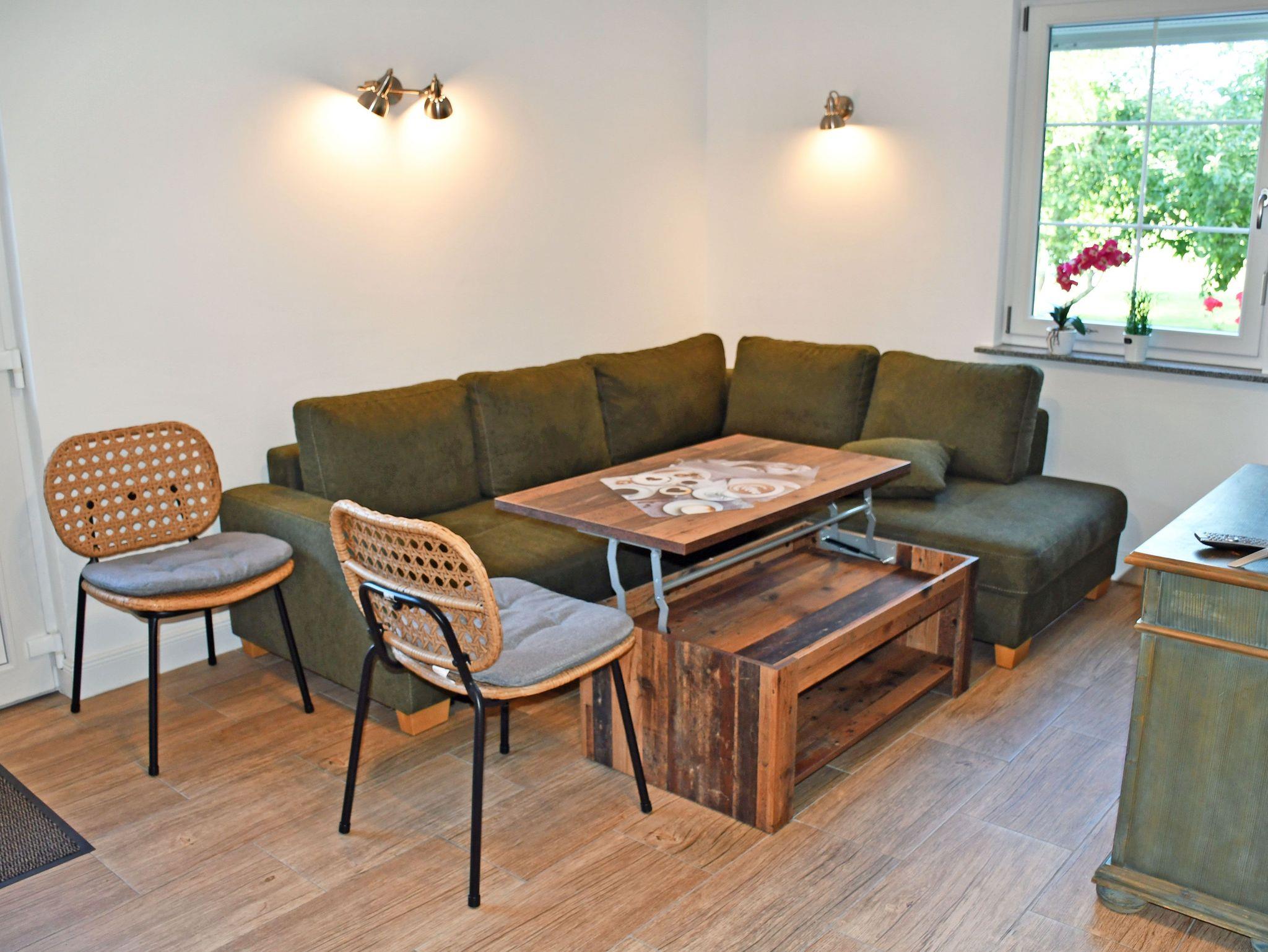 Die neu errichtete Ferienwohnung Achtern im Erdgeschoss verfügt über einen separaten Eingang. Sie ist ca. 35 qm groß, hat Platz für maximal 4 Gäste, wurde modern und liebevoll eingerichtet und bietet ein WLAN-Internetzugang. Im Wohnraum befinden sich eine bequeme Couch mit Tisch und ein modernes Flachbild-TV-Gerät . Hier steht auch ein Esstisch mit Stühlen. Die Couch kann bei Bedarf für zwei Gäste aufgebettet werden.