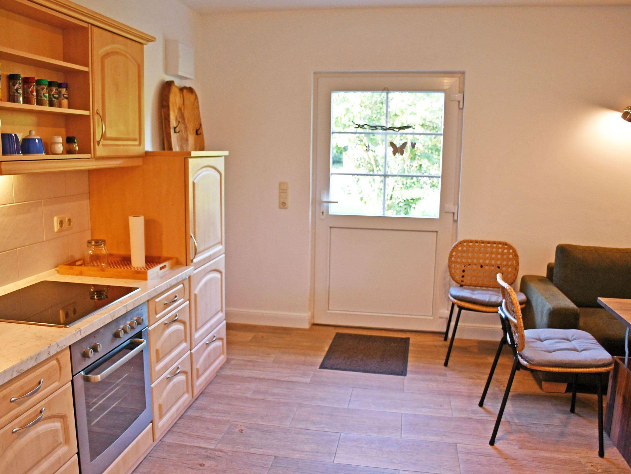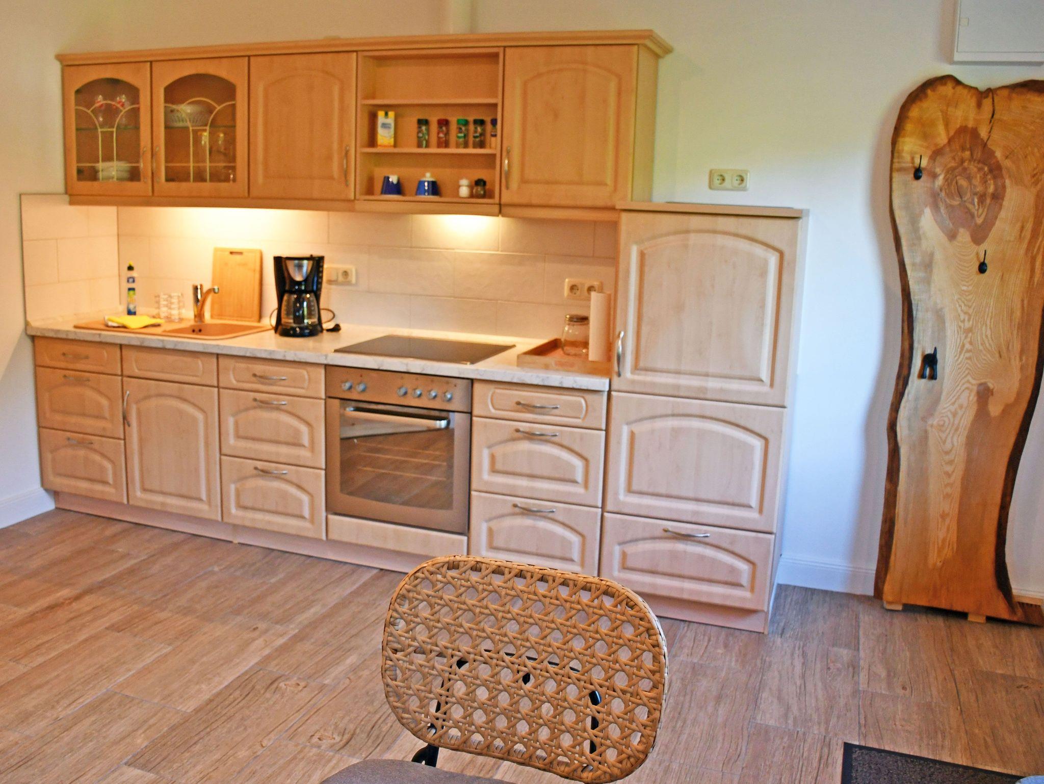 Die Küchenzeile ist mit einem Ceranfeld-Herd, Abzugshaube, Backofen, Wasserkocher, Kaffeemaschine, Toaster und Kühlschrank komplett ausgestattet.