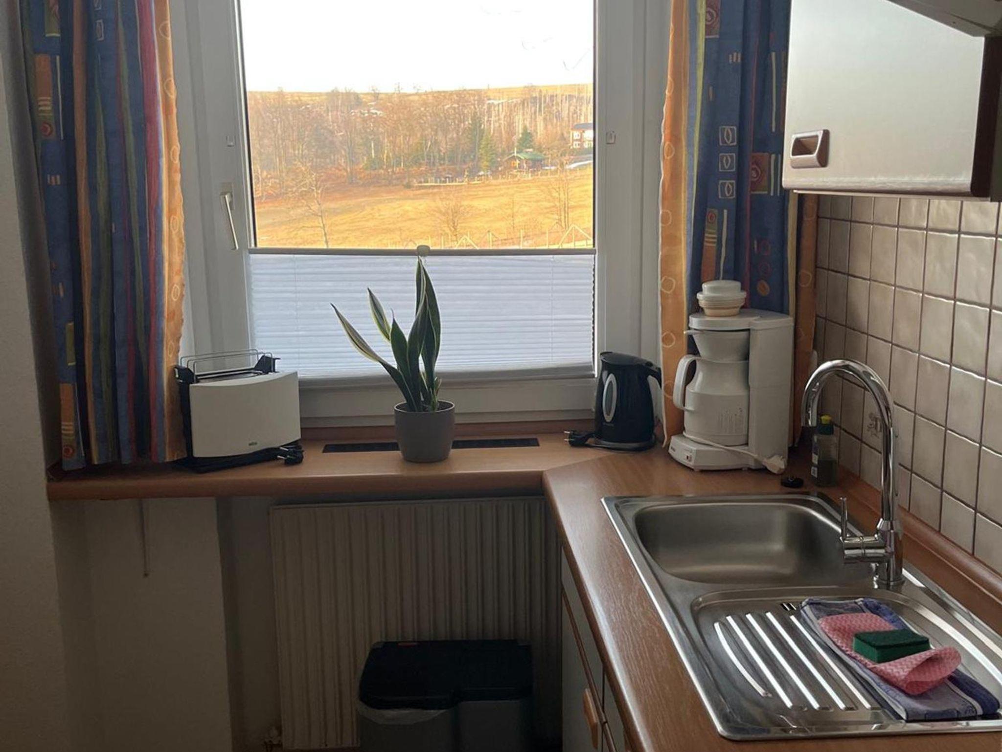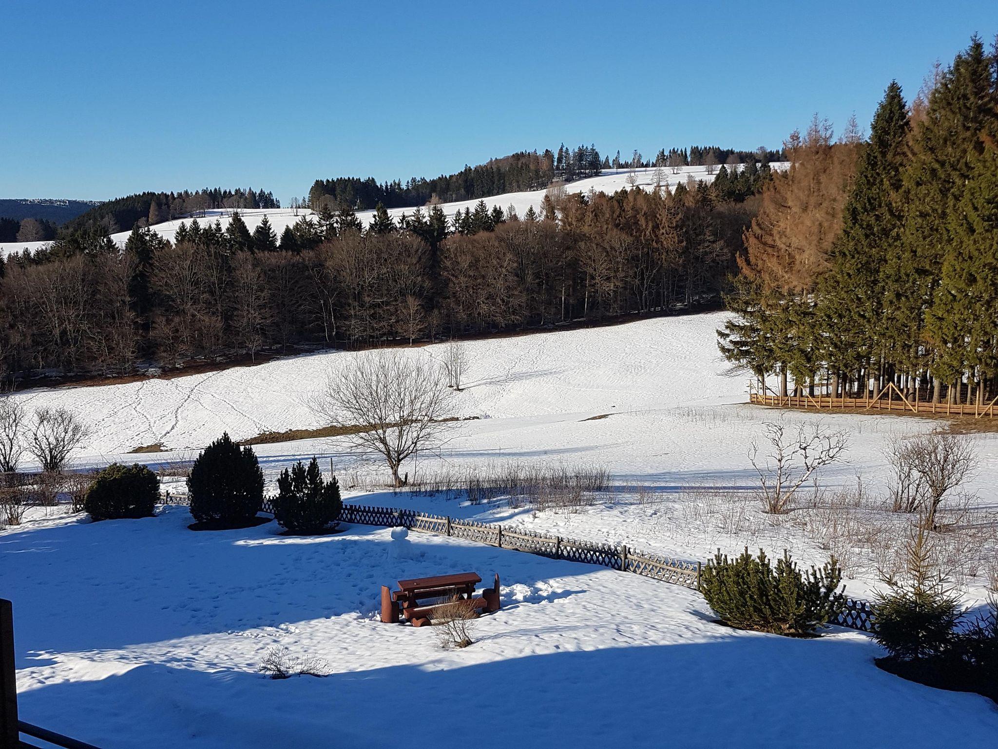 Die Wohnung hat eine separate Küche und ein Duschbad mit Fenster zum Hang. Ein Fön und ein Kosmetikspiegel sind vorhanden. Sie ist ca. 34 m² groß und gemütlich - Sie blicken über Wiesen und Wälder.