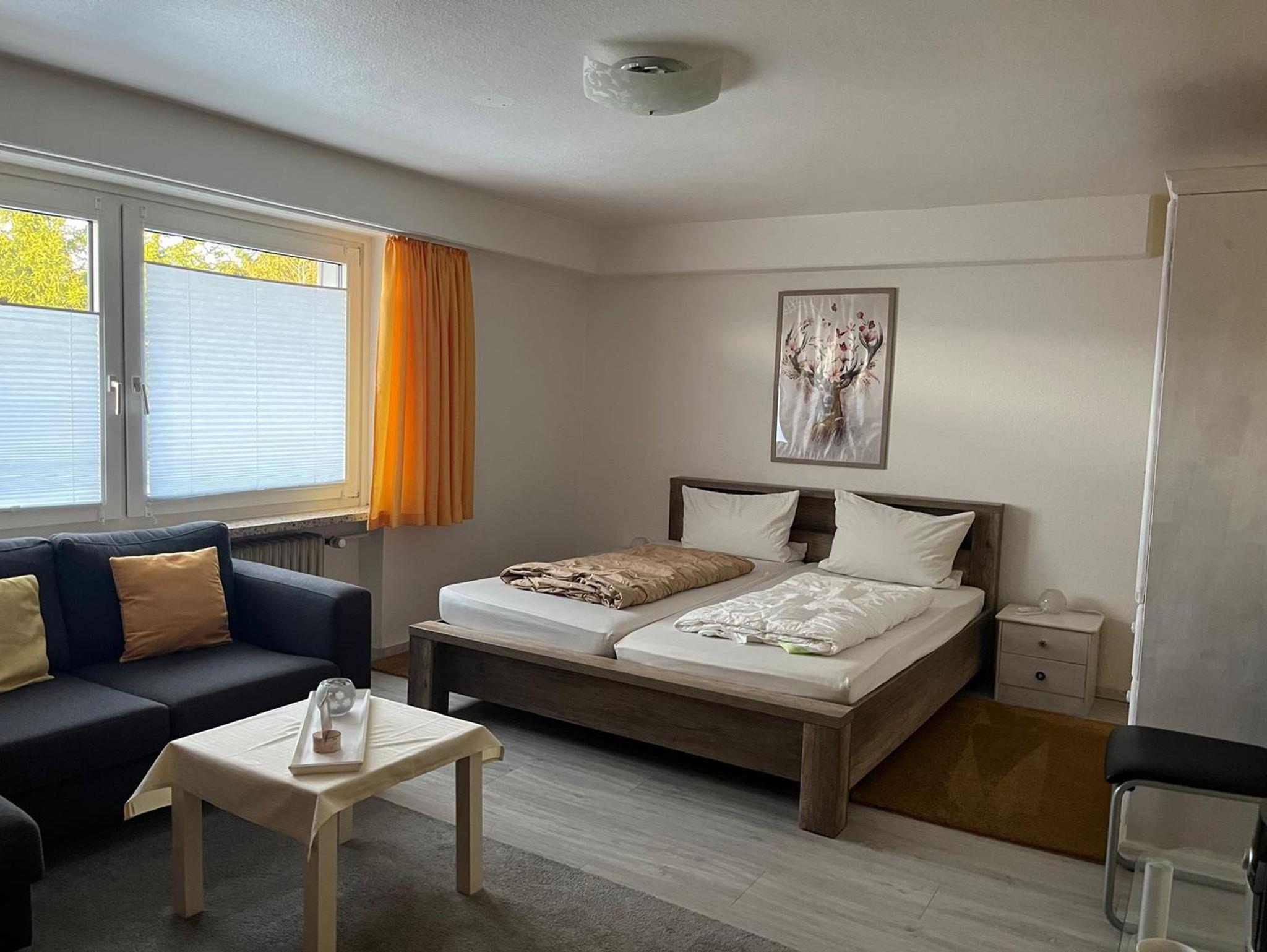 Unsere Wohnung Nr. 1 ist ein 1-Zimmer-Appartment mit Wohnmöbeln und Ehebett.