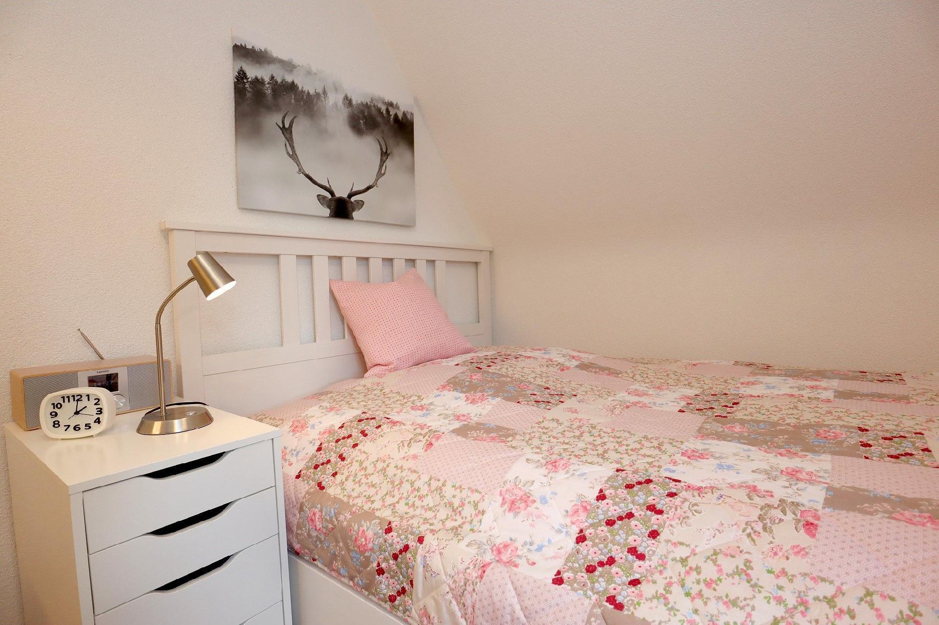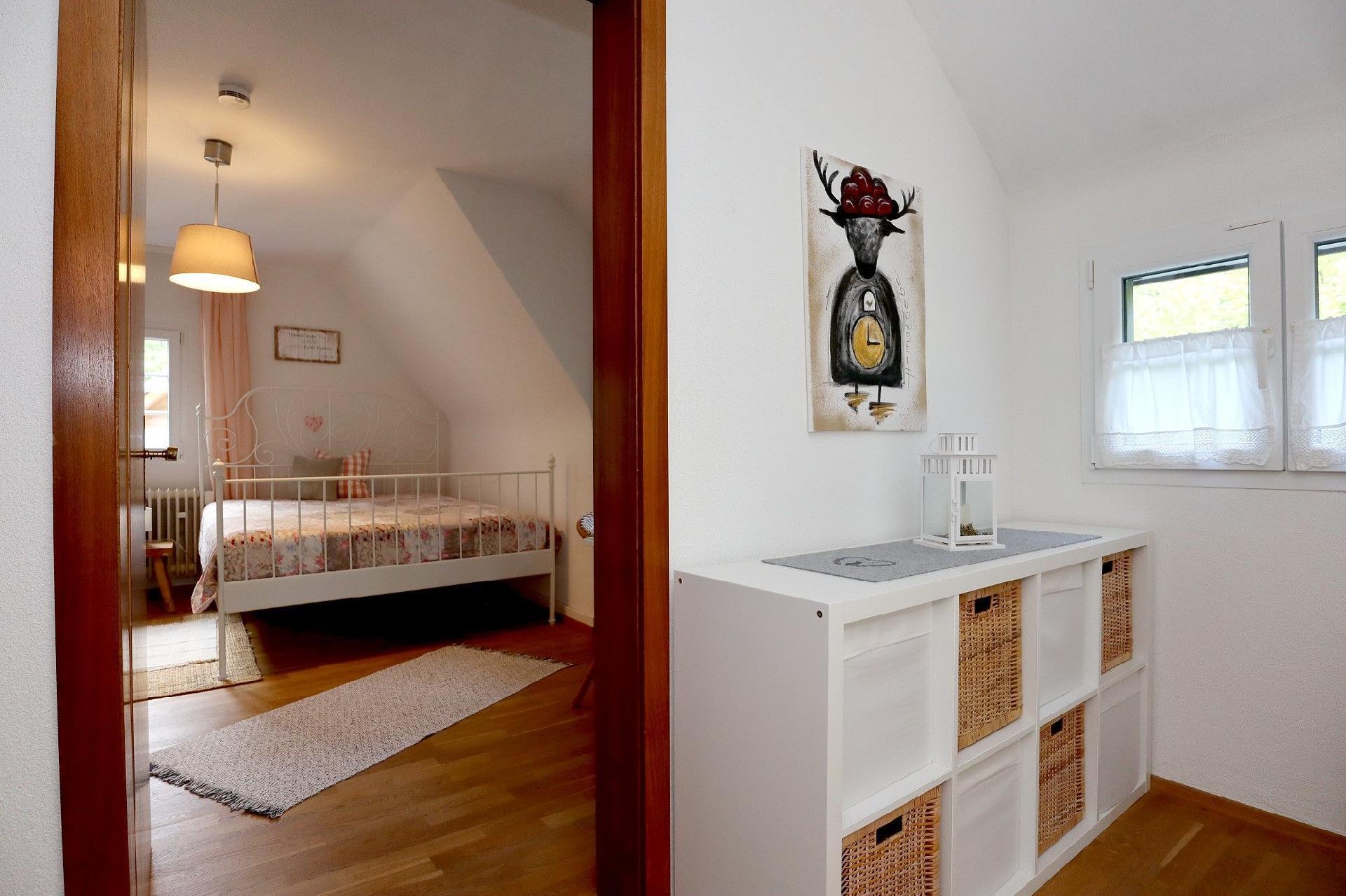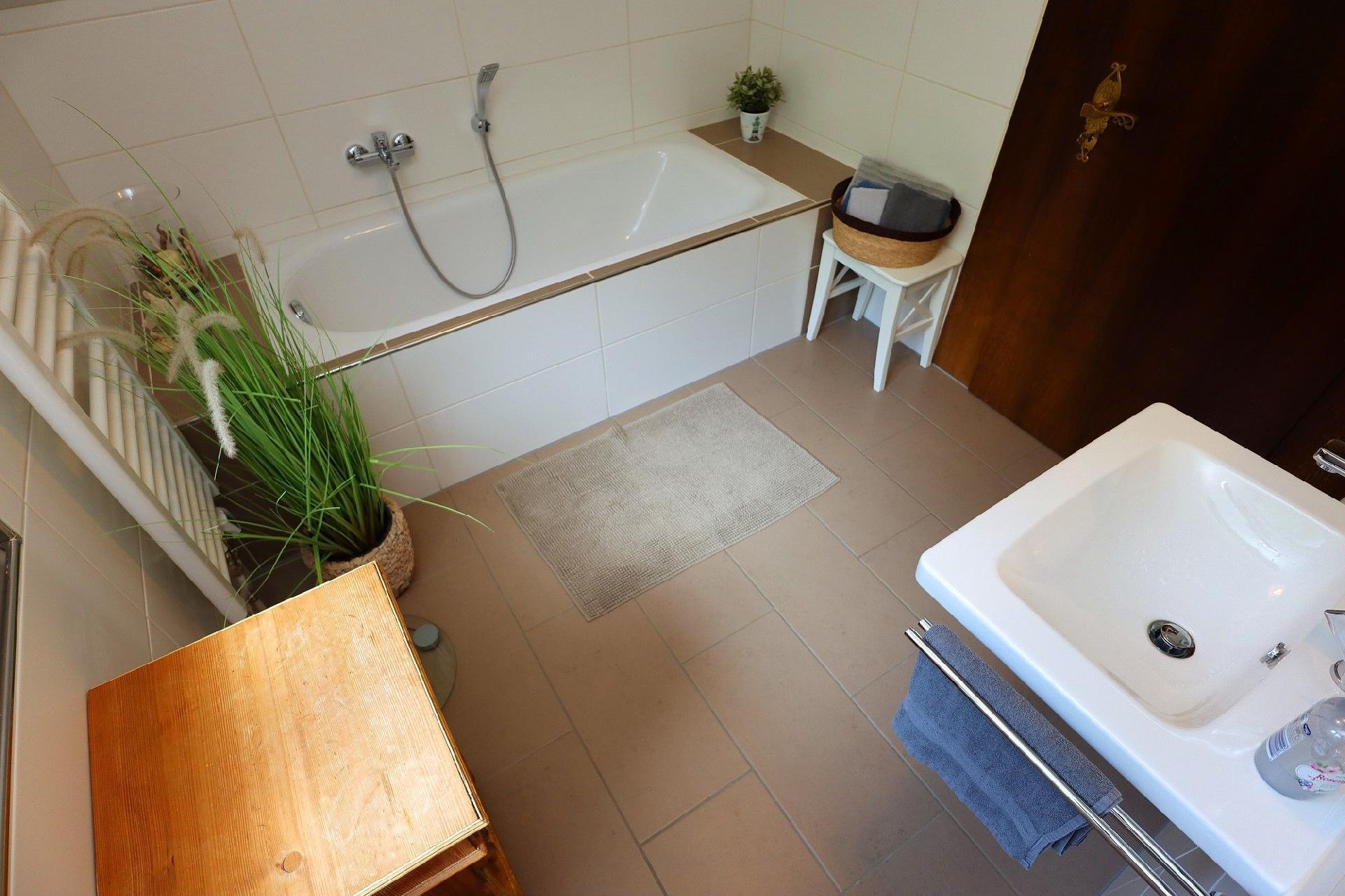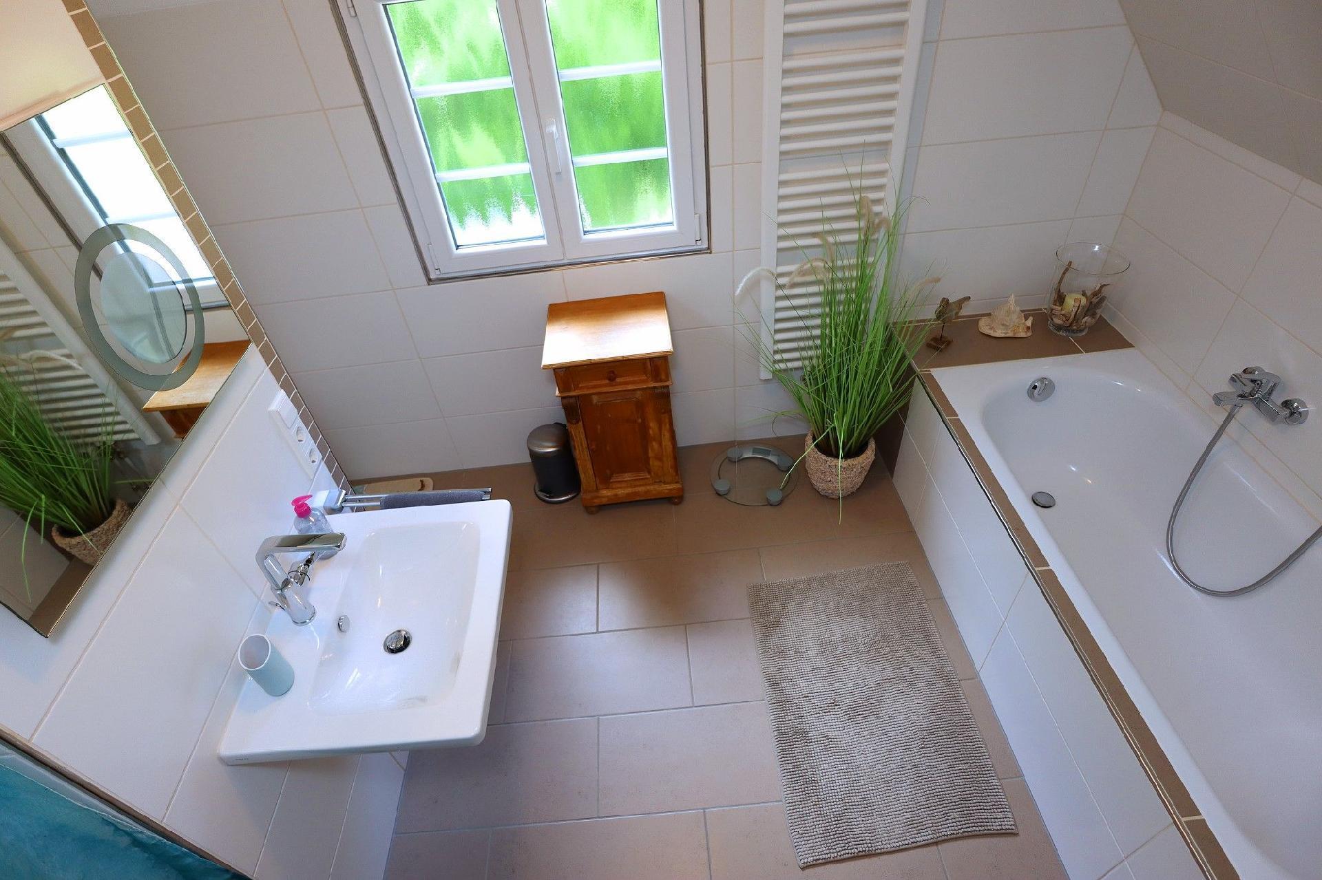 Im Obergeschoss haben Sie zwei Schlaf- und ein Kinderzimmer, und ein großes mondern gestaltetes Badezimmer, mit Waschbecken, Toilette, Badewanne und ebenerdiger Dusche.
