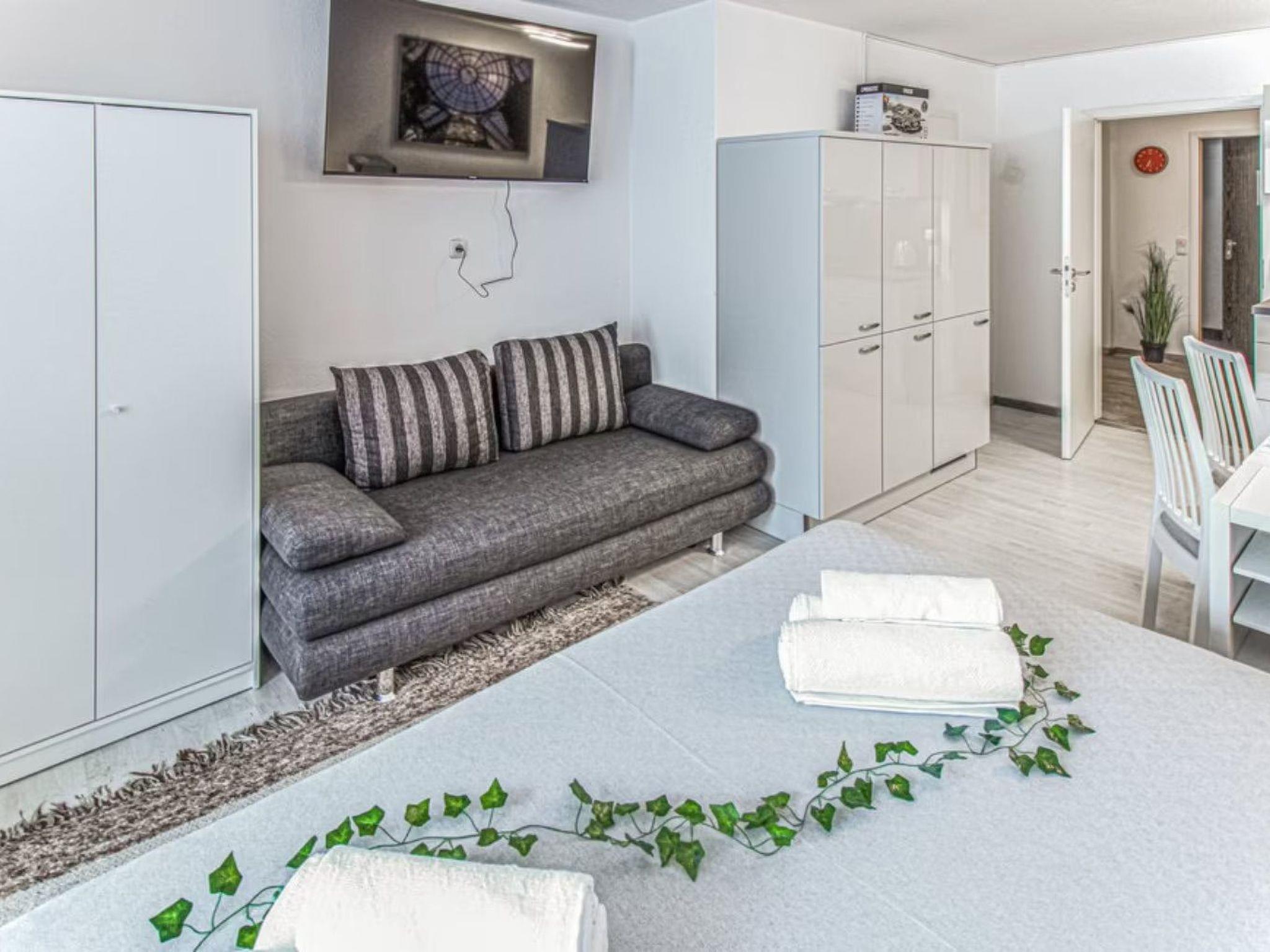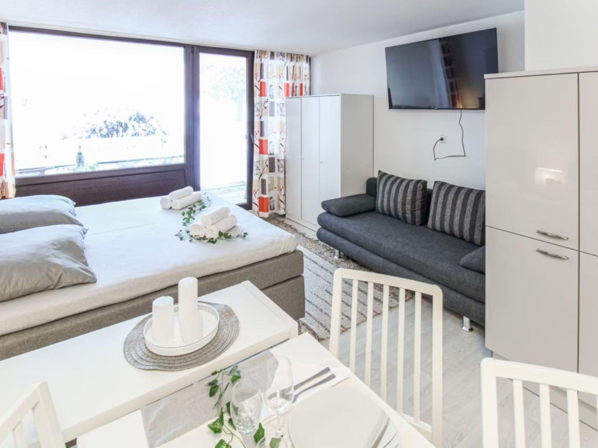 Die Wohnung verfügt über ein separates Schlafzimmer mit komfortablem Doppelbett und einem Etagenbett und ein gemütliches Wohnzimmer mit Schlafcouch. In der Küche stehen Ihnen die wichtigsten Utensilien zur Verfügung.