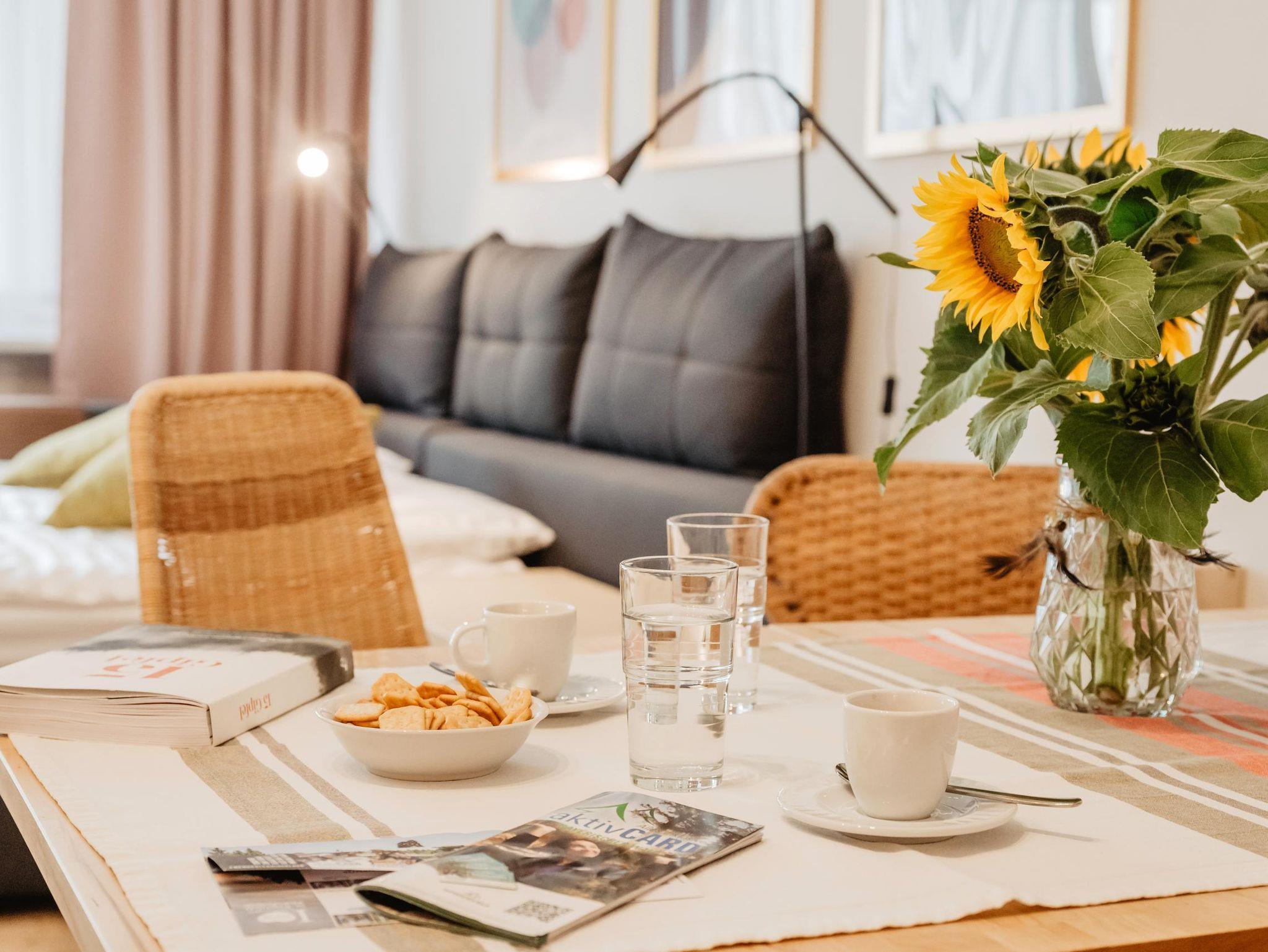 Die Küche ist voll ausgestattet mit Kaffeemaschine, Spülmaschine, Zwei-Platten-Herd und Backofen – so können Sie sich auch im Urlaub wie zuhause selbst versorgen. Hochwertige Handtücher und Bettwäsche sind inklusive, ebenso wie WLAN und ein Fernseher für entspannte Stunden. Viel Stauraum sorgt dafür, dass Sie sich auch bei längeren Aufenthalten rundum wohlfühlen können.