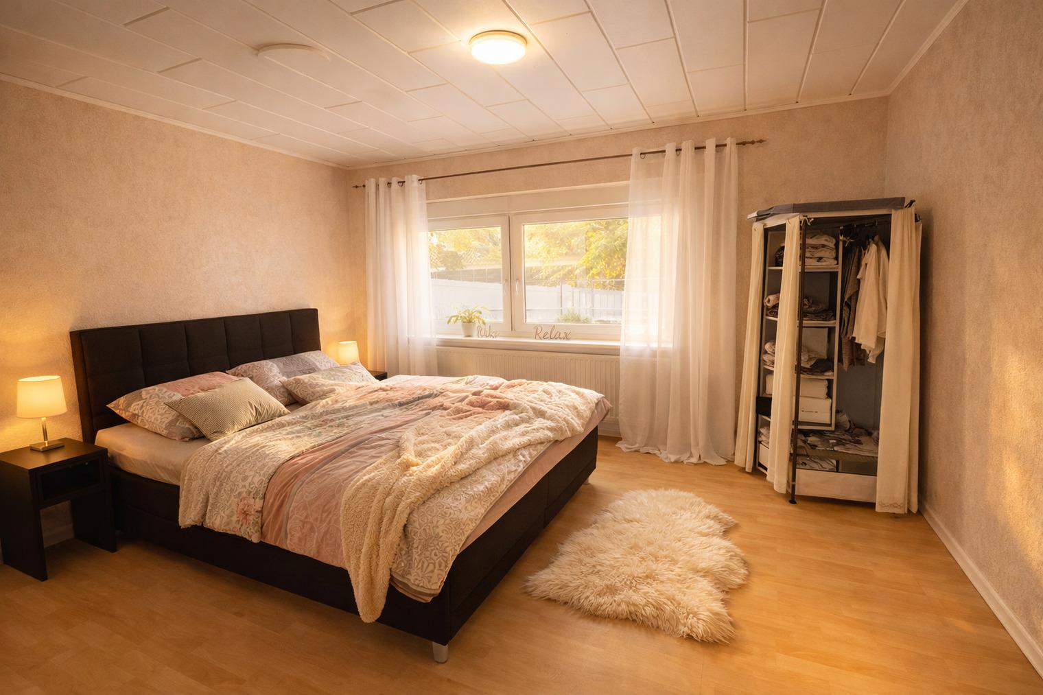 ein Schlafzimmer mit elektrischem Polsterbett, sowie ein großes Badezimmer und ein separates Gäste Wc.