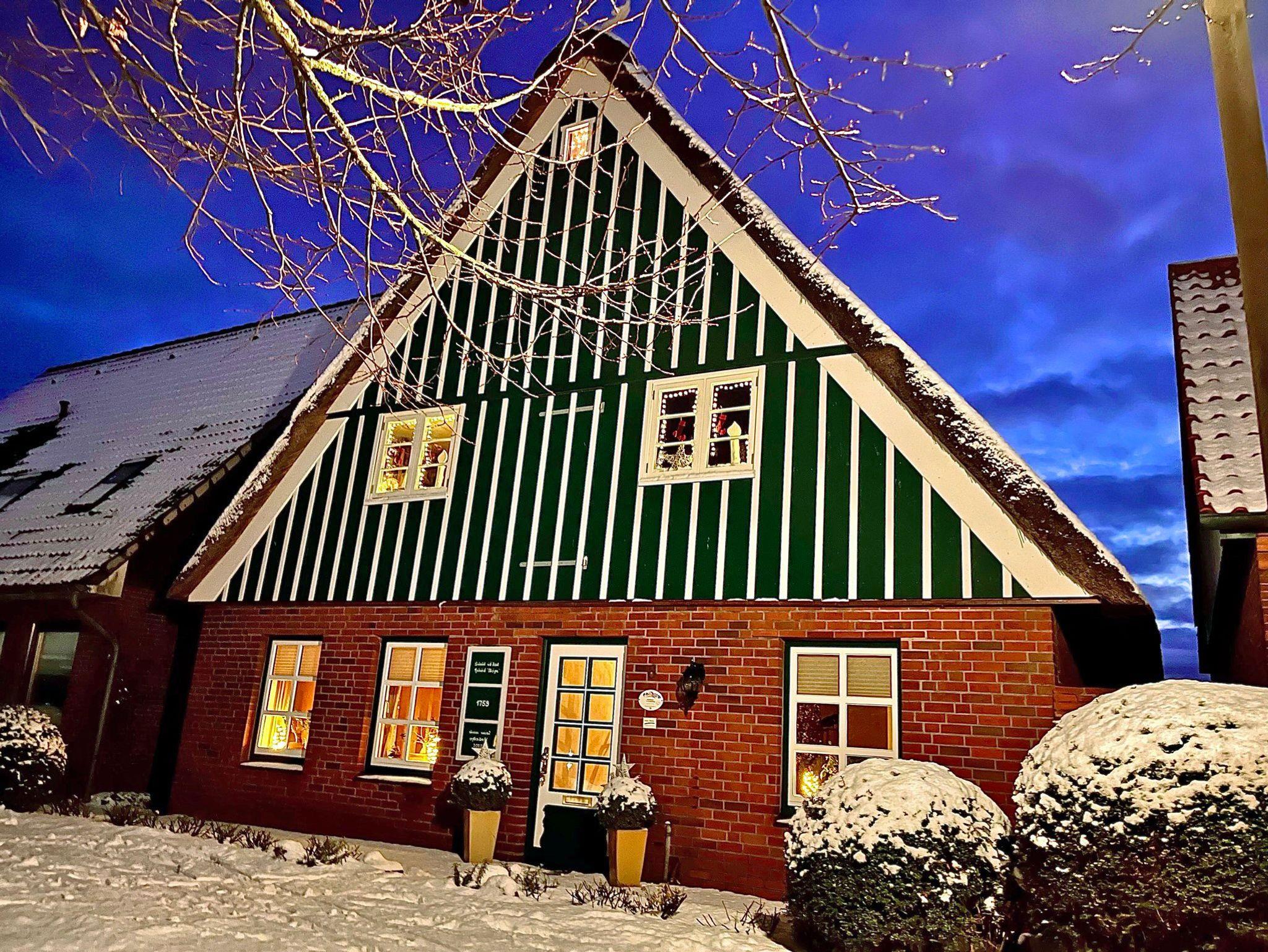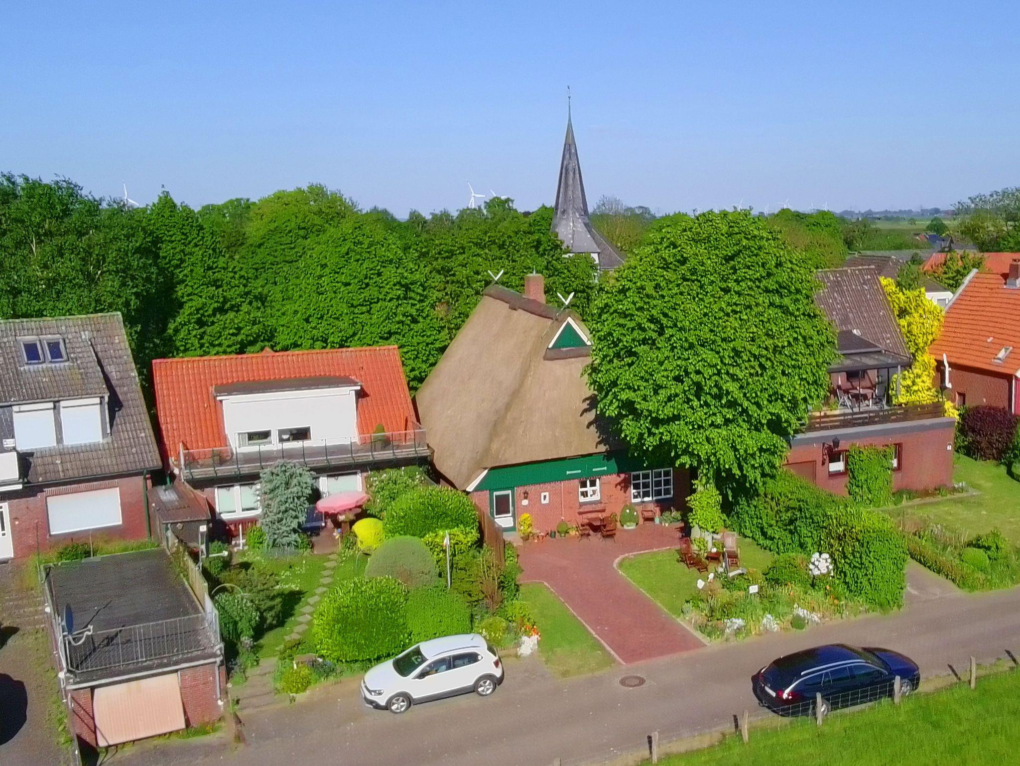 Hoch über der Wilstermarsch, dem „Land unterm Meer“ krönen die Häuser der Deichreihe den alten Elbdeich, in ihrer Mitte das charakteristische Reetdachhaus an der Stöpe.