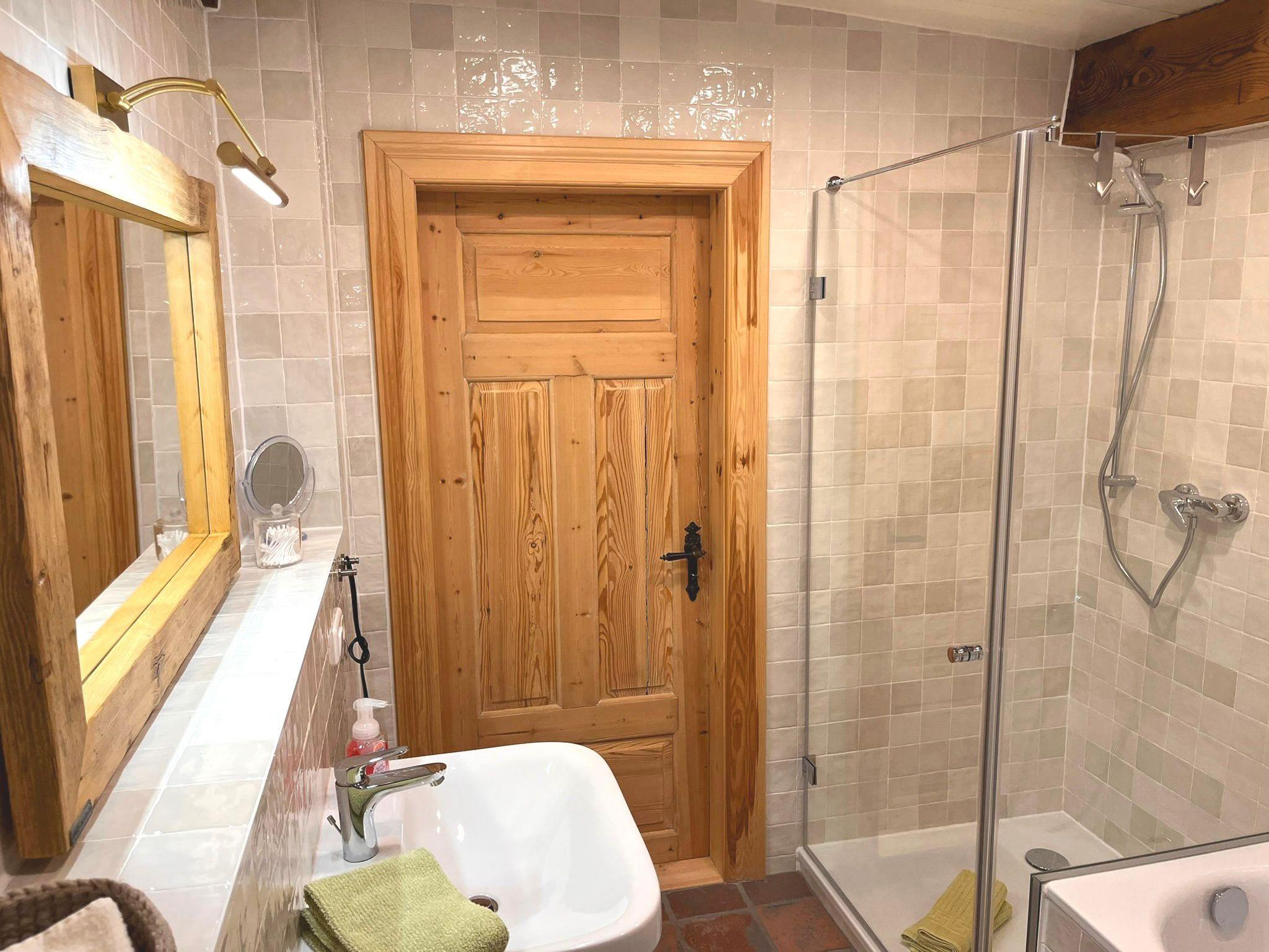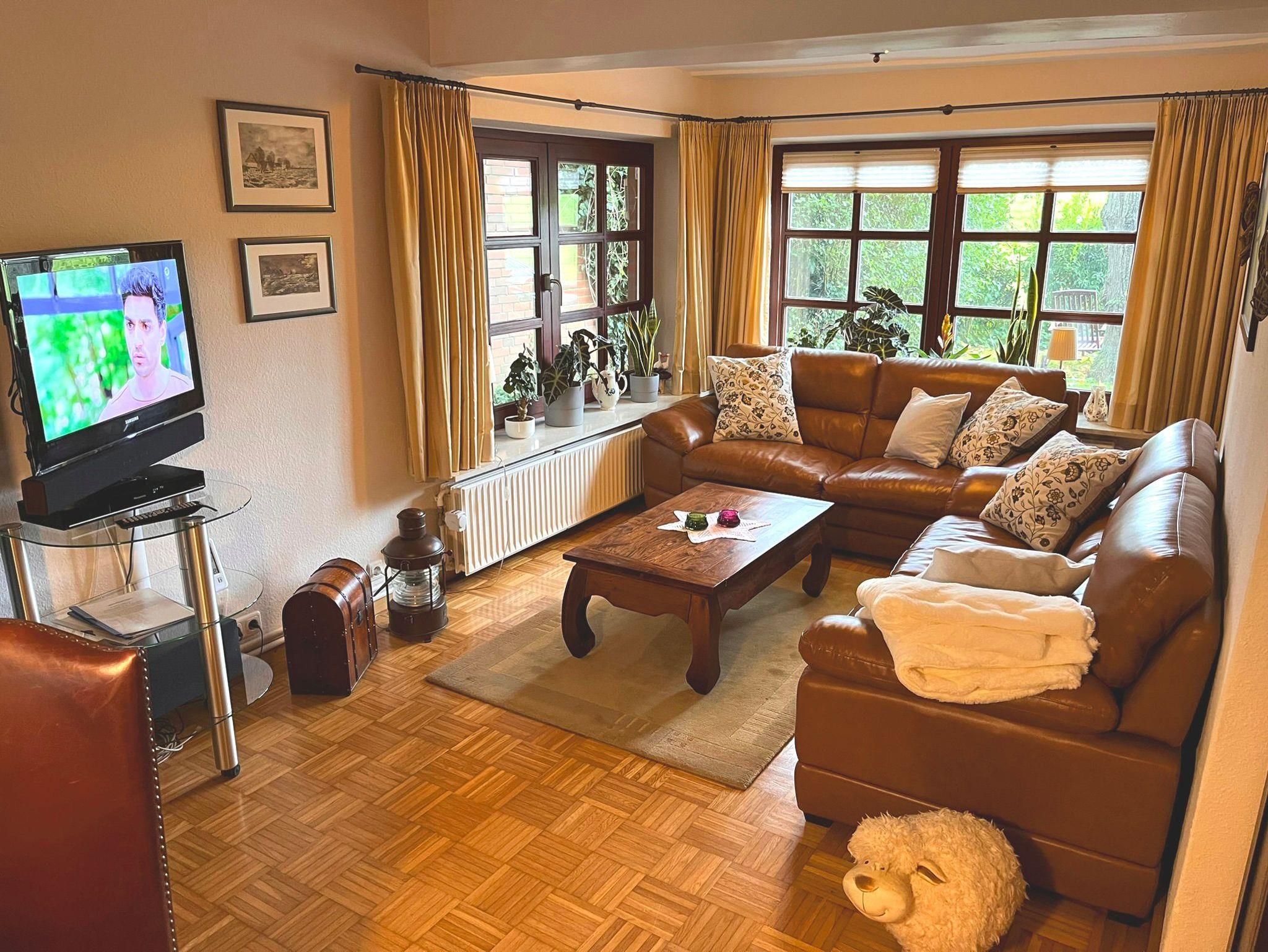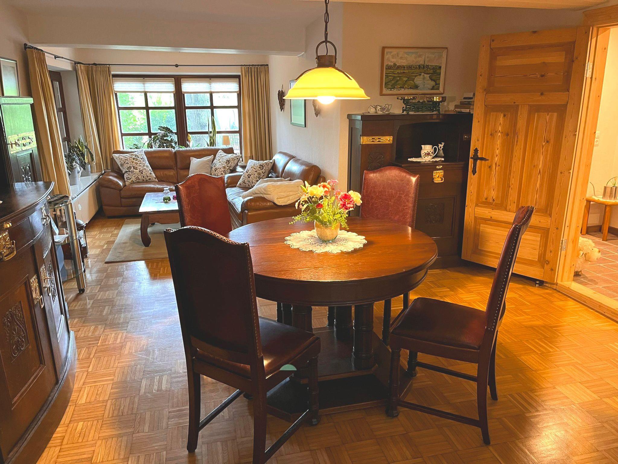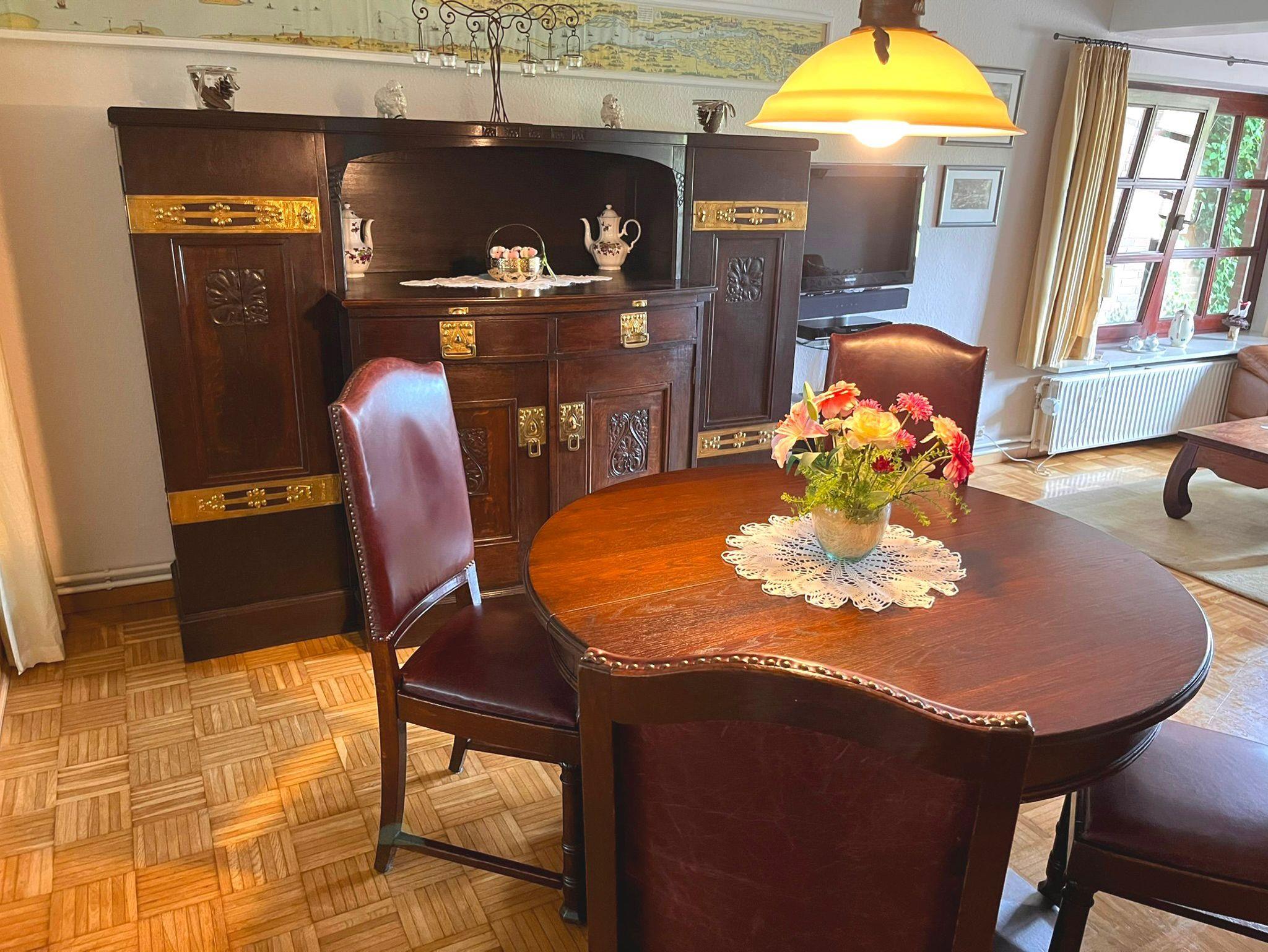Der Wohnbereich besteht aus einer Couchecke und einem Essbereich. Im Esszimmer stehen liebevoll restaurierte Jugendstilmöbel. Der große Tisch bietet reichlich Platz zum Speisen, Klönen und Spielen.