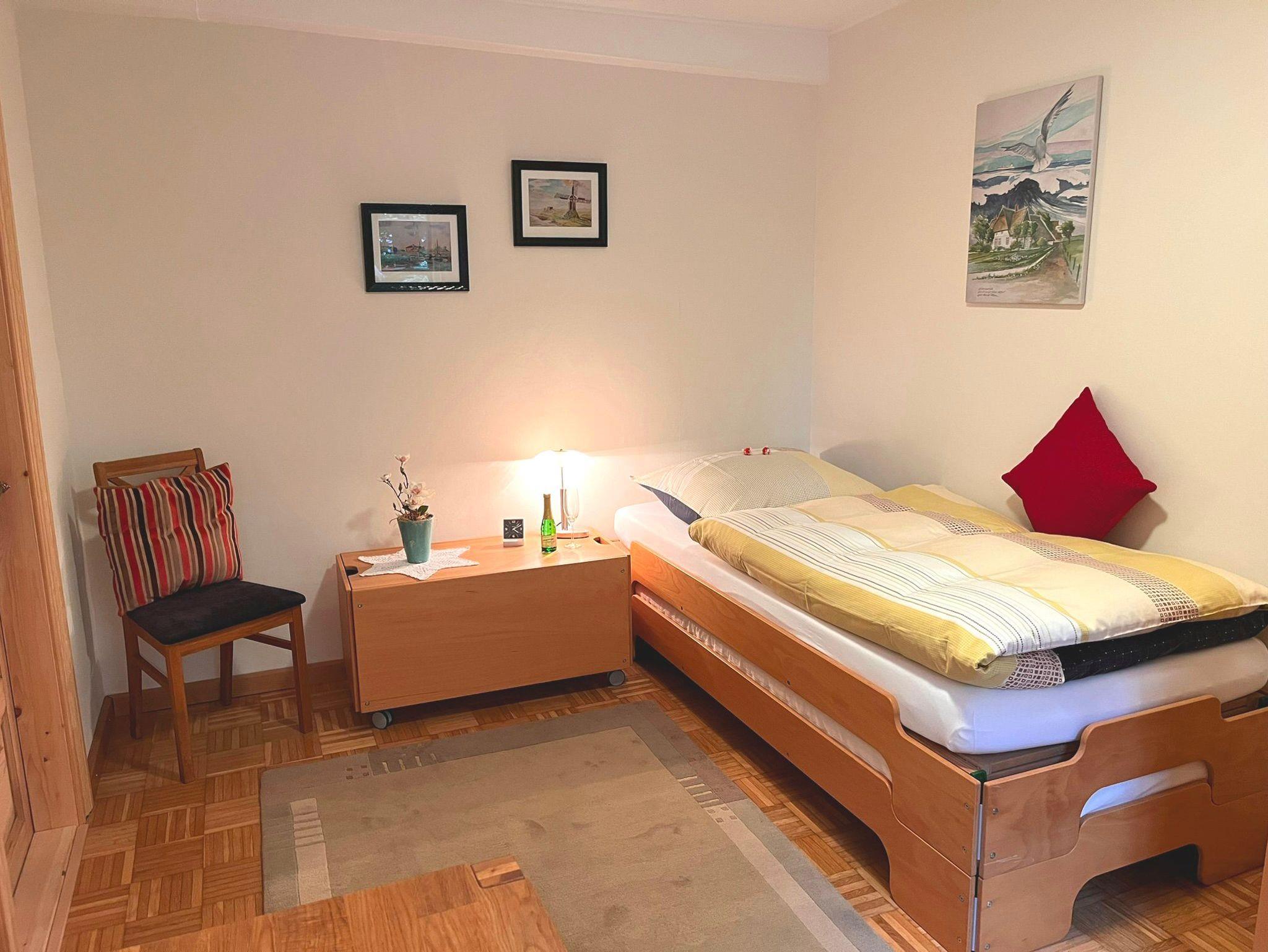 Kleines Zimmer: Das Einzelzimmer lässt sich problemlos in ein Doppelzimmer umwandeln (stabile Design-Stapelbetten 90 x 200), sodass 2 Personen hier bequem schlafen können. Es gibt einen Nachttisch mit Leselampe, einem zweitürigen Kleiderschrank und einem kleinen Tisch mit Stuhl. In allen Räumen gibt es Internetzugang mit WLAN-Verbindung. Zudem besteht die Möglichkeit, das Internet über LAN-Steckdosen zu nutzen.