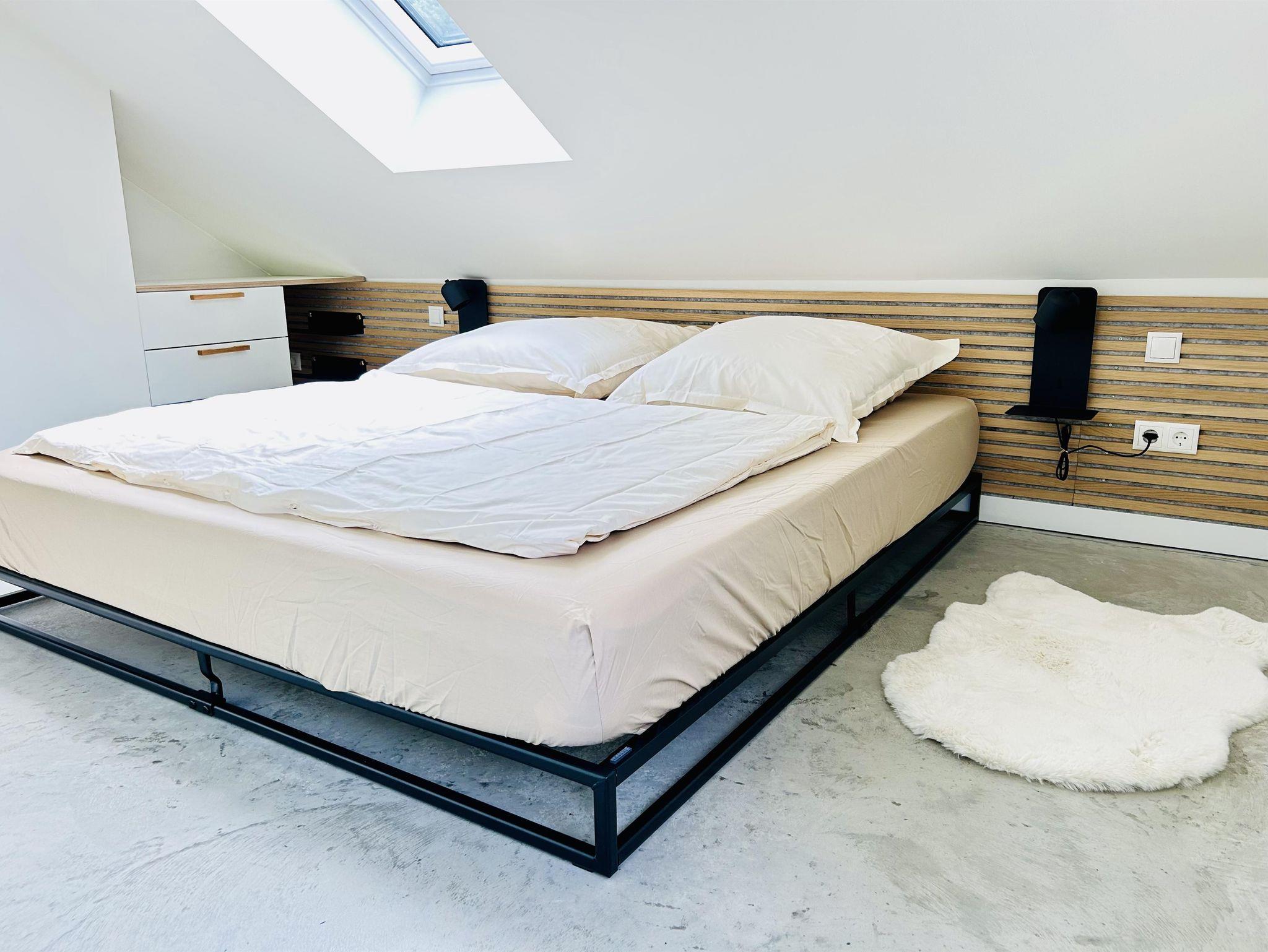 Das separate Schlafzimmer bietet ein komfortables 2 × 2 Meter großes Bett für erholsame Nächte unter dem Dachfenster sowie viel Stauraum im begehbaren Kleiderschrank. Das moderne Tageslichtbad ist mit einer großzügigen Dusche ausgestattet – perfekt zur Erholung nach Wanderungen oder Radtouren. Eine Waschmaschine steht ebenfalls zur Verfügung.