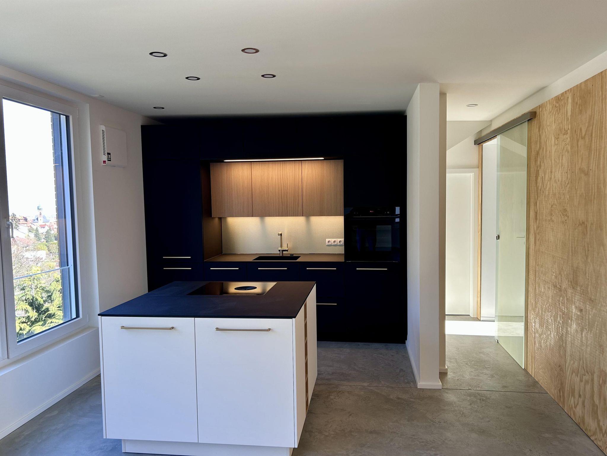Der offene Wohn- und Essbereich mit integrierter Küche ist das Herzstück der Wohnung. Große Fensterflächen sorgen für viel Licht und eröffnen den Blick über den Ort. Die moderne Küche mit Kochinsel ist voll ausgestattet. Der Esstisch bietet bequem Platz für bis zu sechs Personen. Im Wohnbereich lädt ein gemütliches Sofa zum Entspannen ein, das bei Bedarf auch als Schlafsofa für zwei Personen genutzt werden kann. WLAN und TV stehen selbstverständlich zur Verfügung.
