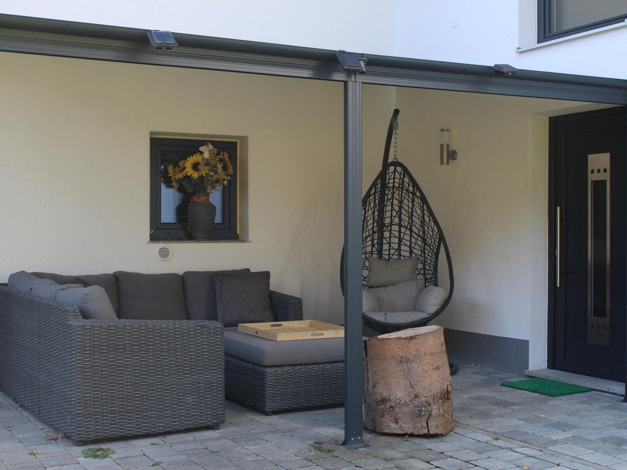 Zudem erwartet Sie ein großes, helles Badezimmer mit Dusche, eine Terrasse mit gemütlicher Sitzecke sowie für die kleinen Gäste ein Spielgarten mit Kletterturm, Schaukel und großem Trampolin.