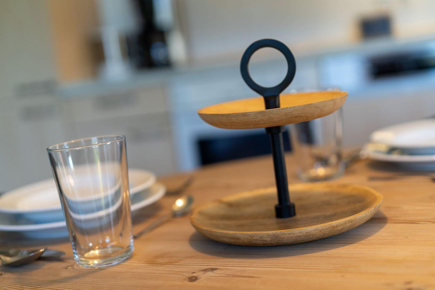 Der gemütliche Wohnbereich verfügt über ein bequemes Sofa, einen Sessel, Flachbild-TV, Radio und CD-Player sowie WLAN. Der angrenzende Essbereich mit rundem Tisch eignet sich perfekt für gemeinsame Mahlzeiten oder Spieleabende. Die offen integrierte Küche ist voll ausgestattet mit Cerankochfeld, Backofen, Spülmaschine, Mikrowelle, Toaster, Kaffeemaschine und Kühlschrank mit Gefrierfach.