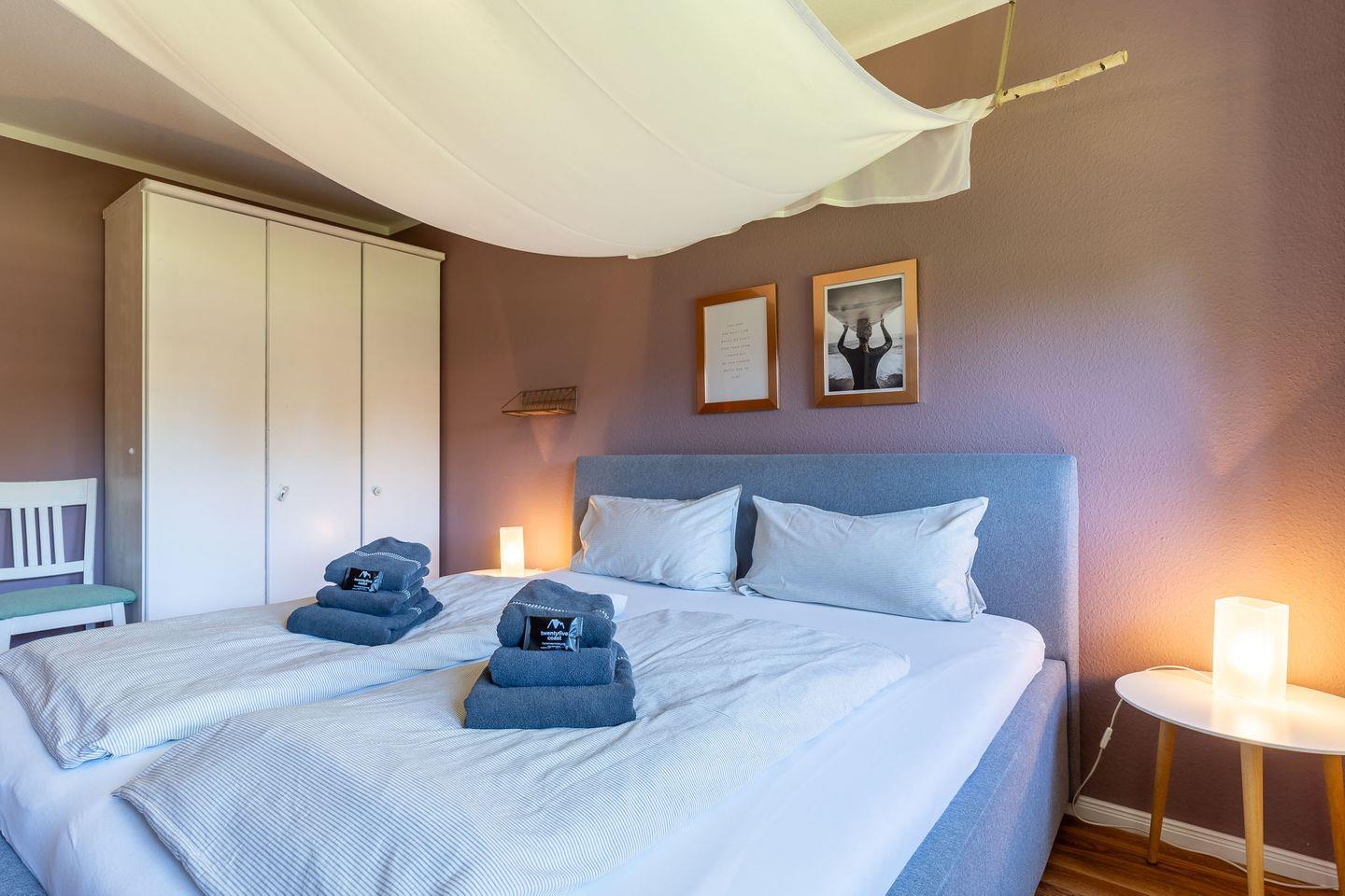 Im separaten Schlafzimmer erwartet Sie ein gemütliches Doppelbett (180x200 cm) mit synthetischer Bettdecke und Kissen. Das moderne Tageslichtbad bietet eine Dusche mit hohem Einstieg, WC, Föhn und ausreichend Ablagefläche.
