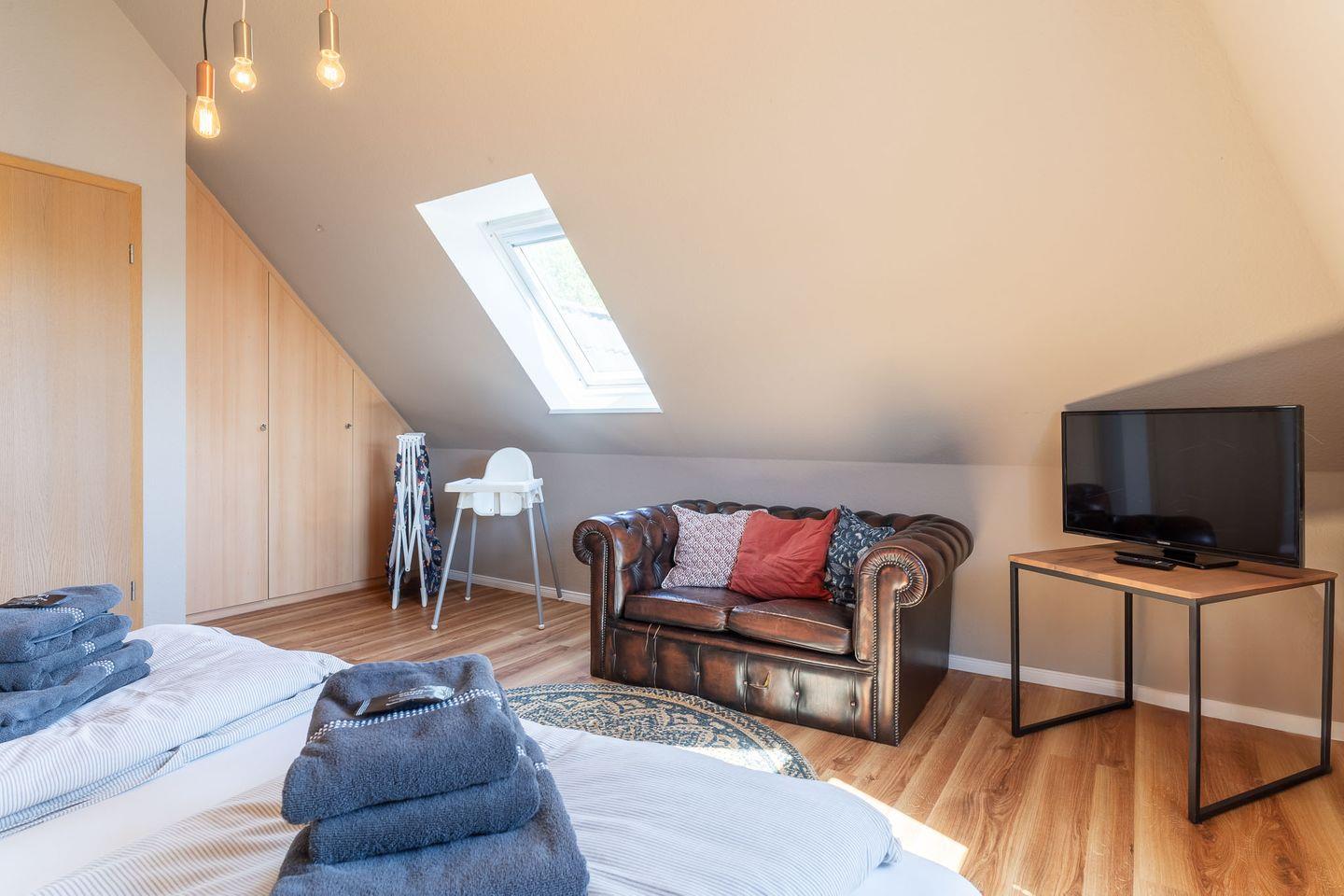 Die Ferienwohnung Möwe im 1. Obergeschoss (mit Staffelgeschoss) bietet auf 68 m² Platz für bis zu 4 Personen. Der gemütliche Wohnbereich mit Eckcouch, Sessel, Flachbild-TV, Radio und WLAN geht in einen Essplatz für 4 Personen über.