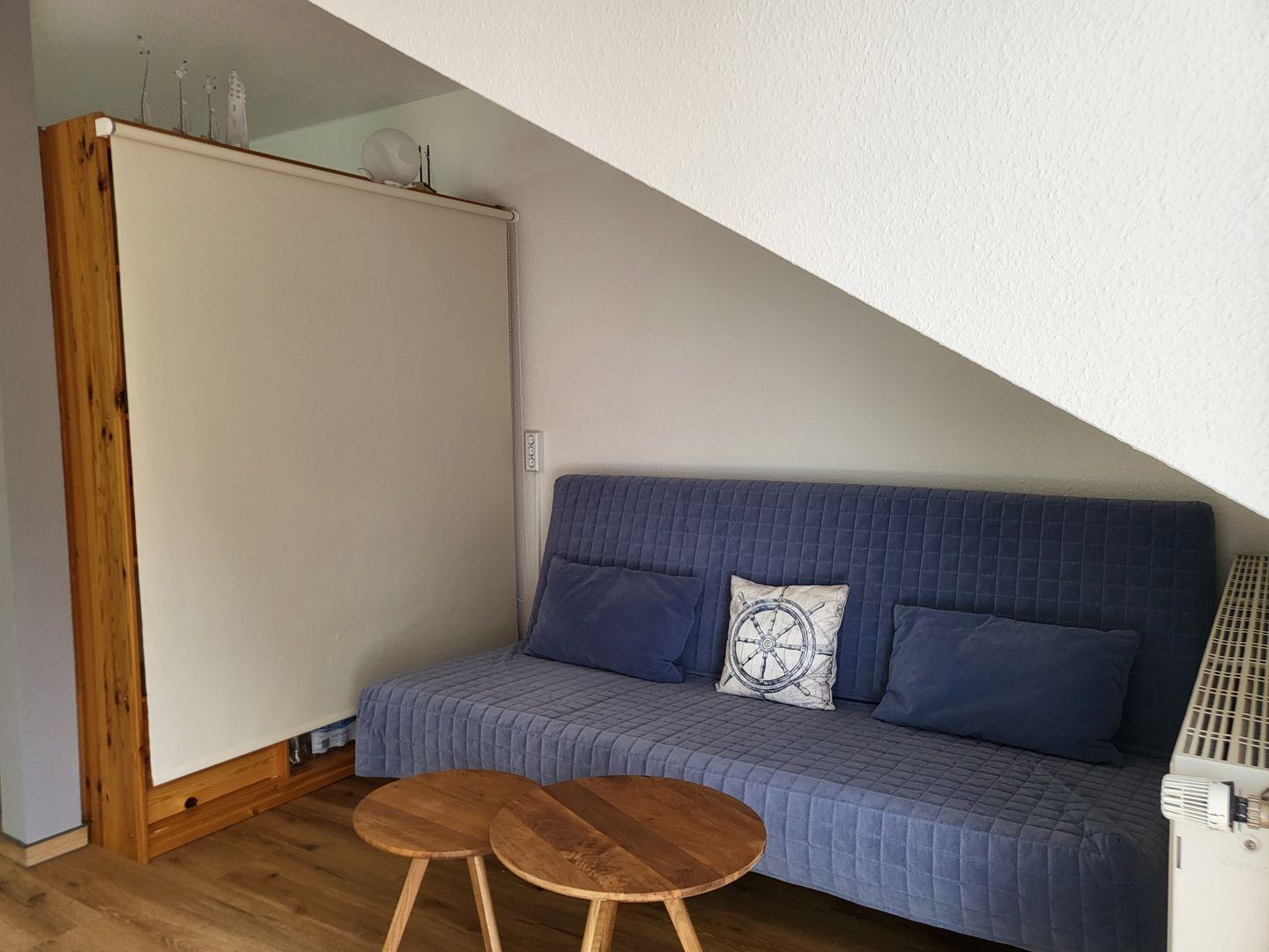Es steht ein Schlafzimmer mit hochwertigem Vinylboden sowie einem gemütlichen Bett (180x 200) und einem Kleiderschrank zur Verfügung. Für eine zusätzliche Schlafmöglichkeit sorgt eine Schlafcouch (140x 200) im Wohnzimmer durch eine Trennwand integriert.