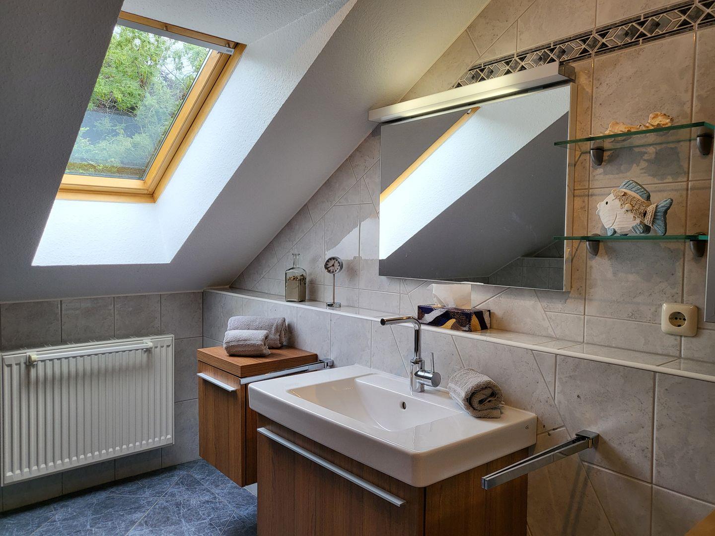 Das Badezimmer ist modern eingerichtet und bietet eine Dusche, WC und Waschtisch. Darüber hinaus ist ein Fenster vorhanden, das für ausreichend Tageslicht sorgt. Die gesamte Ferienwohnung ist allergikerfreundlich.