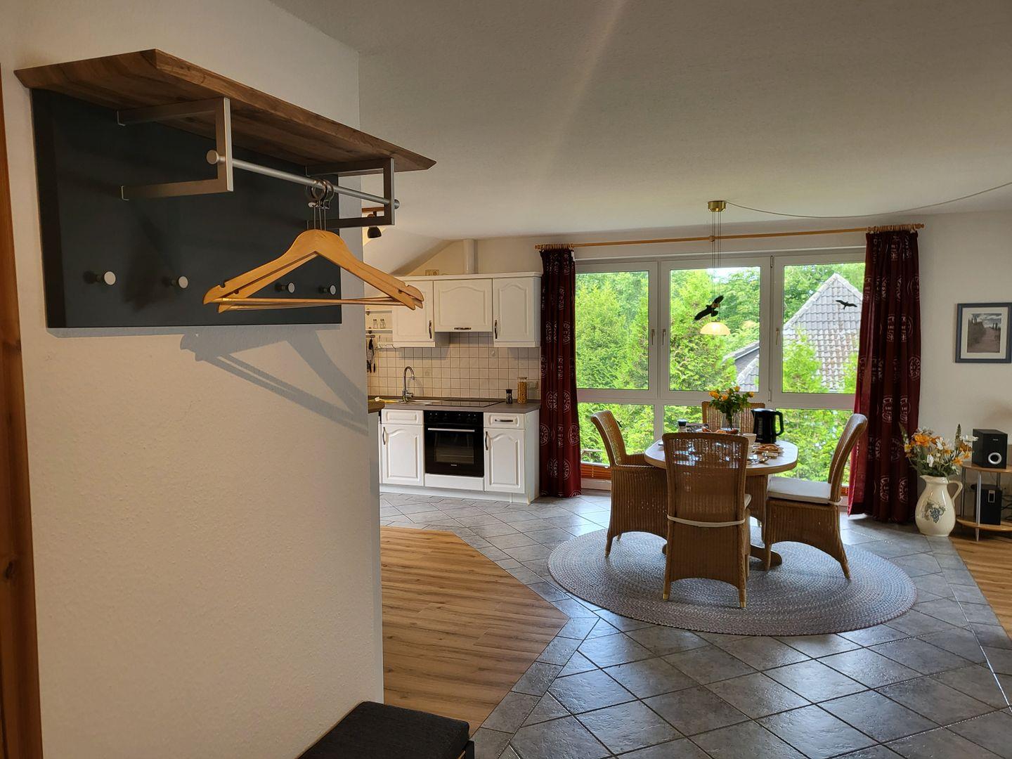 Im zweiten Stock gelegen, genießen Sie von hier aus einen angenehmen Ausblick mit großem Panoramafenster auf die Umgebung und können auf dem teilweise überdachten Balkon entspannen, während Sie die frische Meeresbrise genießen. Die Ferienwohnung ist mit einer modernen und offenen Küche ausgestattet, die über alle erforderlichen Küchenutensilien verfügt. Ein Ceranherd, Backofen, Geschirrspüler, Kühlschrank (mit einem Gefrierfach), Wasserkocher sowie eine Filtekaffee -und eine Senseopadmaschine stehen bereit, um Ihnen den Aufenthalt so angenehm wie möglich zu gestalten.