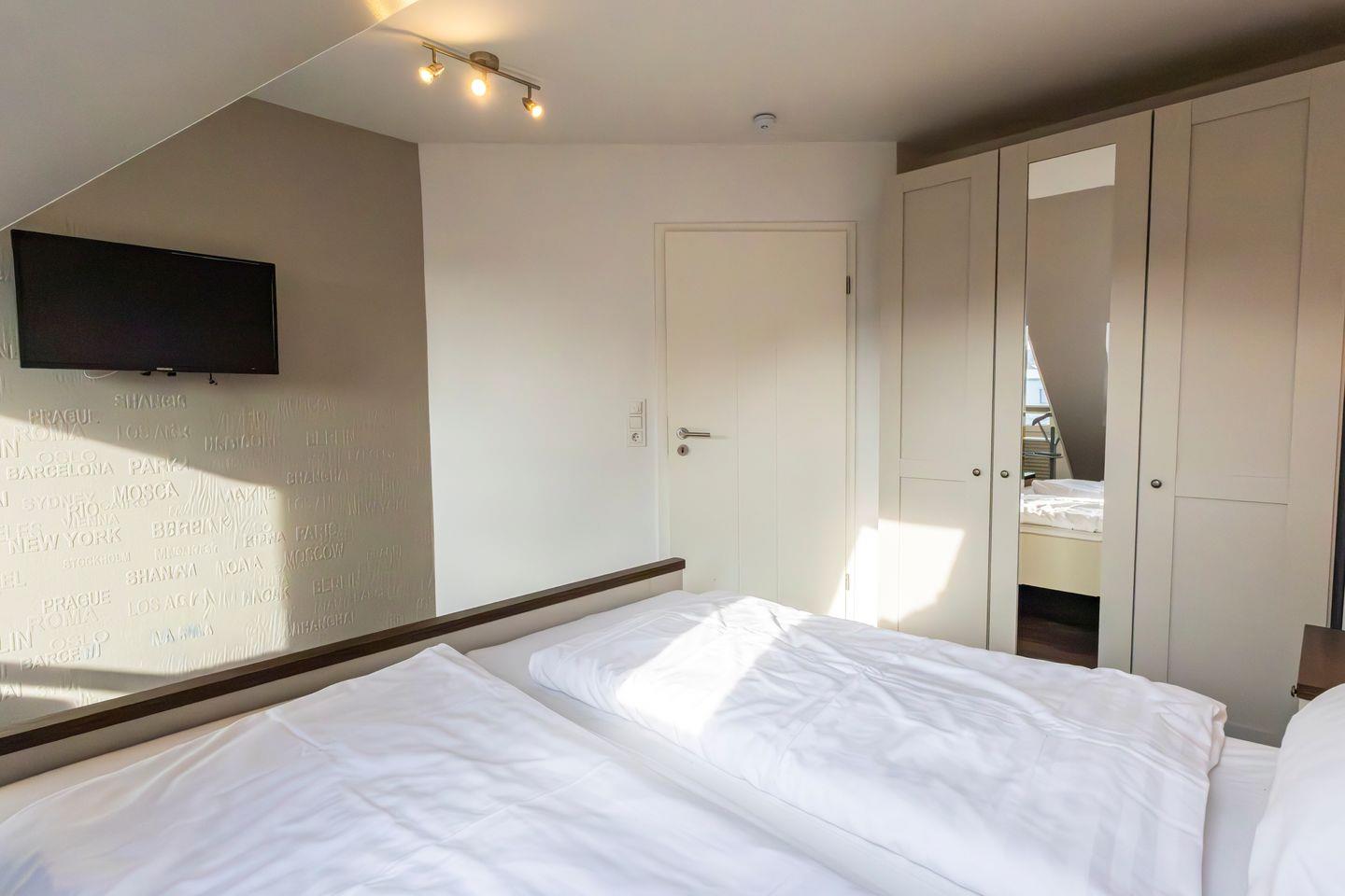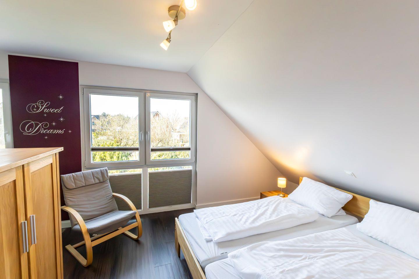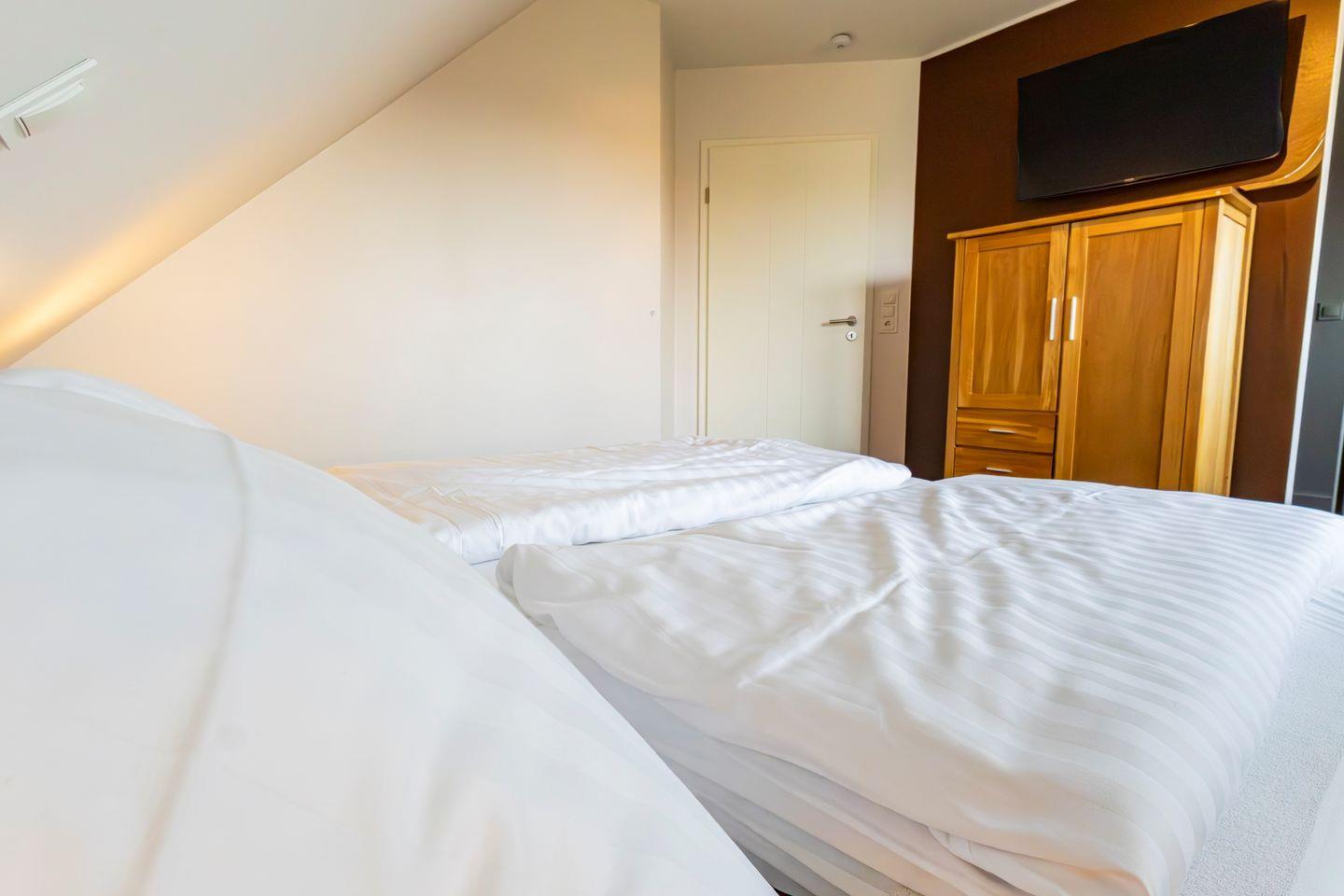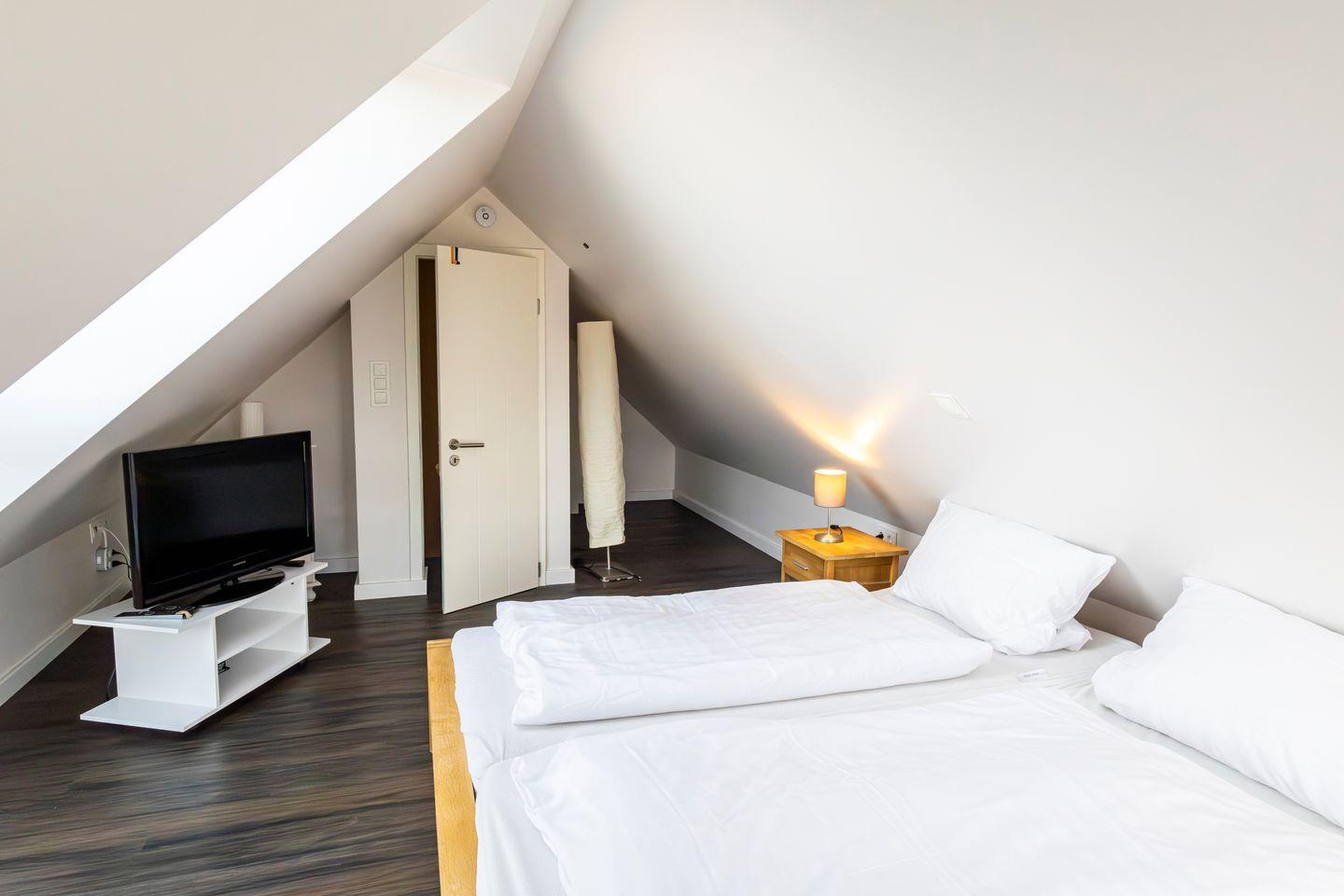 Dachgeschoss: ein Schlafzimmer mit Doppelbett (180x200cm- Einzelmatratzen) und TV