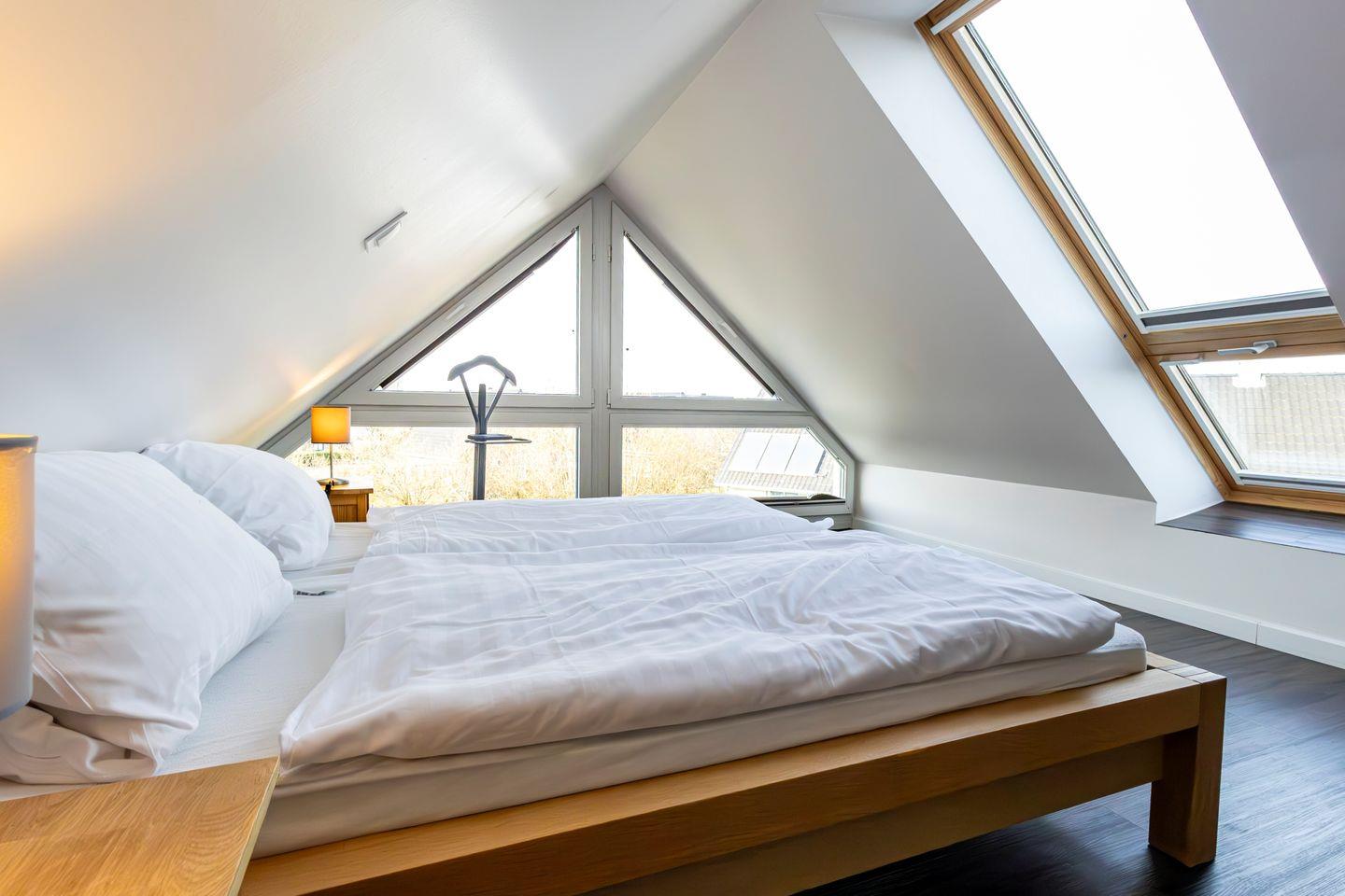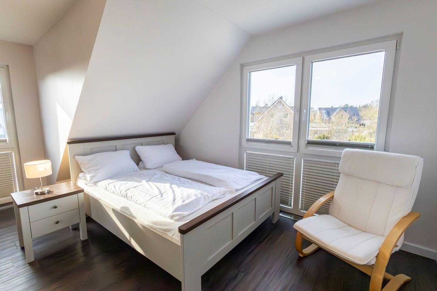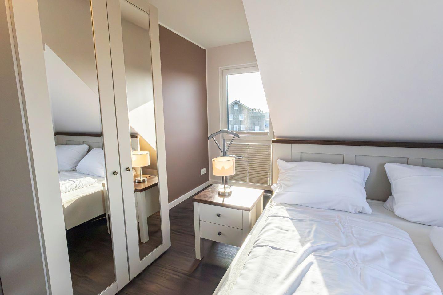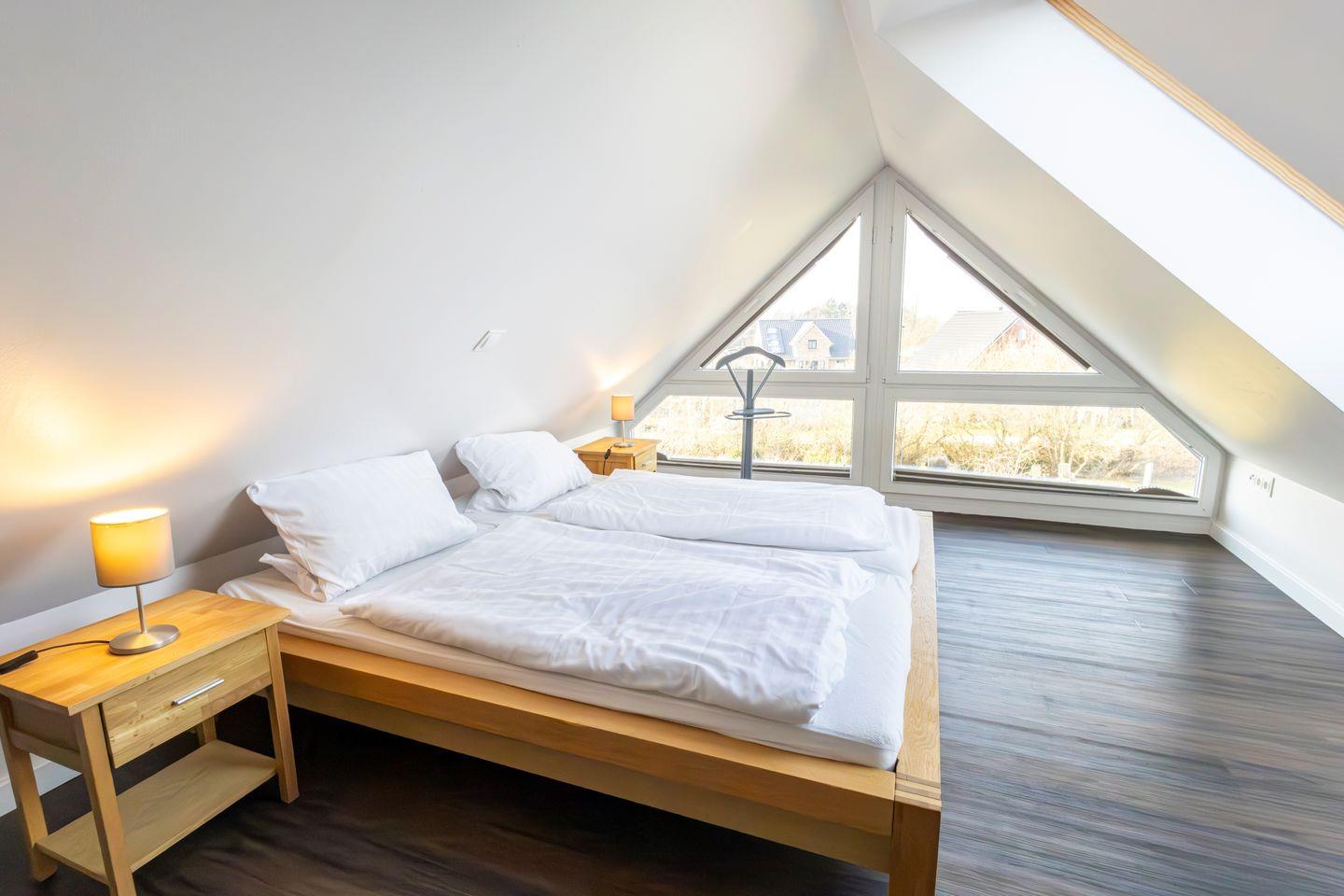 Dachgeschoss: ein Schlafzimmer mit Doppelbett (180x200cm- Einzelmatratzen) und TV