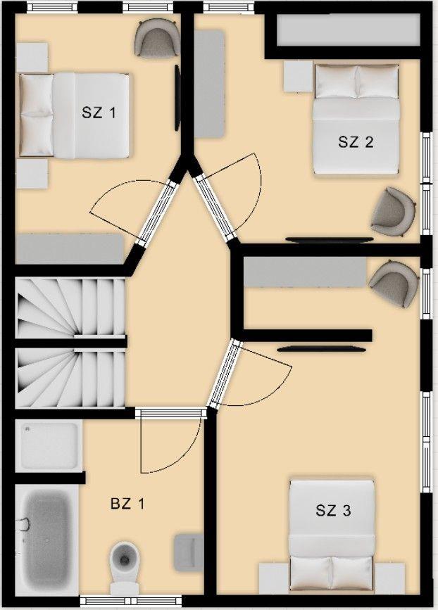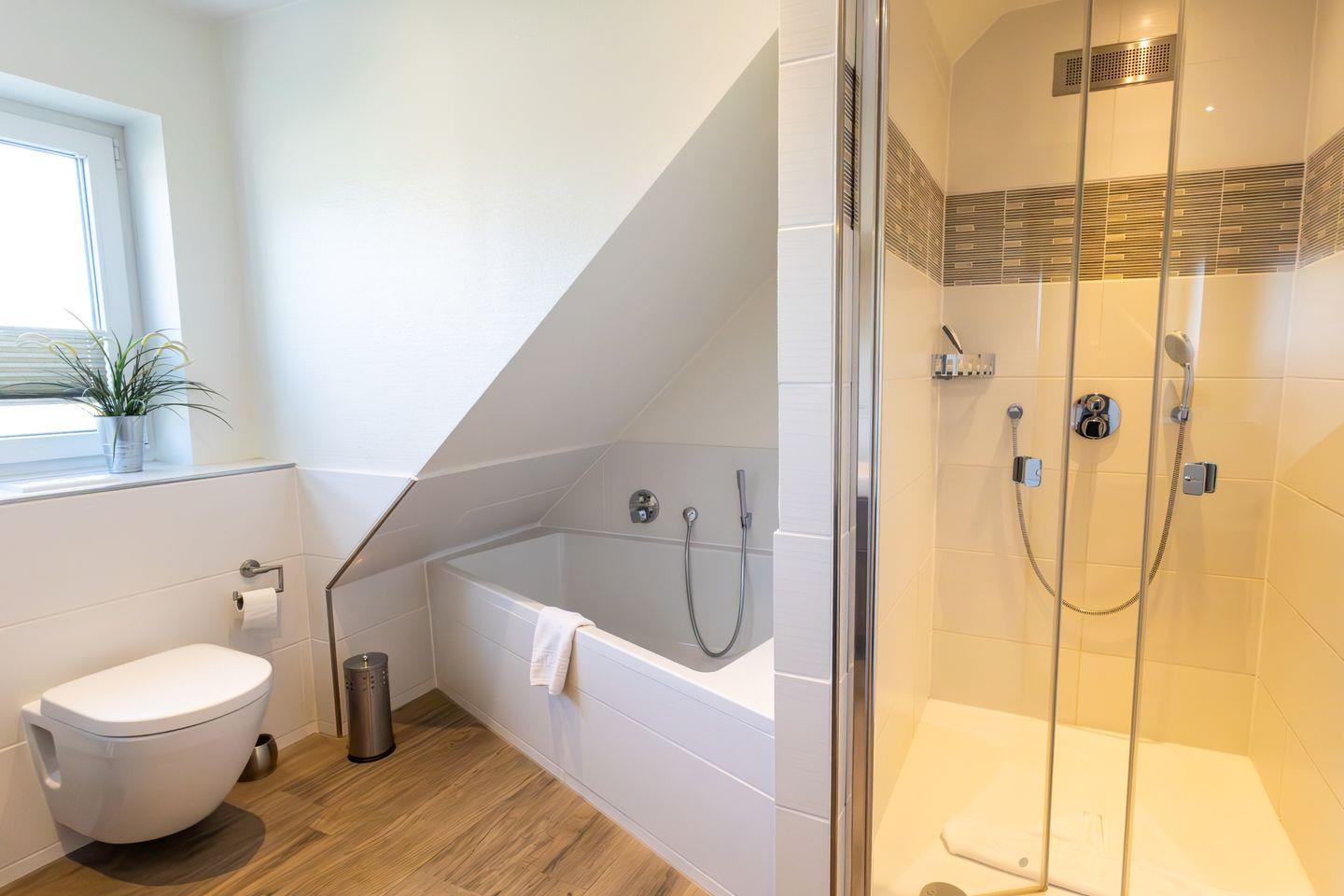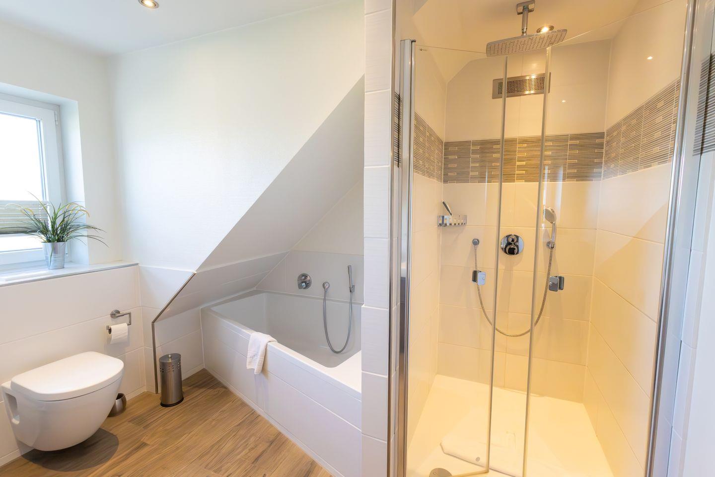 Obergeschoss: ein Schlafzimmer mit Doppelbett (180x200cm-Einzelmatratzen) , ein Schlafzimmer mit Doppelbett (180x200 cm- Einzelmatratzen), ein Duschbad/WC mit Badewanne, ein Schlafzimmer mit Doppelbett (160x200cm). Alle Schlafzimmer sind mit einem TV ausgestattet