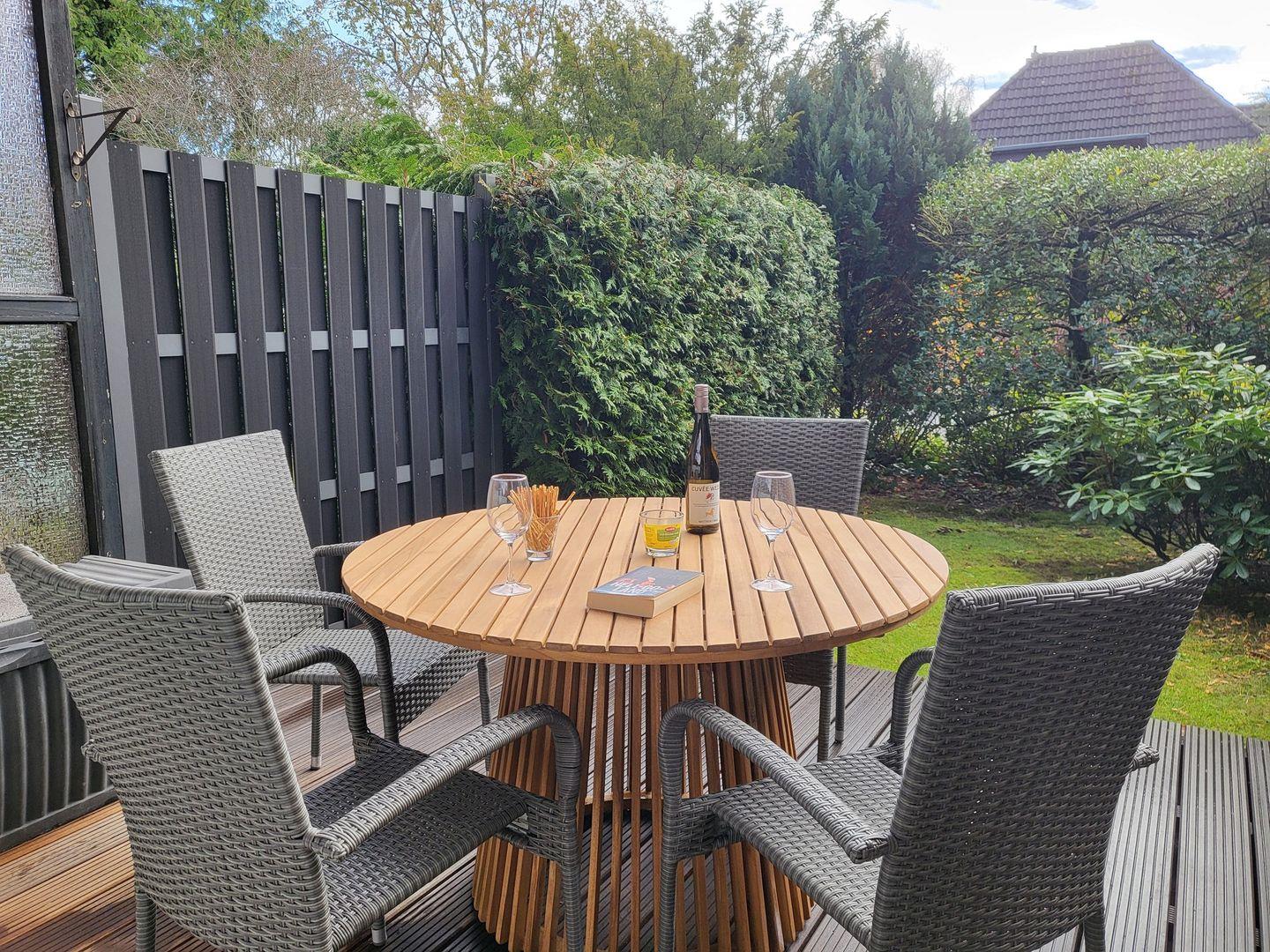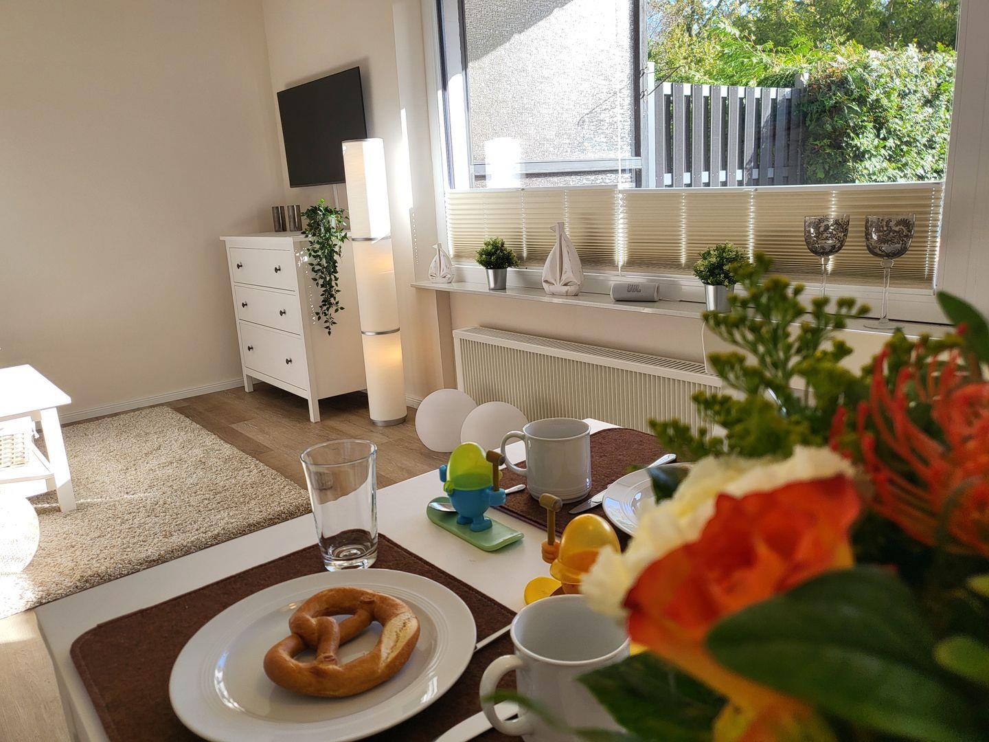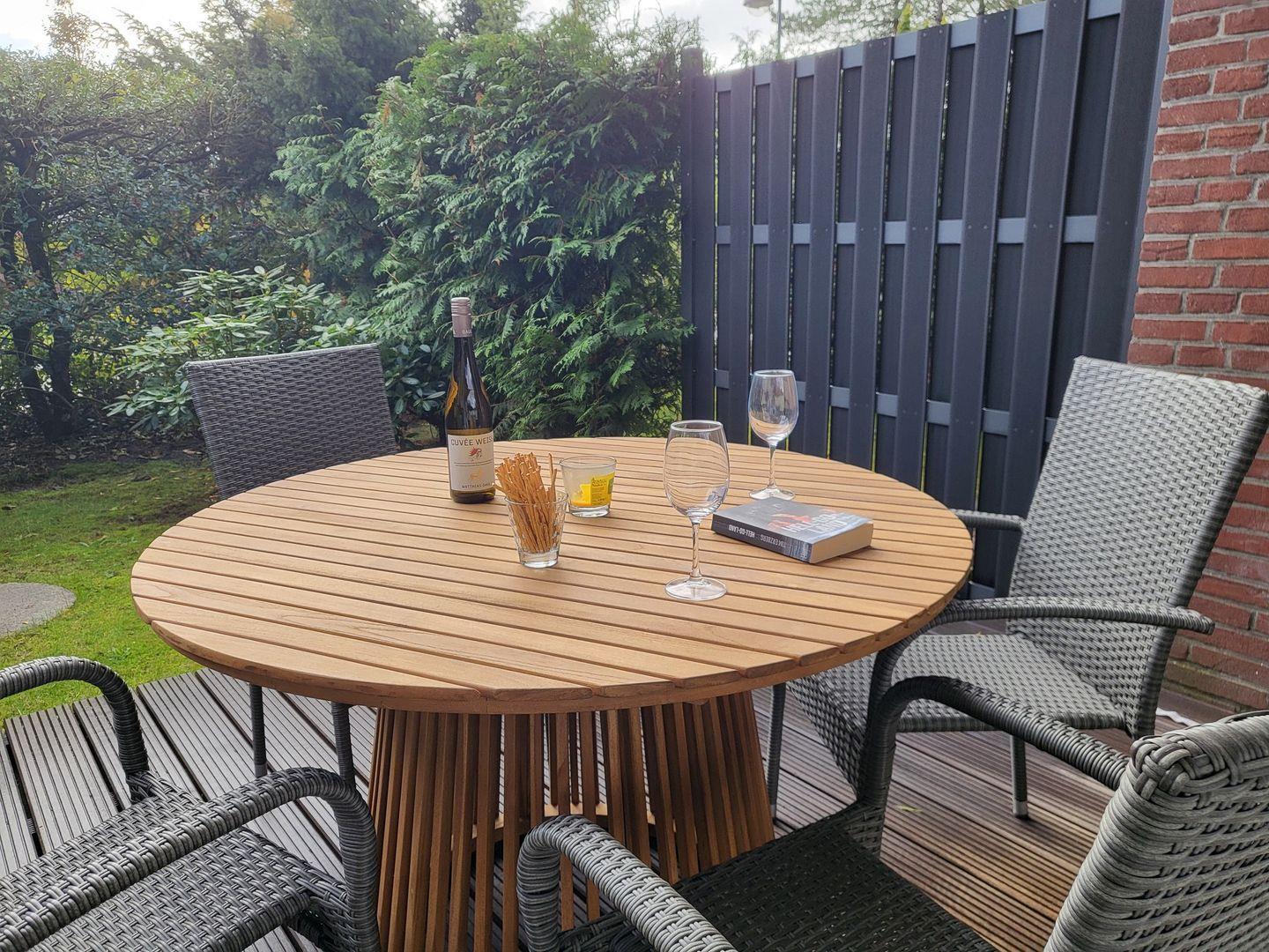 Direkt angeschlossen an das Wohnzimmer befindet sich die eigene Terrasse mit Gartenmöbeln. Von dort aus haben Sie einen schönen Gartenblick und können entspannte Stunden im Freien genießen.