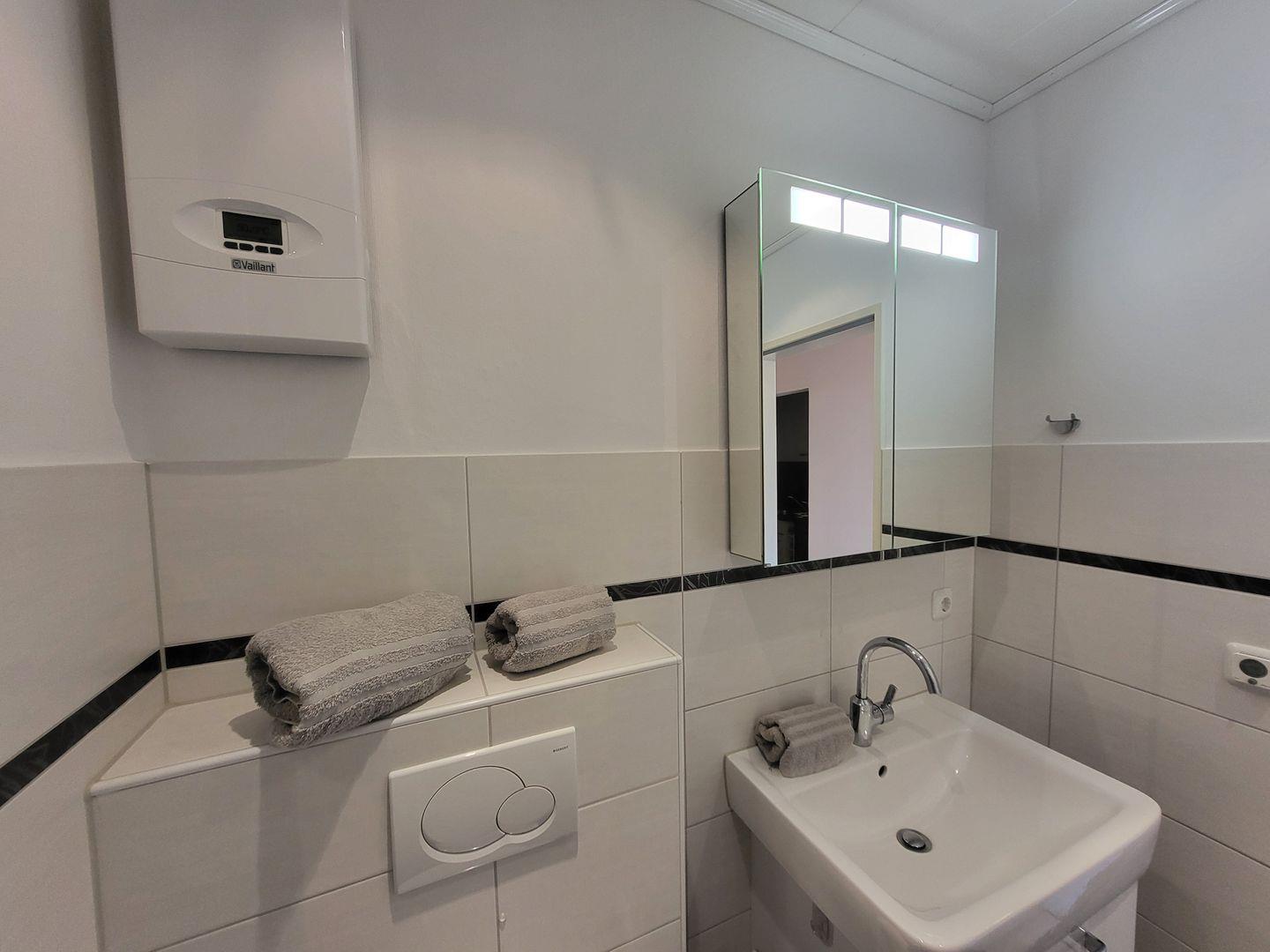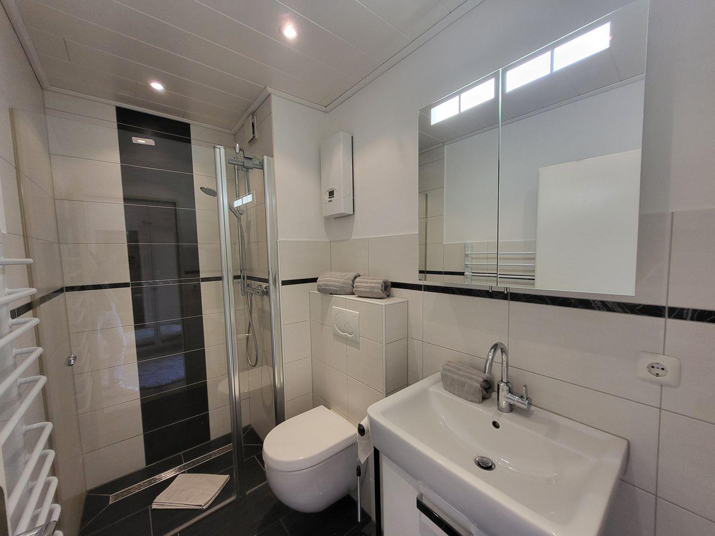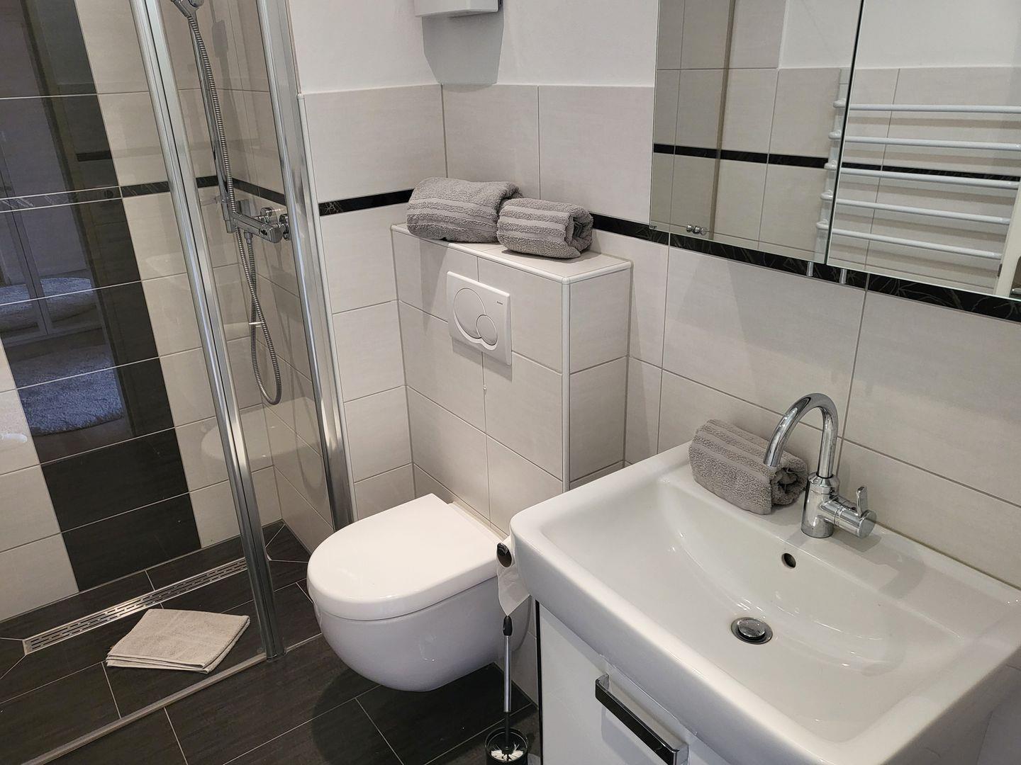 Das Badezimmer der Ferienwohnung ist mit einer bodengleichen Dusche, einem Waschbecken, WC, Spiegel und Stauraum funktional und zeitgemäß eingerichtet. In sämtlichen Wohnbereichen ist für Sichtschutz gesorgt.