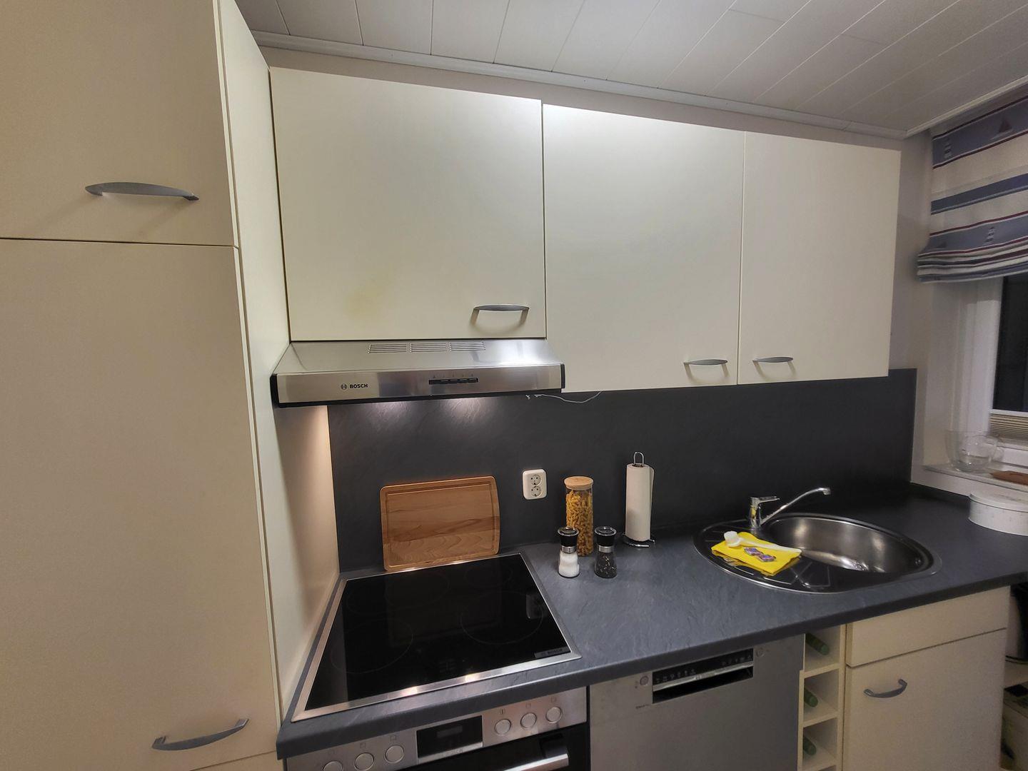 Die Küche ist voll ausgestattet und erfüllt alle Anforderungen für eine komfortable Selbstversorgung. Für unbeschwertes Kochen stehen ein Induktionsherd, Backofen, Mikrowelle, Geschirrspüler, Kühlschrank mit Gefrierfach und zahlreiche Küchenutensilien bereit. Wasserkocher, Kaffeemaschine und Toaster ergänzen das moderne Küchenangebot.