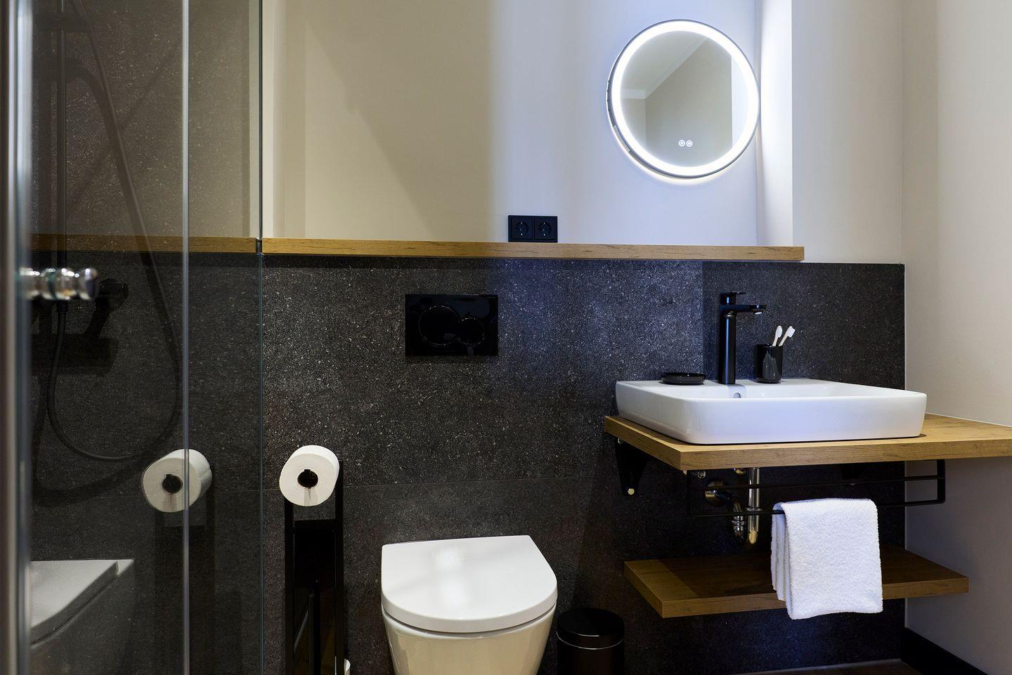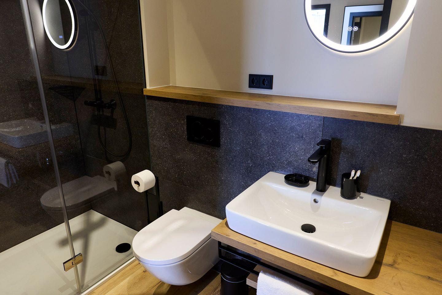 Ein möblierter Balkon mit West-Ausrichtung bietet Sonne bis in den Abend hinein. Die zwei Schlafzimmer sind mit je einem komfortablen Doppelbett, Schrank und Smart TV ausgestattet. Zudem verfügt das Apartment über ein modernes, mit anthrazitfarbenen Natursteinfliesen gestaltetes Badezimmer und ein separates WC.
